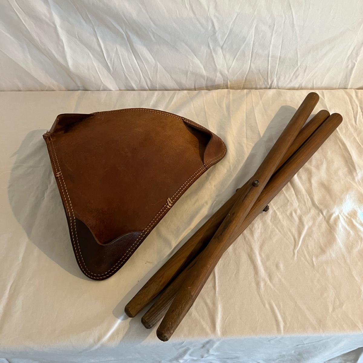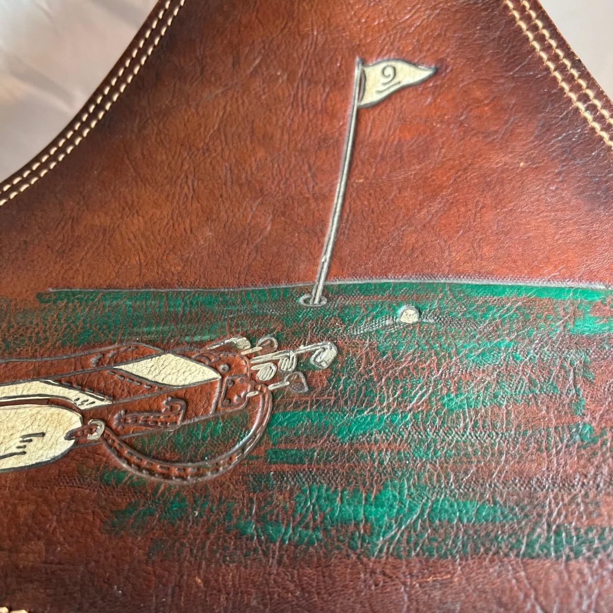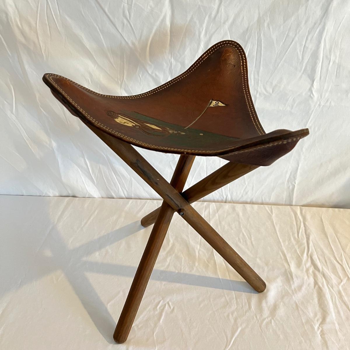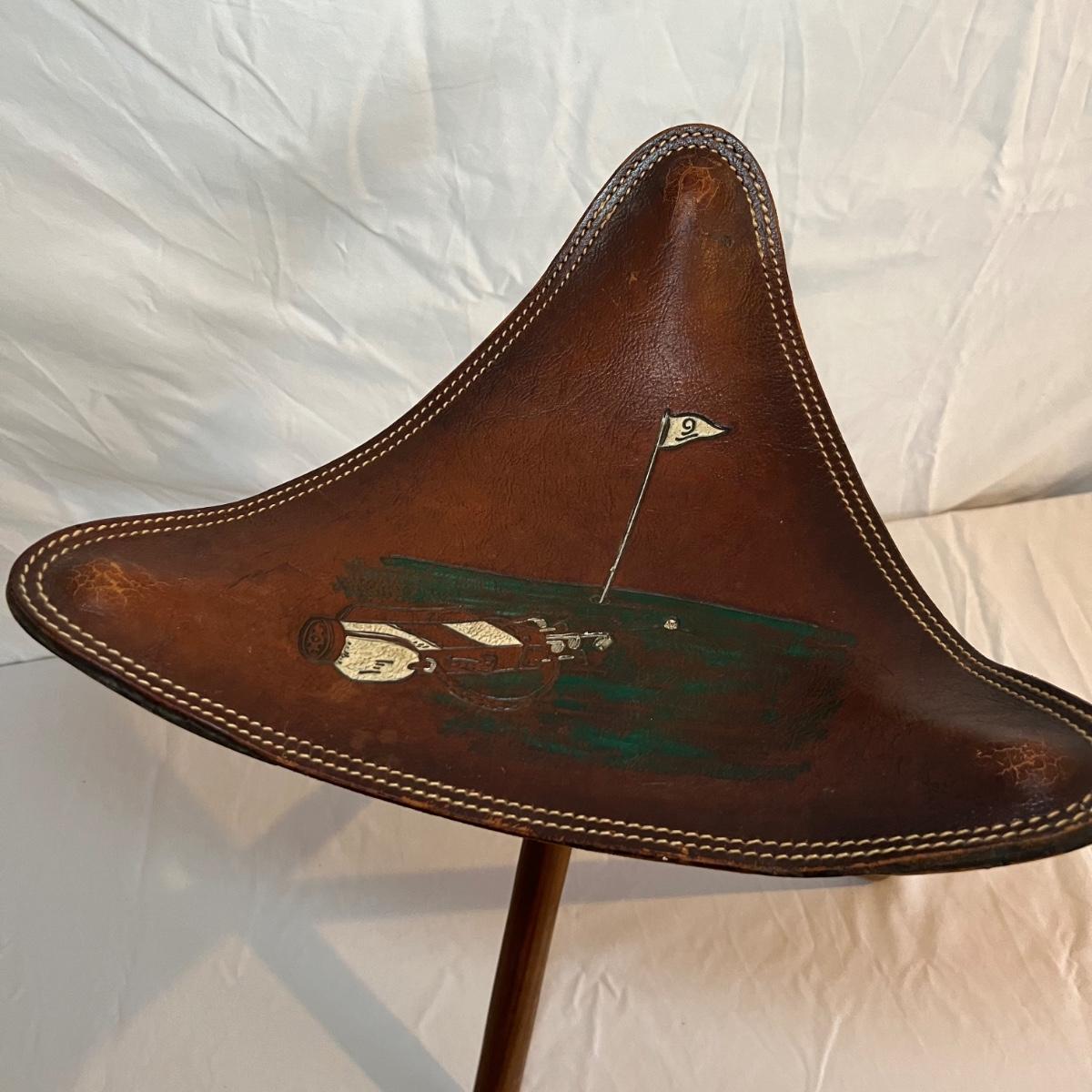 This vintage tripod/folding stool has what appears to be a hand tooled leather saddle seat with a golf tee/hole scene painted on the seat. Legs are wood. Some of the stitching has come loose, see images.