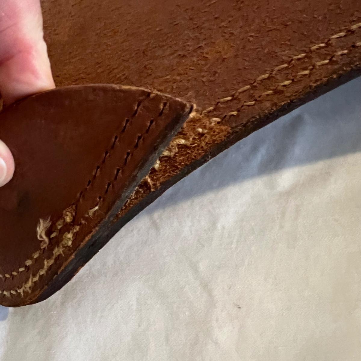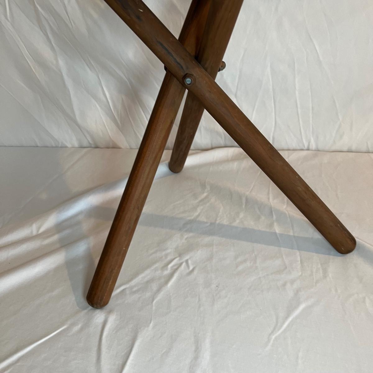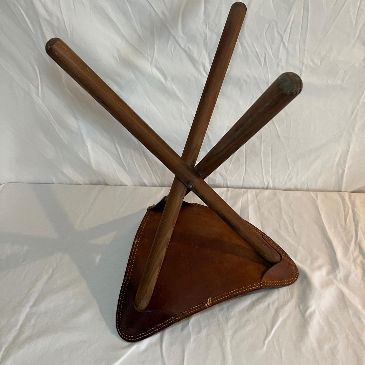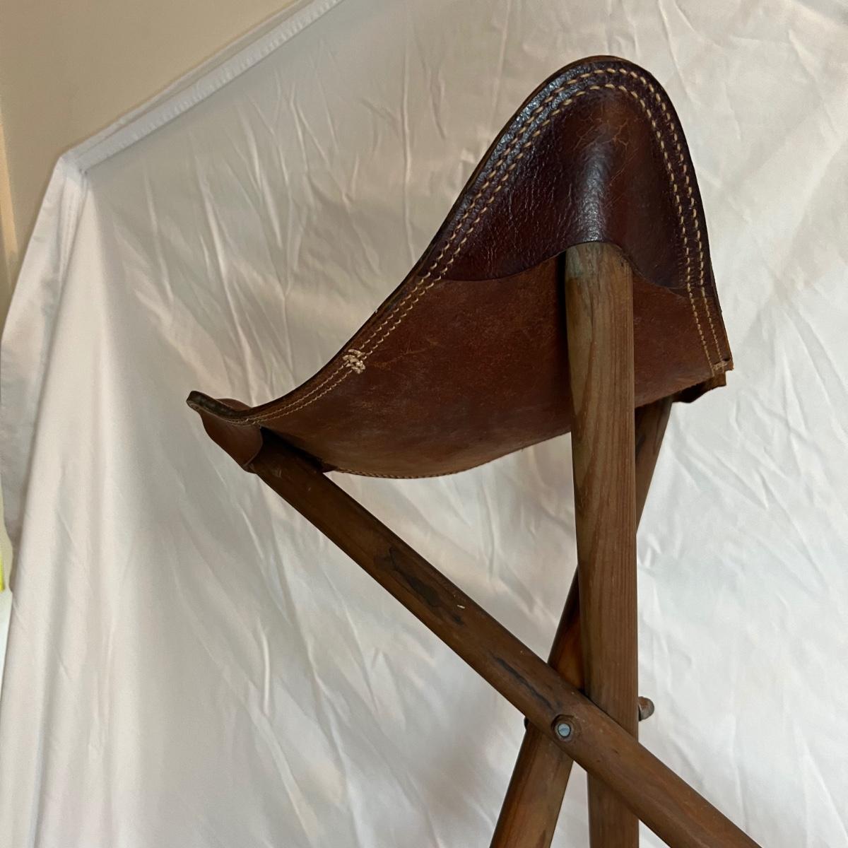 This vintage tripod/folding stool has what appears to be a hand tooled leather saddle seat with a golf tee/hole scene painted on the seat. Legs are wood. Some of the stitching has come loose, see images.