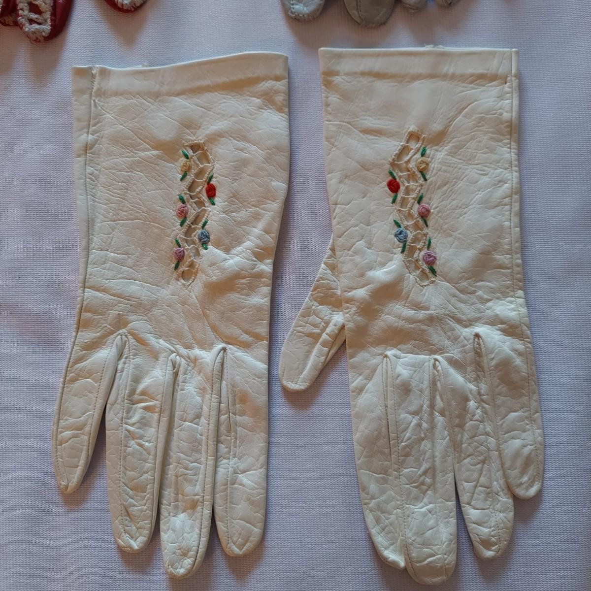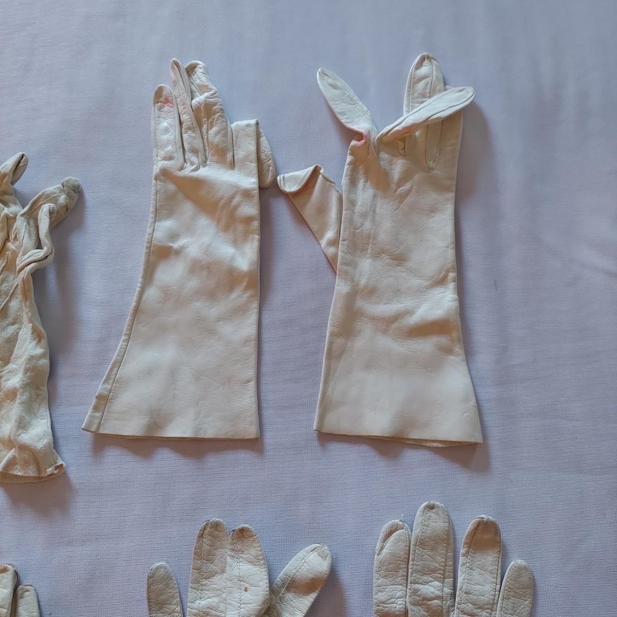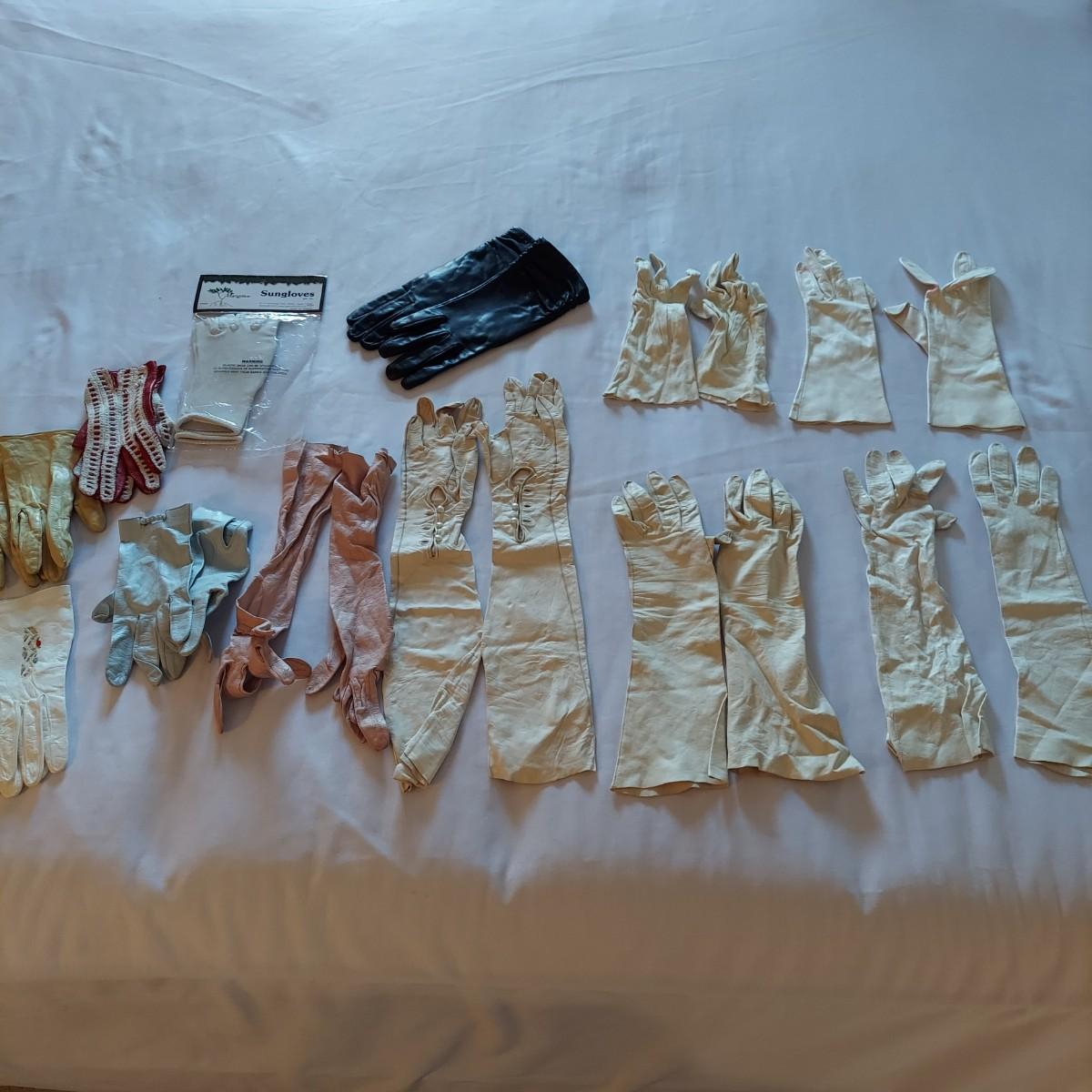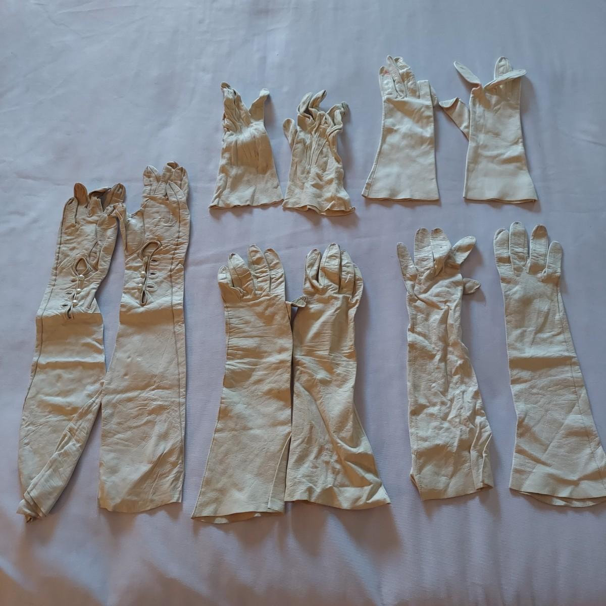 Twelve pairs of vintage leather gloves. Some have surface stains, especially on the white pairs. Shipping available