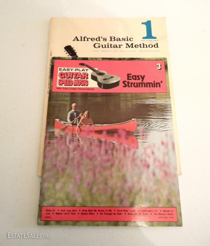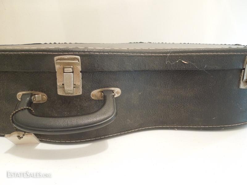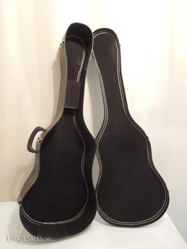 Fits acoustic guitar. Comes with two vintage guitar method books. Metal latches are pitting. No scratches or broken leather. Guitar being sold separately.