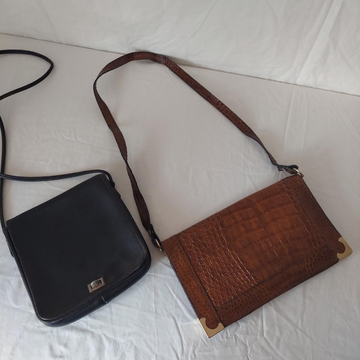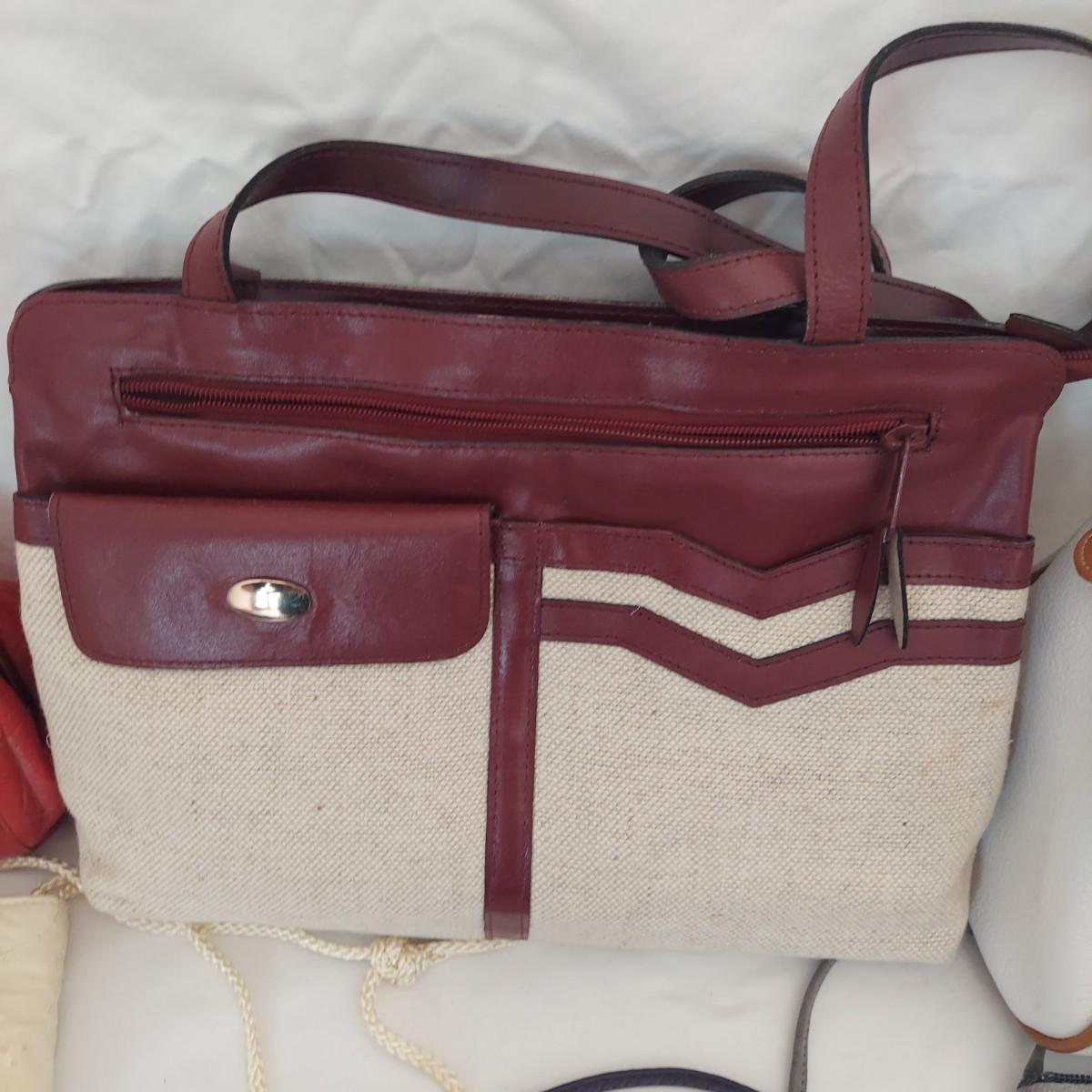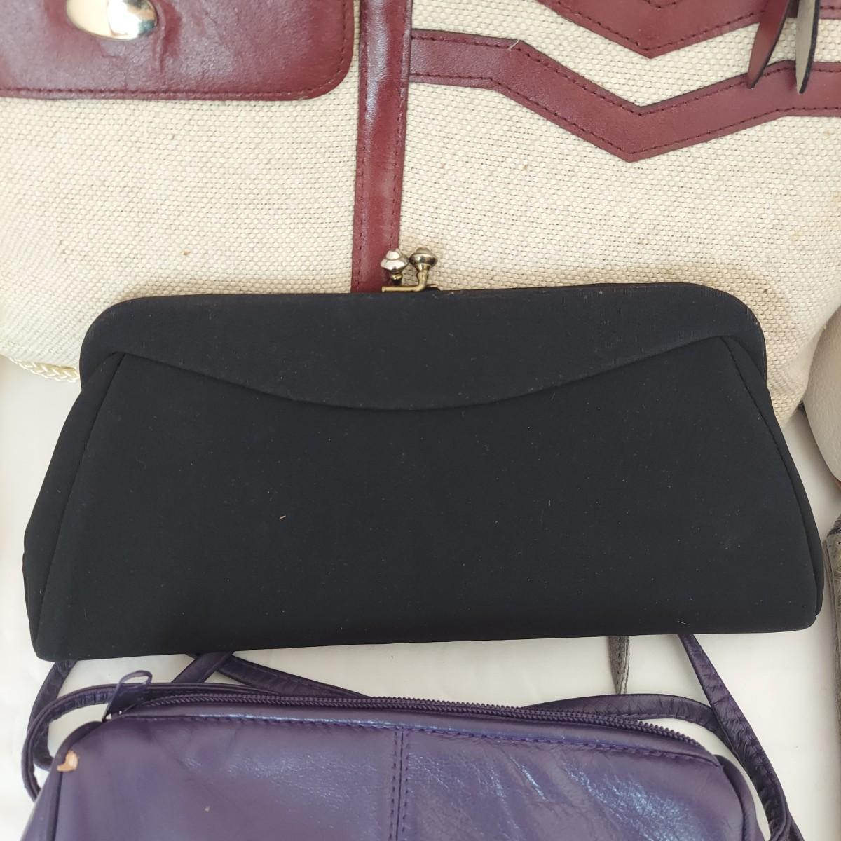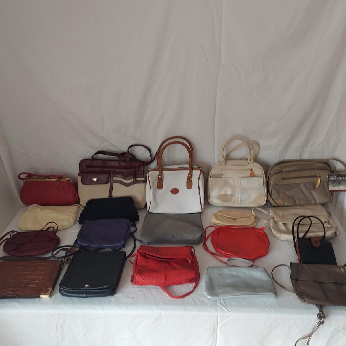 Lot includes 15+ vintage purses. Many are leather. The brown and white top handle bag measures 10" x 6” x 9"H not including handles. Please see photos for brands, materials and other details. Shipping available