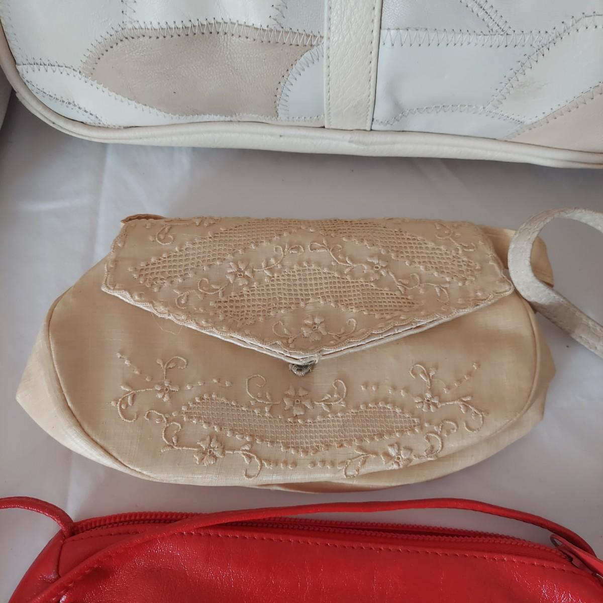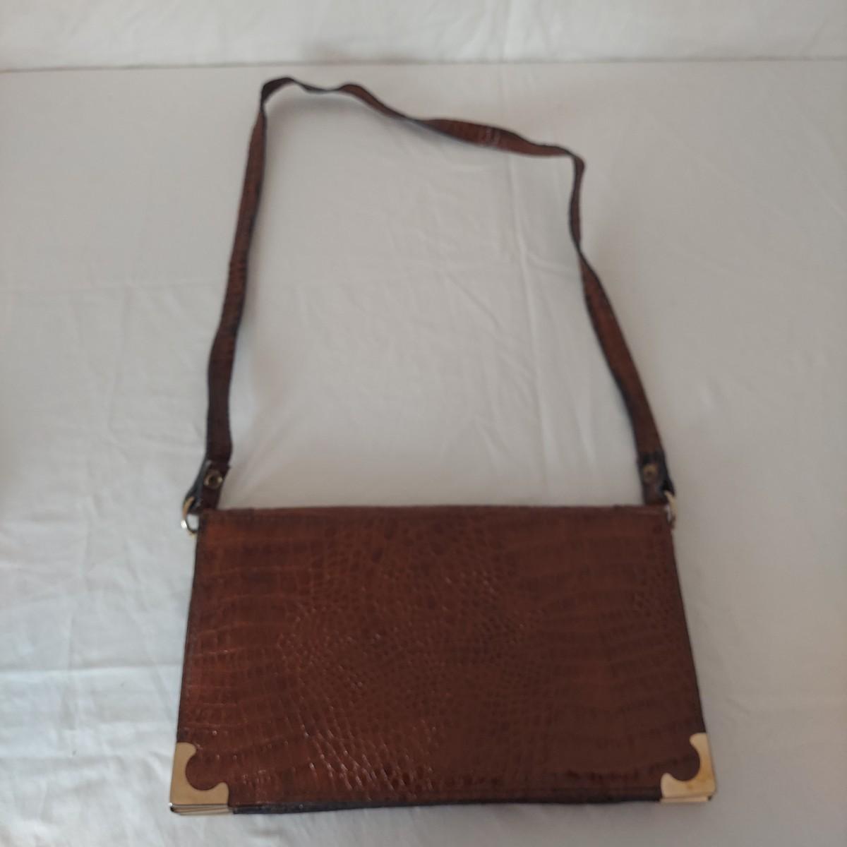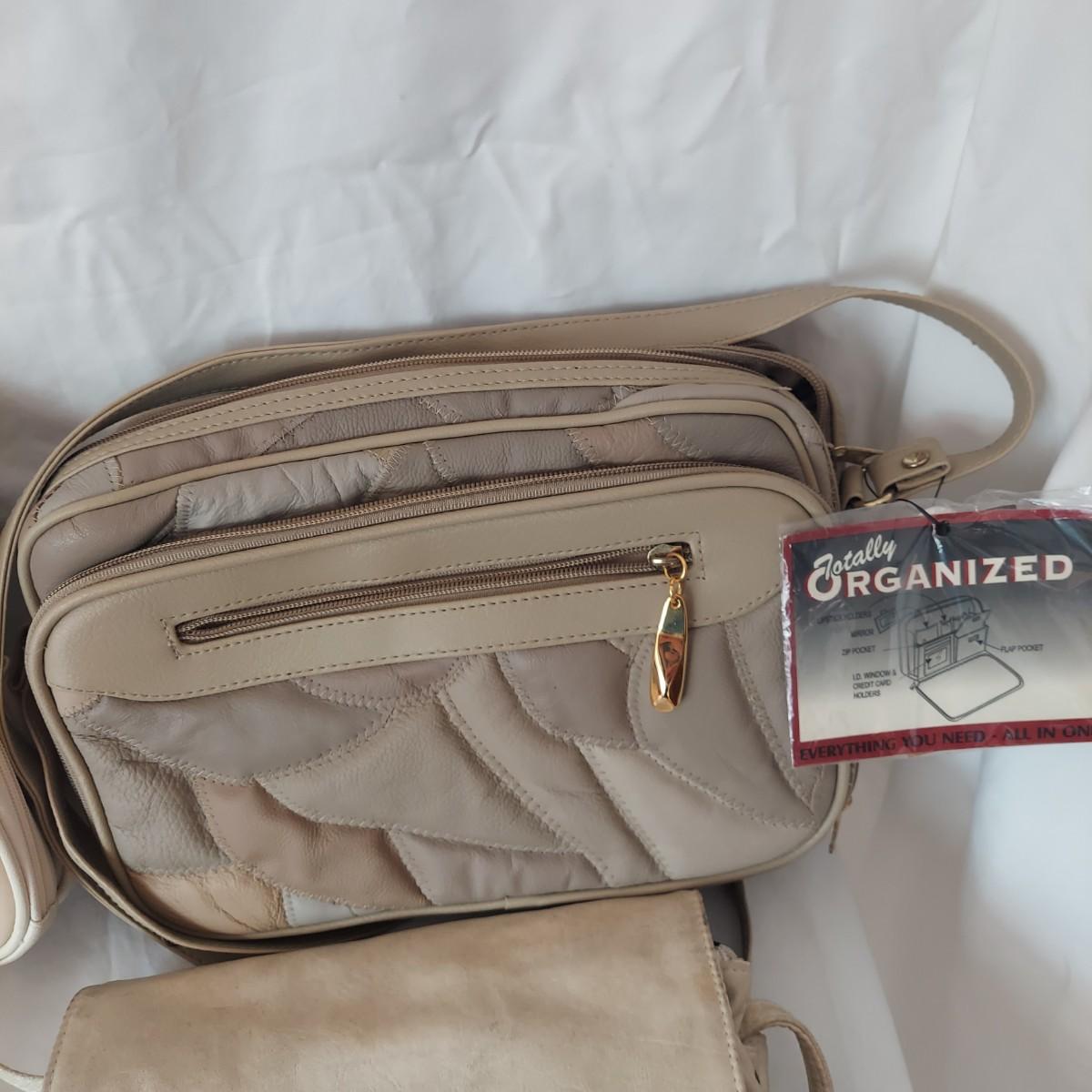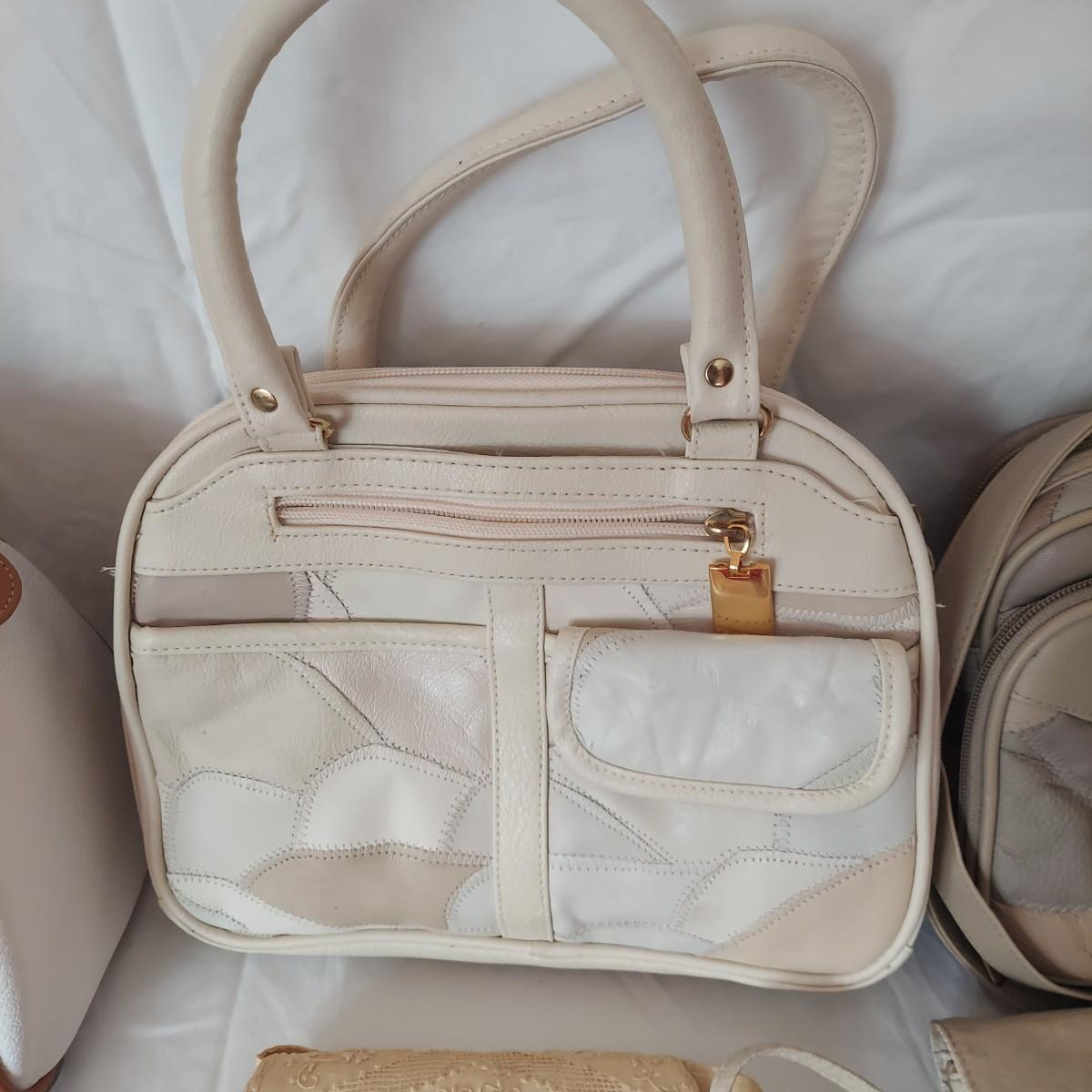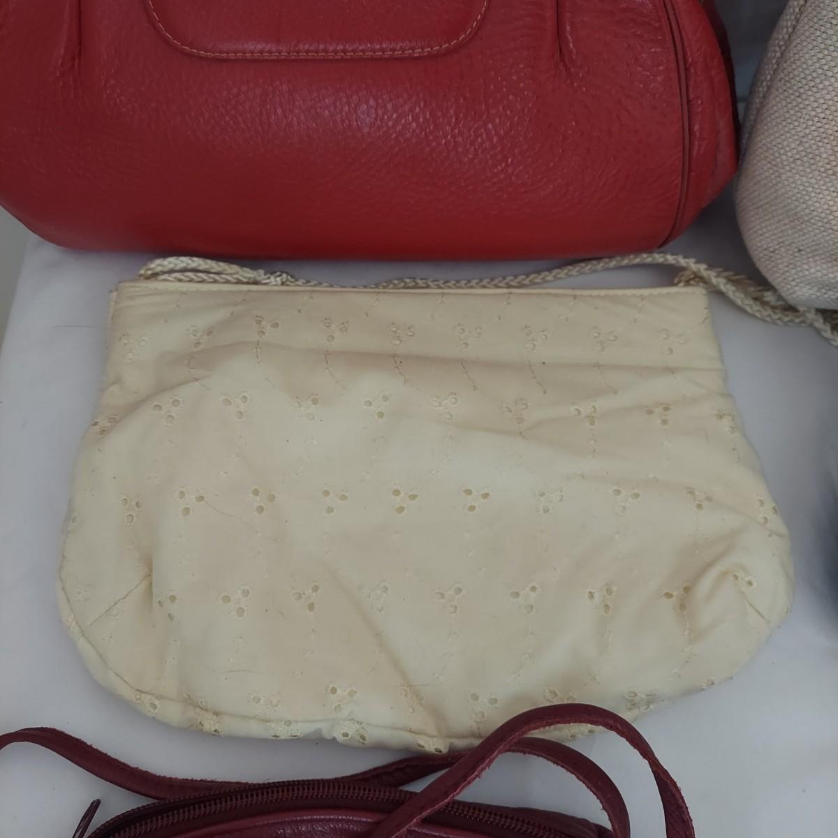 Lot includes 15+ vintage purses. Many are leather. The brown and white top handle bag measures 10" x 6” x 9"H not including handles. Please see photos for brands, materials and other details. Shipping available