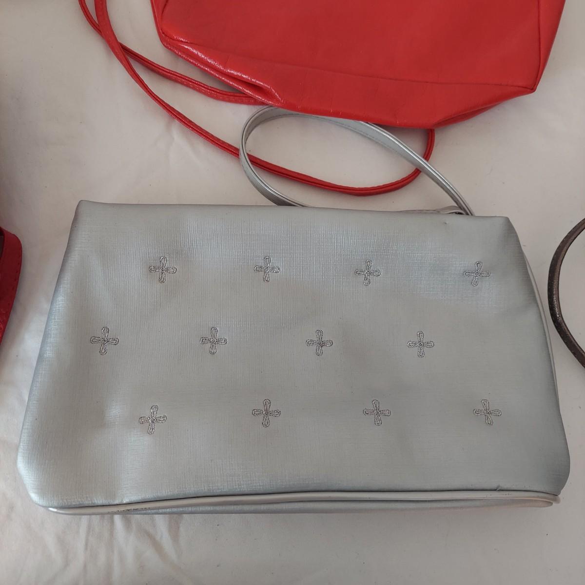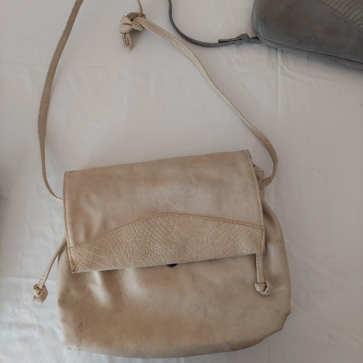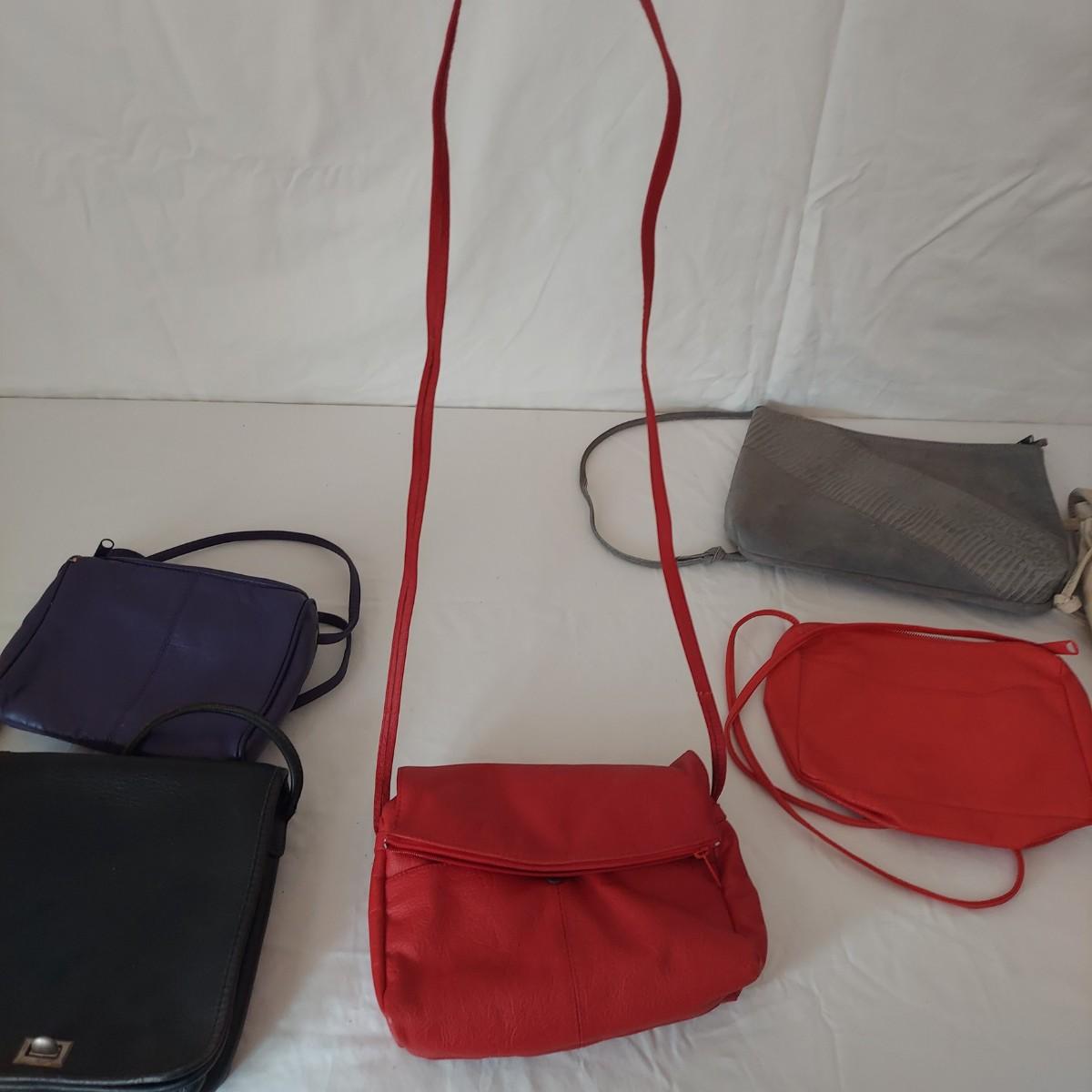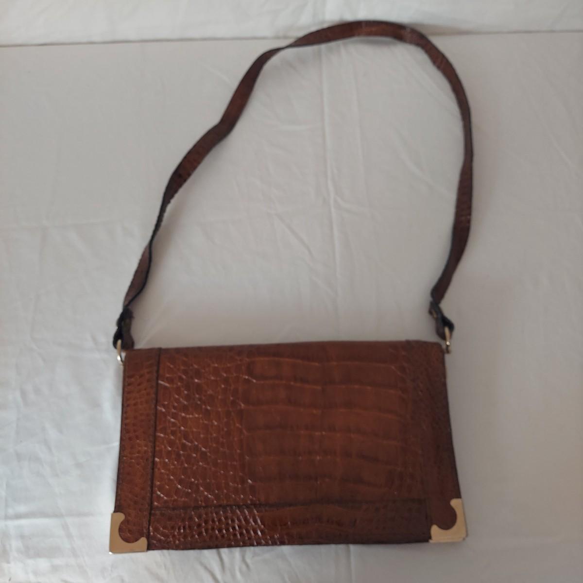 Lot includes 15+ vintage purses. Many are leather. The brown and white top handle bag measures 10" x 6” x 9"H not including handles. Please see photos for brands, materials and other details. Shipping available