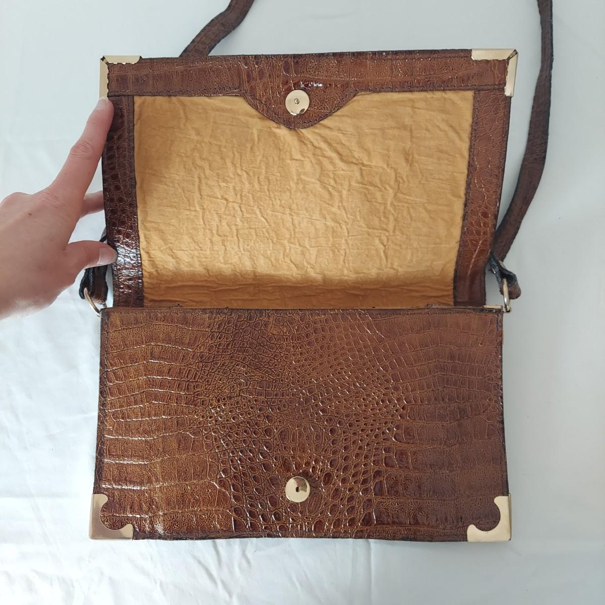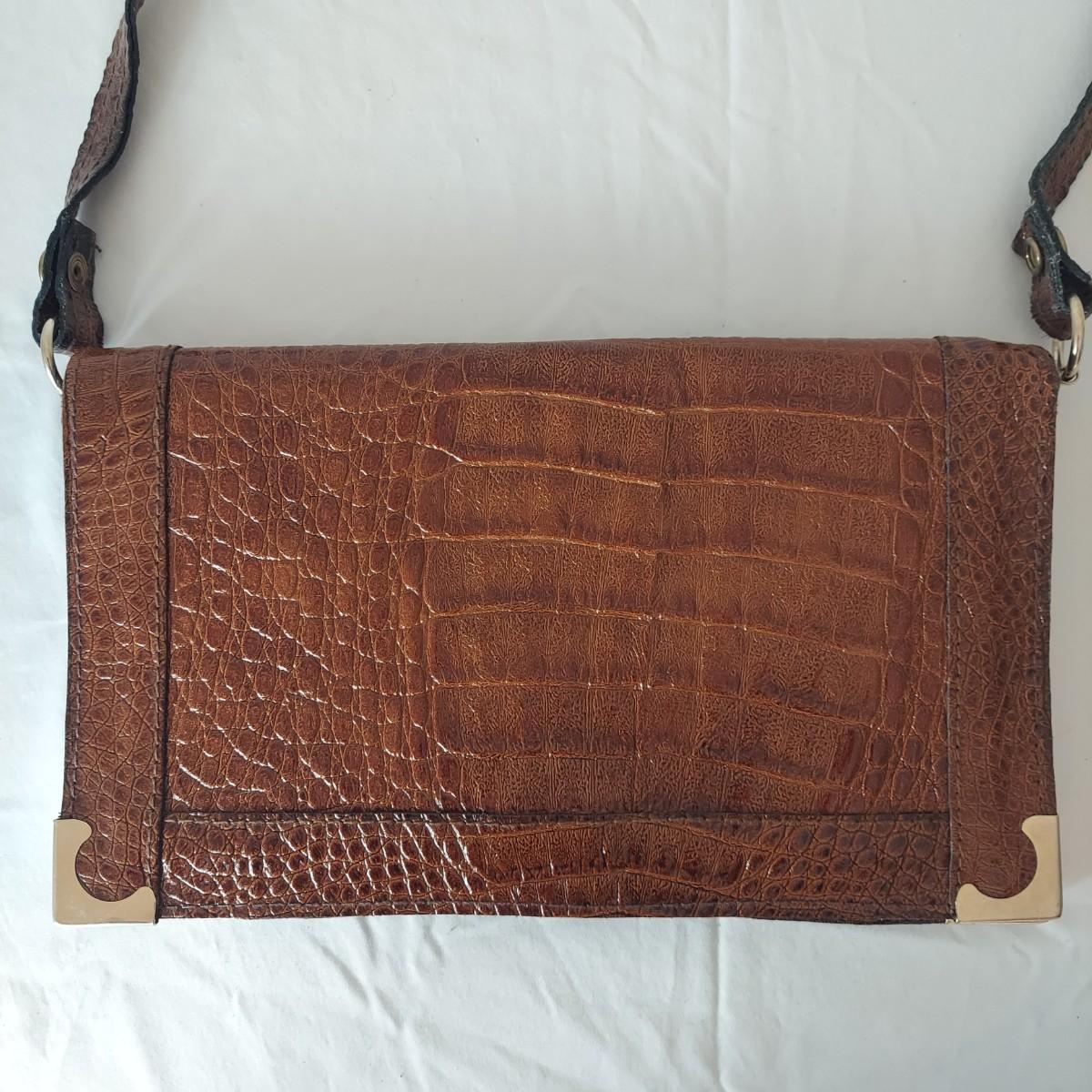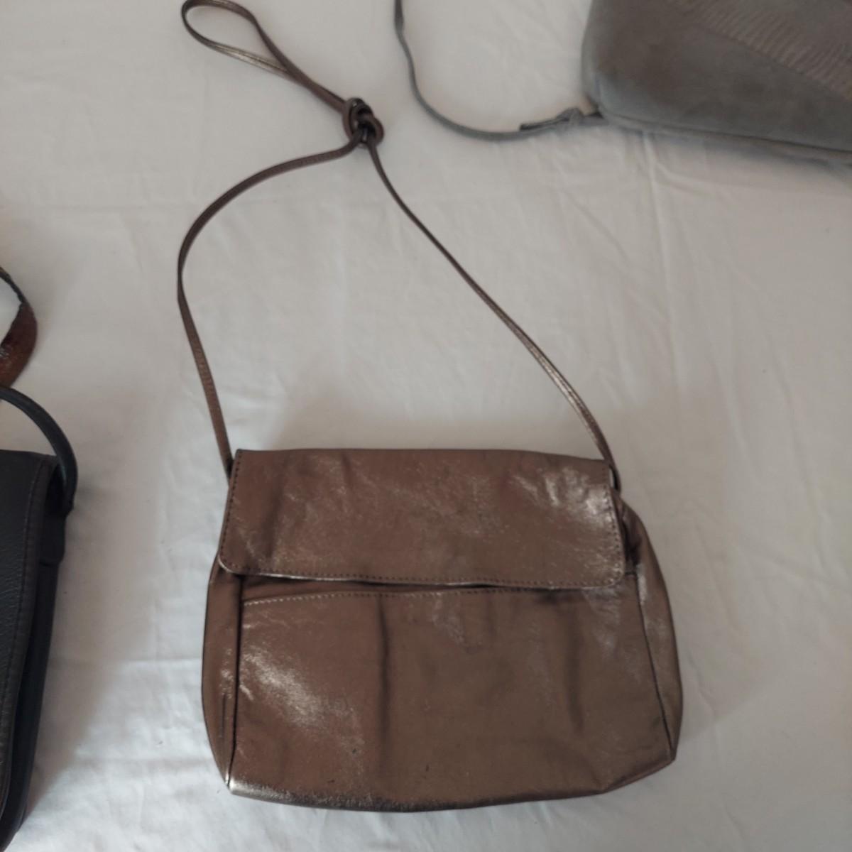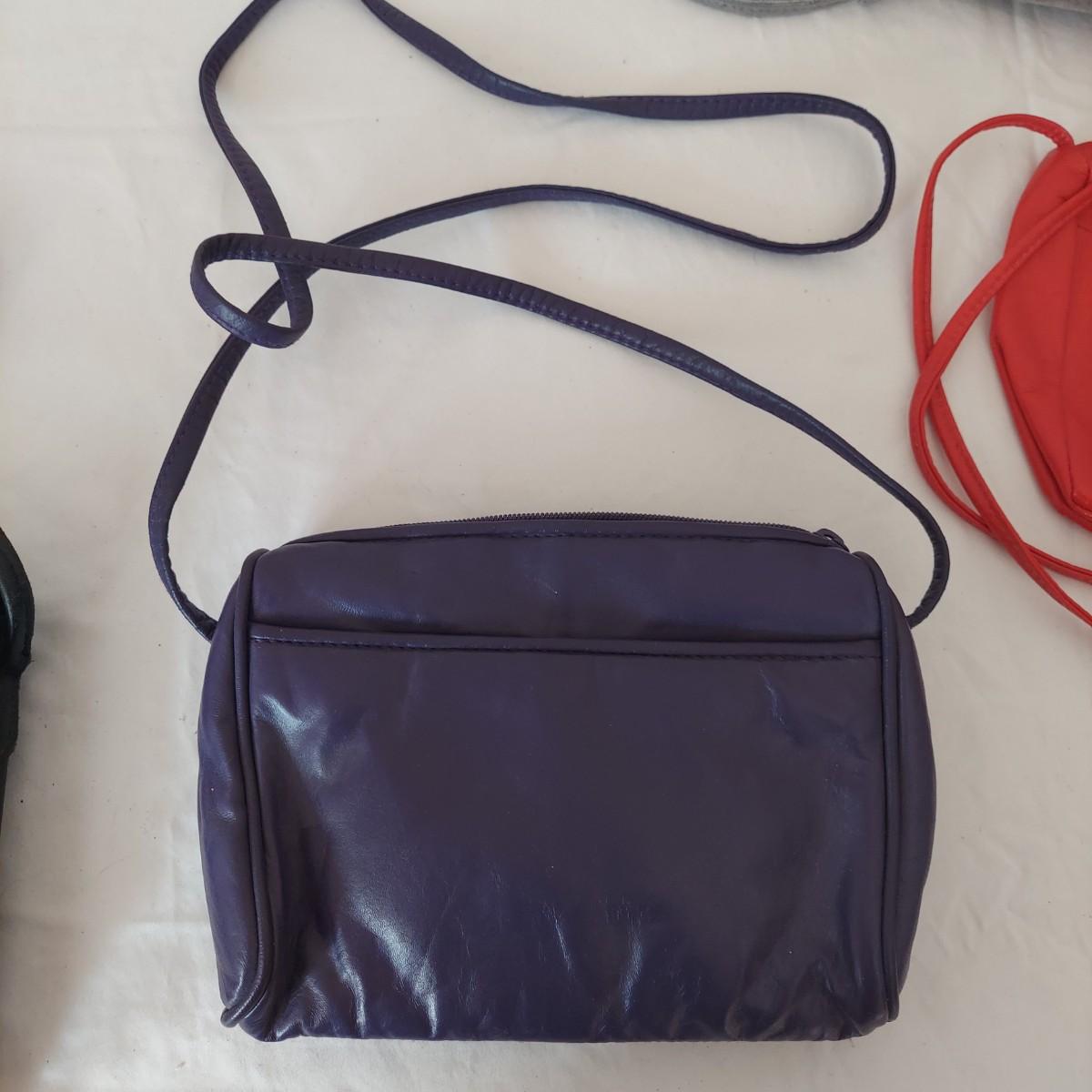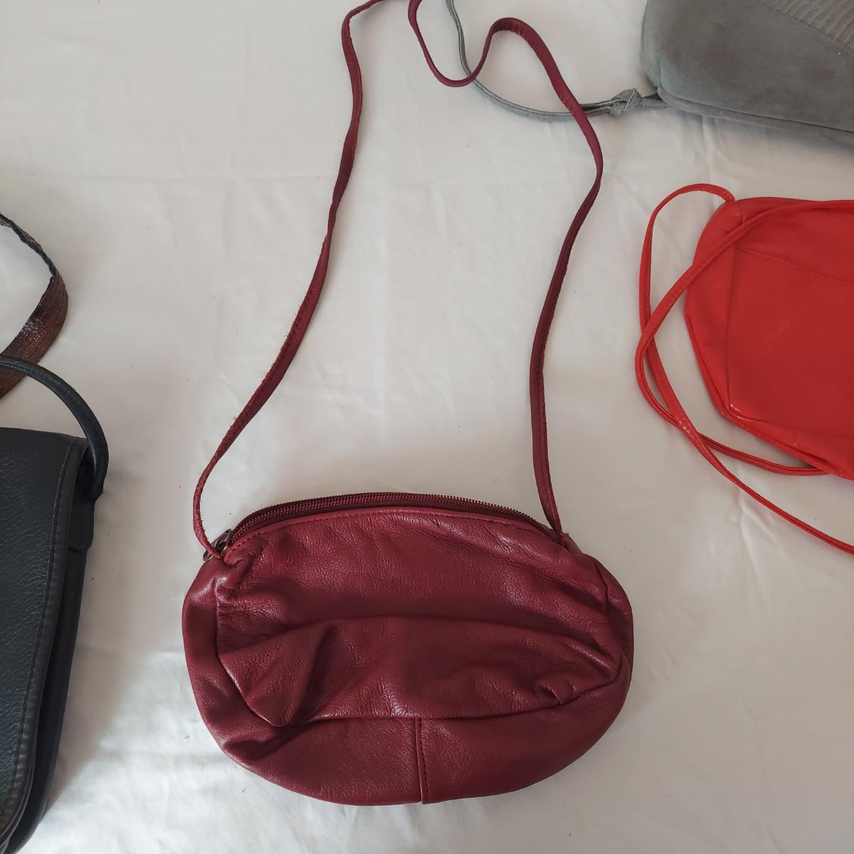 Lot includes 15+ vintage purses. Many are leather. The brown and white top handle bag measures 10" x 6” x 9"H not including handles. Please see photos for brands, materials and other details. Shipping available