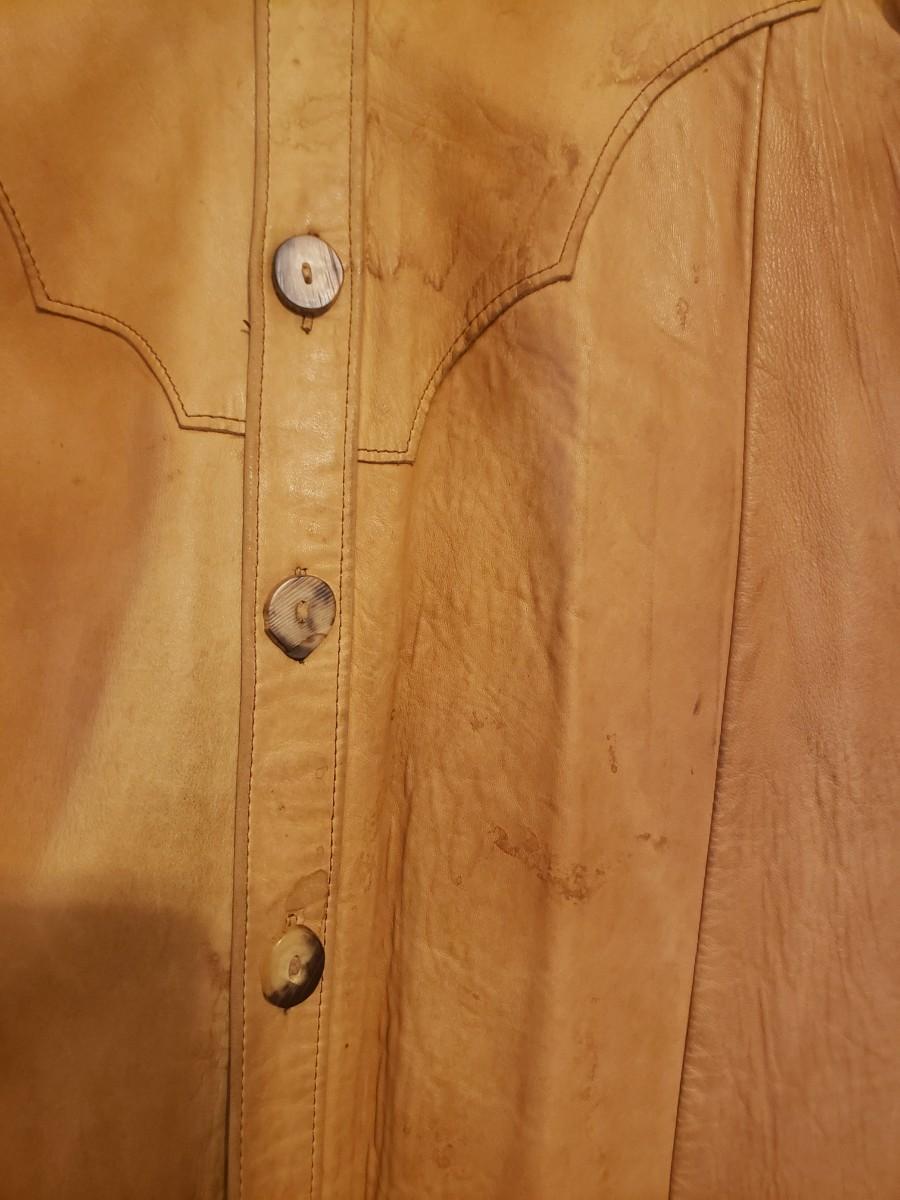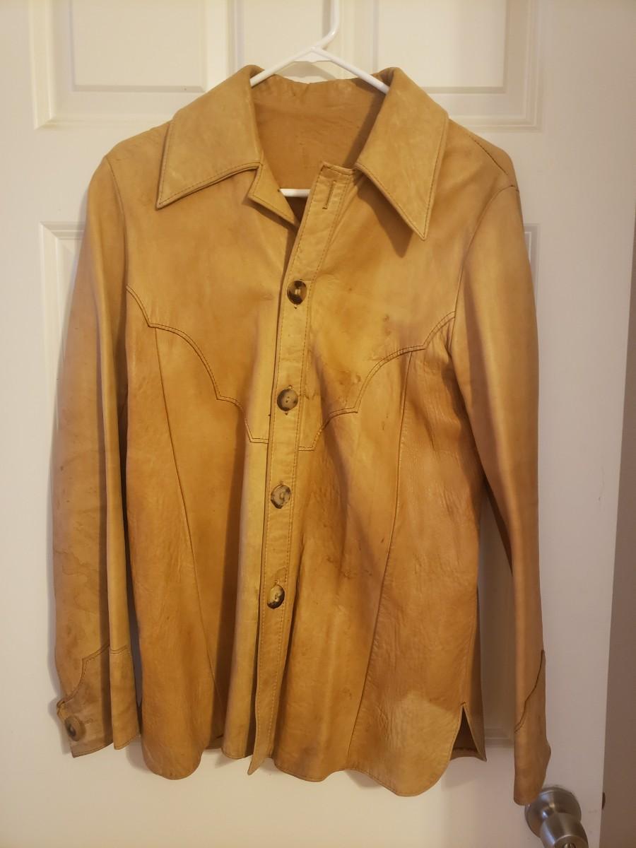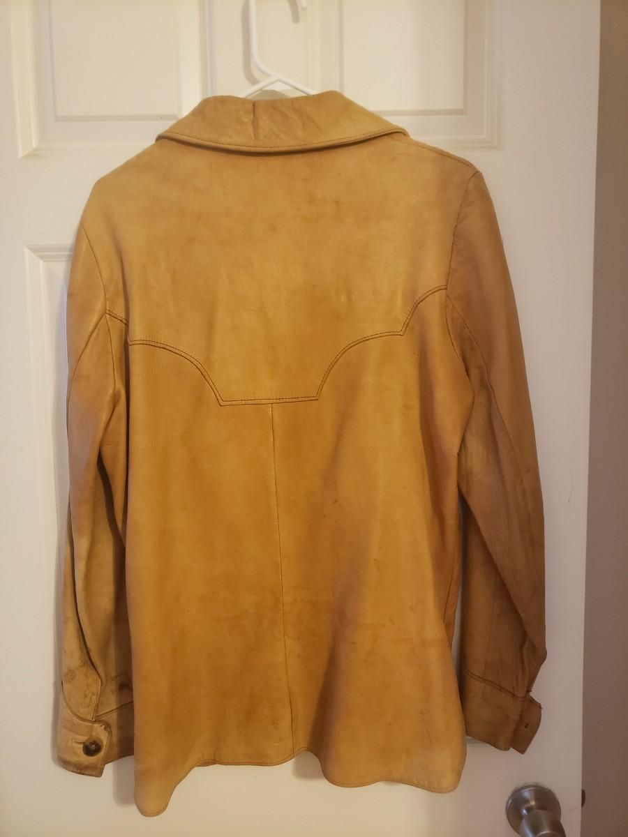 Vintage women's tan leather shirt jacket. Missing label. Fair condition. Approximate size women's medium.