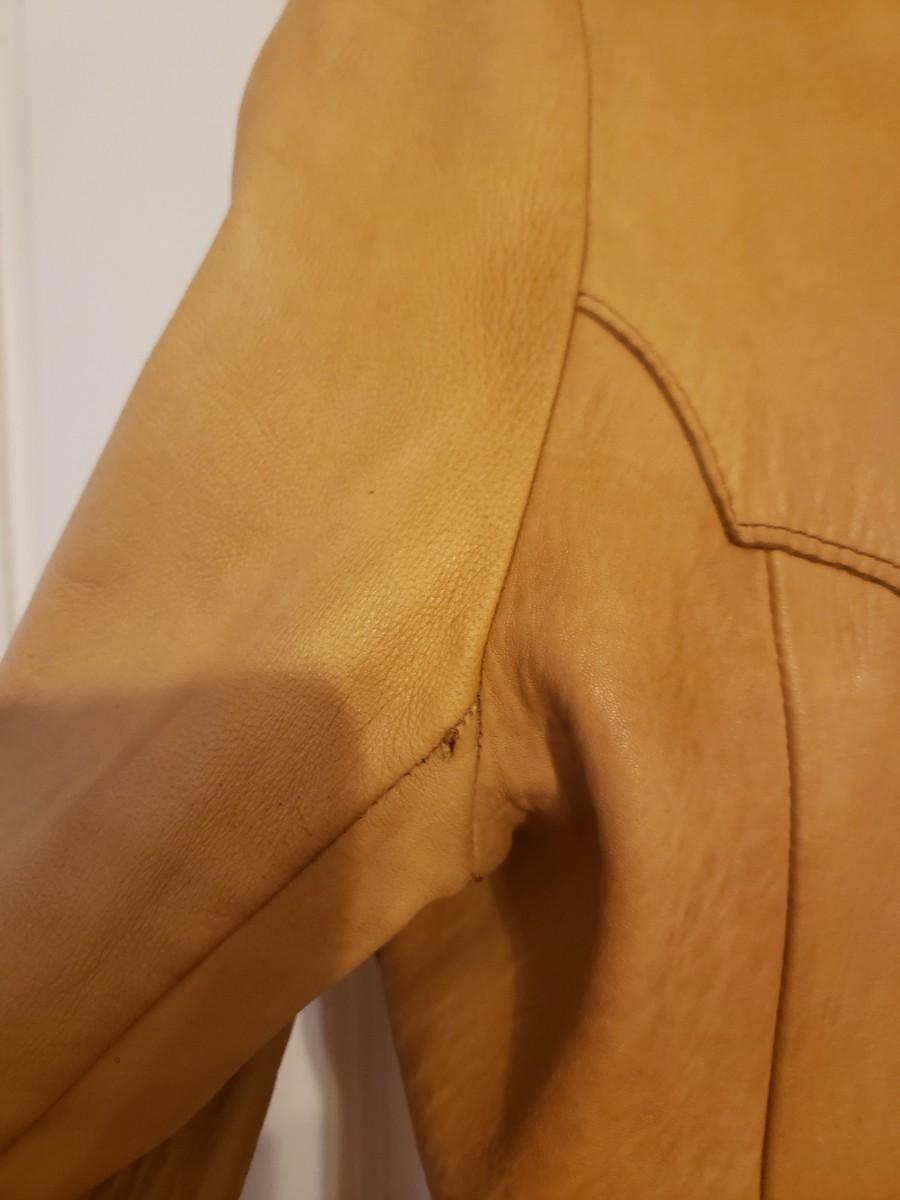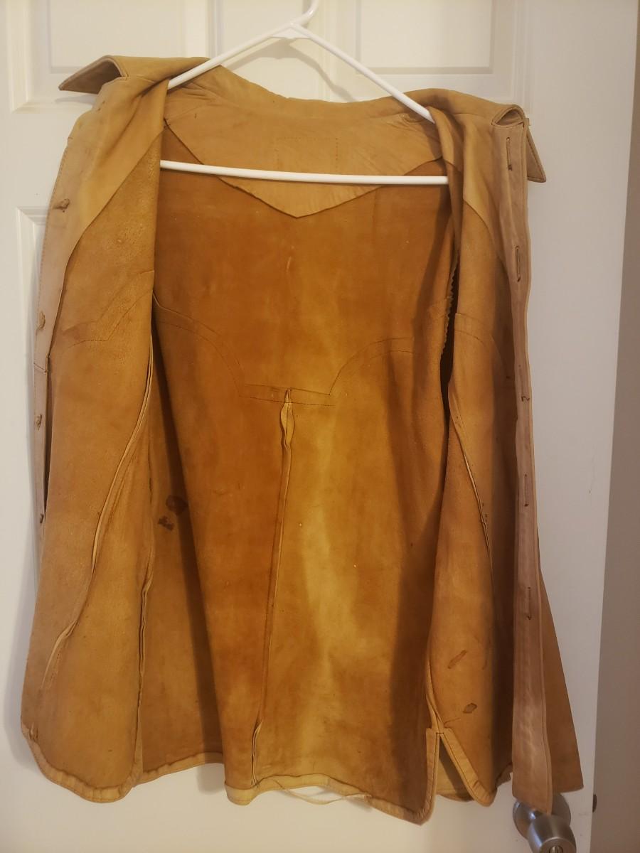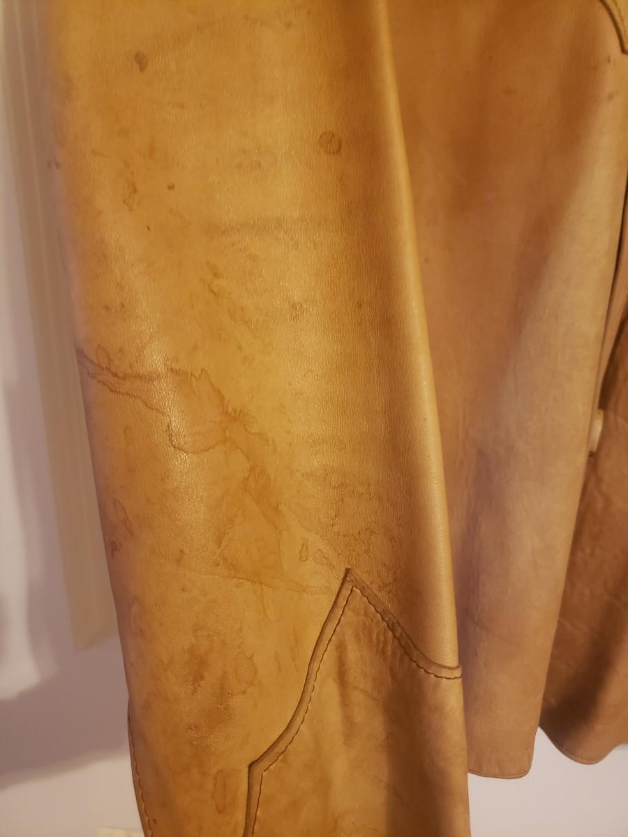 Vintage women's tan leather shirt jacket. Missing label. Fair condition. Approximate size women's medium.
