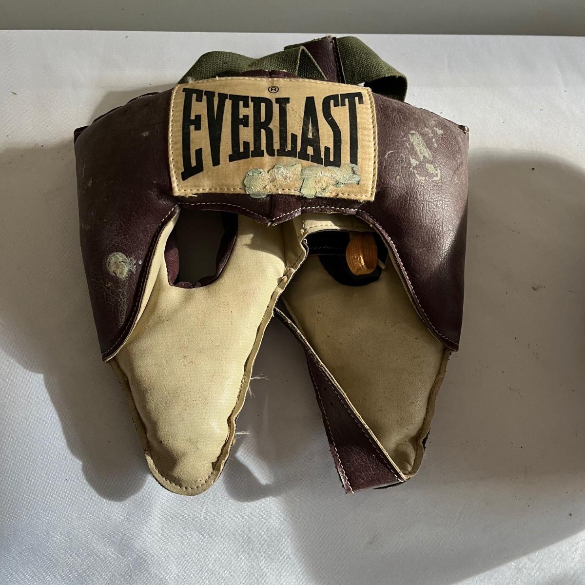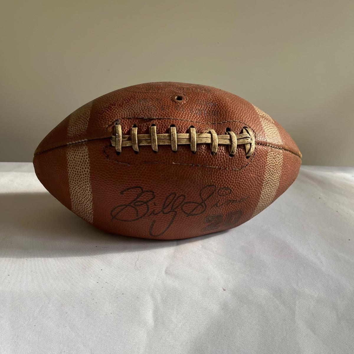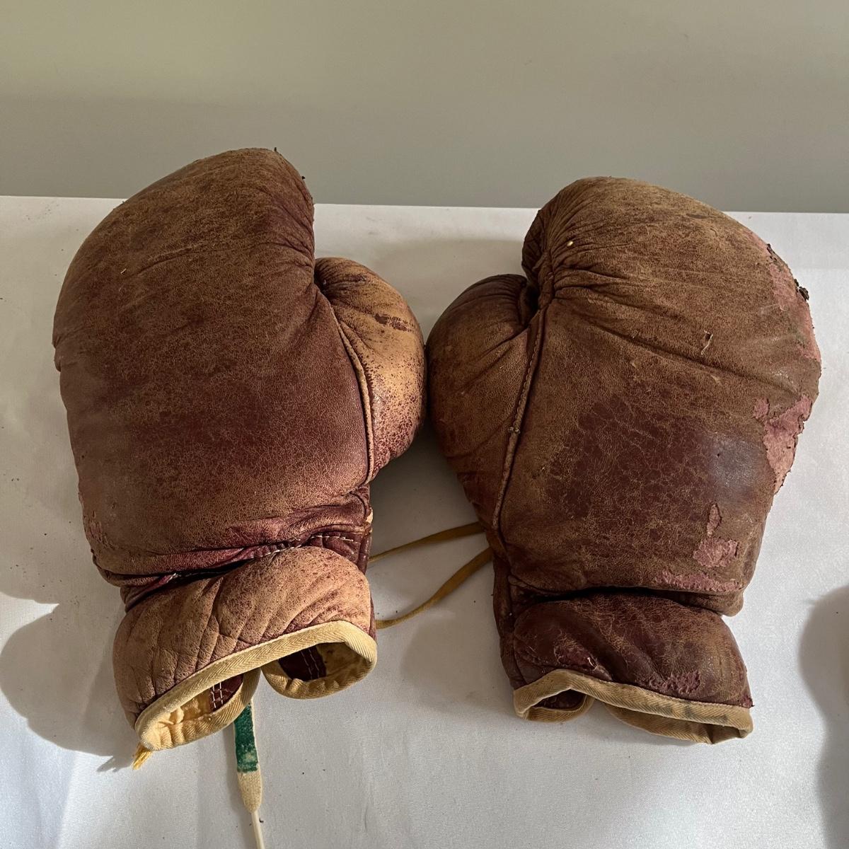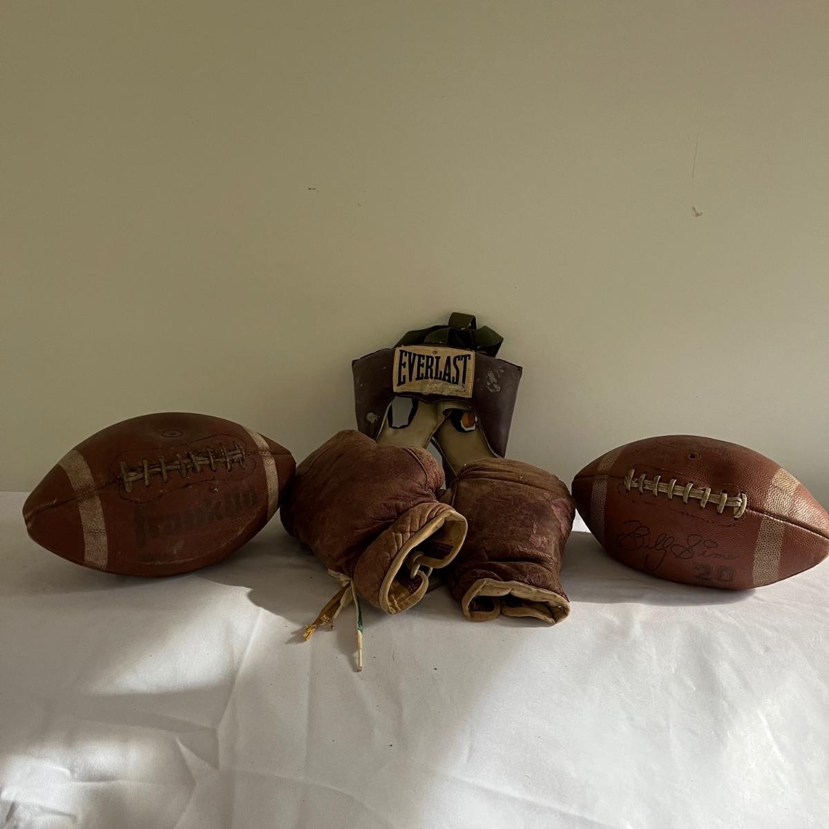 These vintage items include a pair of AAU boxing gloves, Everlast head protector, Billy Sims football and a Franklin football. All items are leather and show their age.