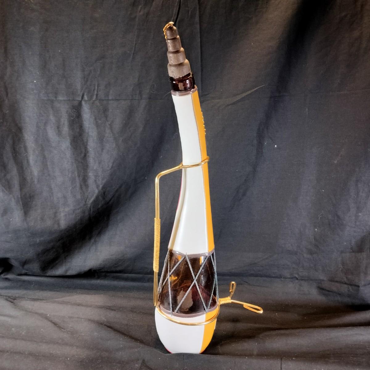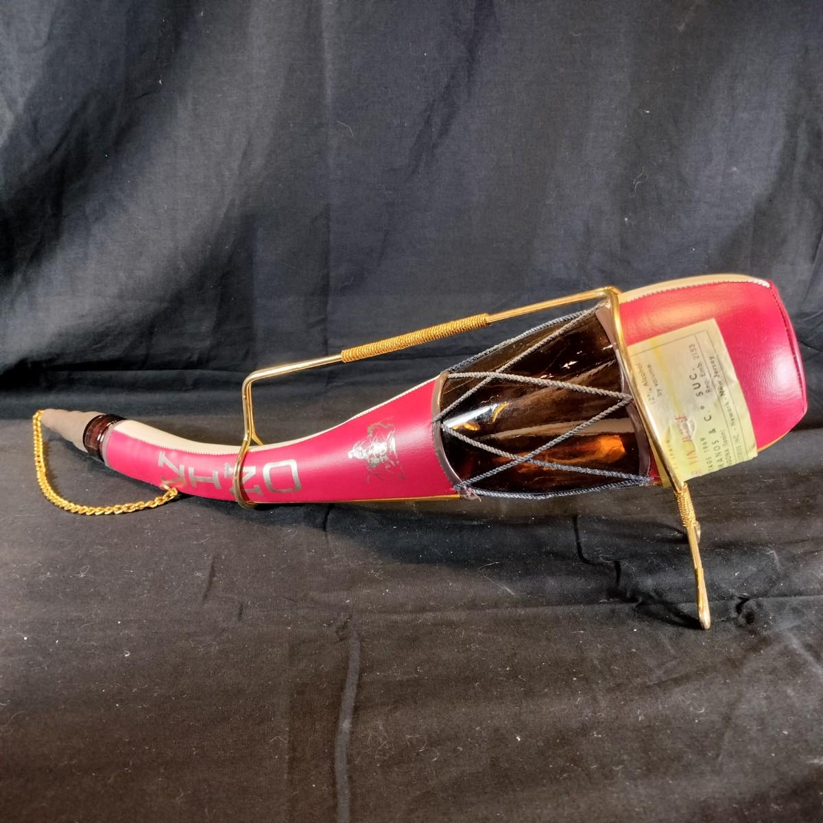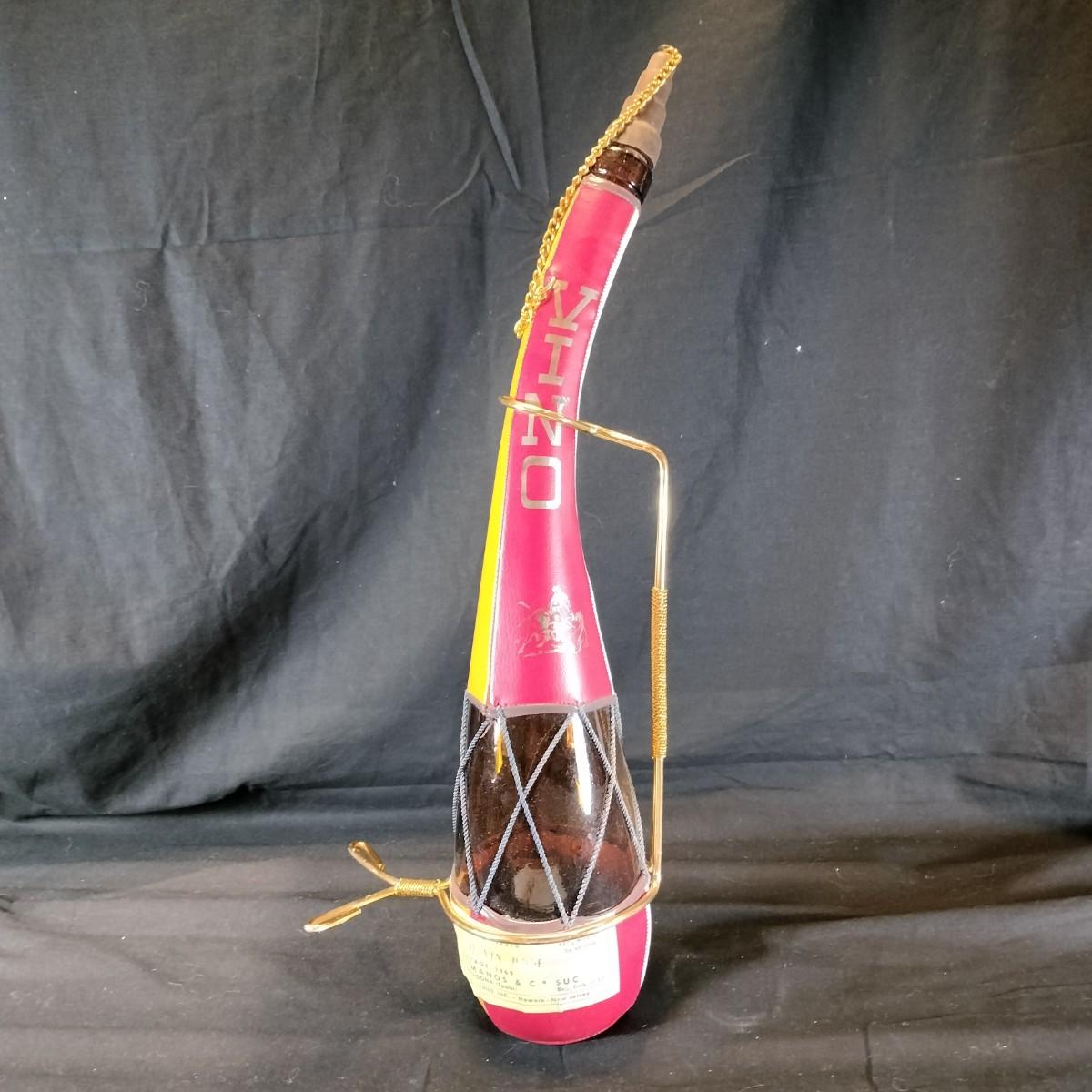 This auction lot is a Vintage Leather Wine Bottle from Spain with an attached brass handle and stand with a chain to hold the stopper. This is of course empty and the stopper is glued in so it needs to be a fun bar decoration. States on the lable "Spanish Vin Rose" - Dalmau Hermano & Co SUC. Established in 1830, imported from Tarragona, Spain. It measures about 18.5-inches long either lying down or standing tall. Leather is in very good condition. Nifty Decor Item.