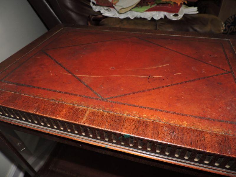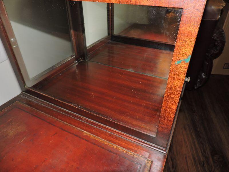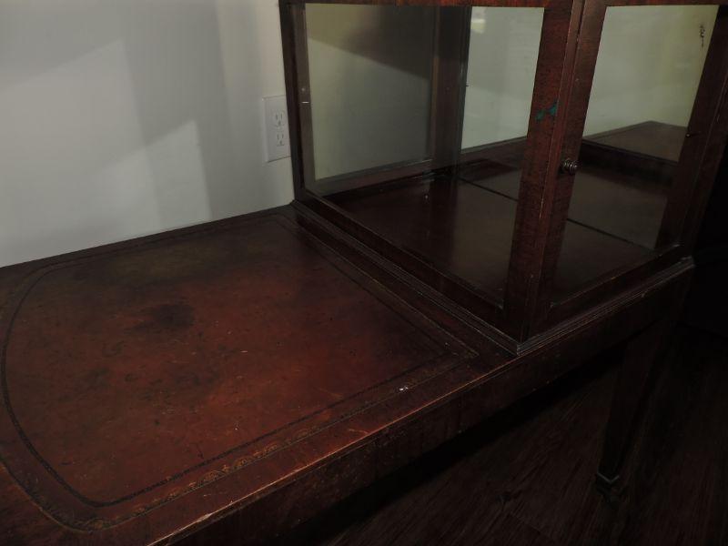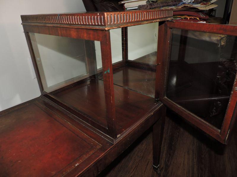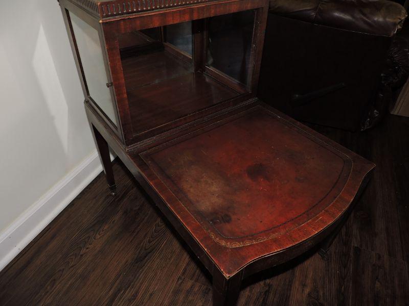Vintage Leather-Top Step End Table with Enclosed Glass Curio. Very unique piece! Both sides open up for access. Some stains, but overall a great piece! **Please read Terms and Conditions before placing a bid. Pick up is Thursday, August 15, 2019 from 4pm to 7pm or Sunday, August 18 from 11am-2pm in Mullica Hill. All sales are final. All sales are as is, where is. Please review all photos. Any props included in photos are not included in listing. All measurements are approximate.