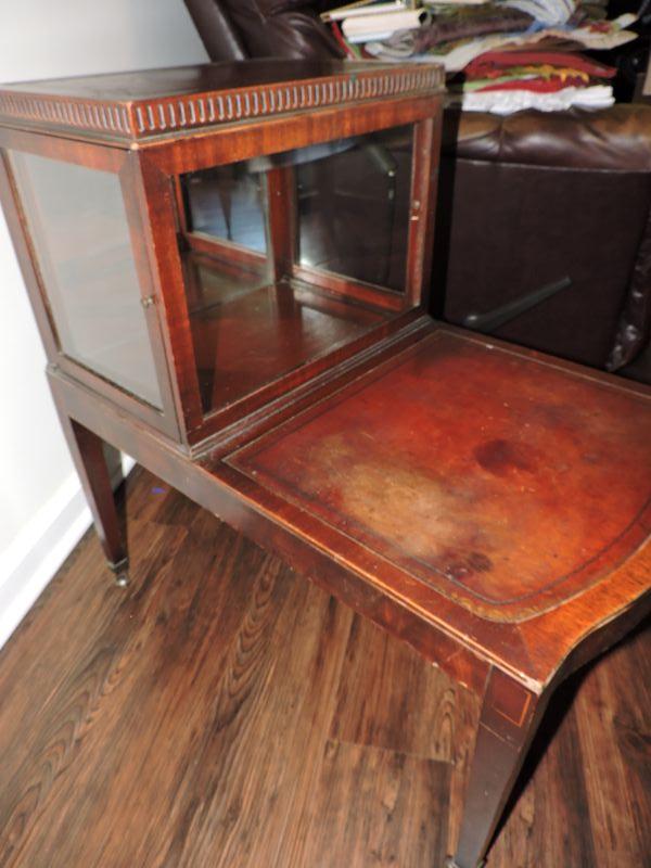 Vintage Leather-Top Step End Table with Enclosed Glass Curio-Very Unique!