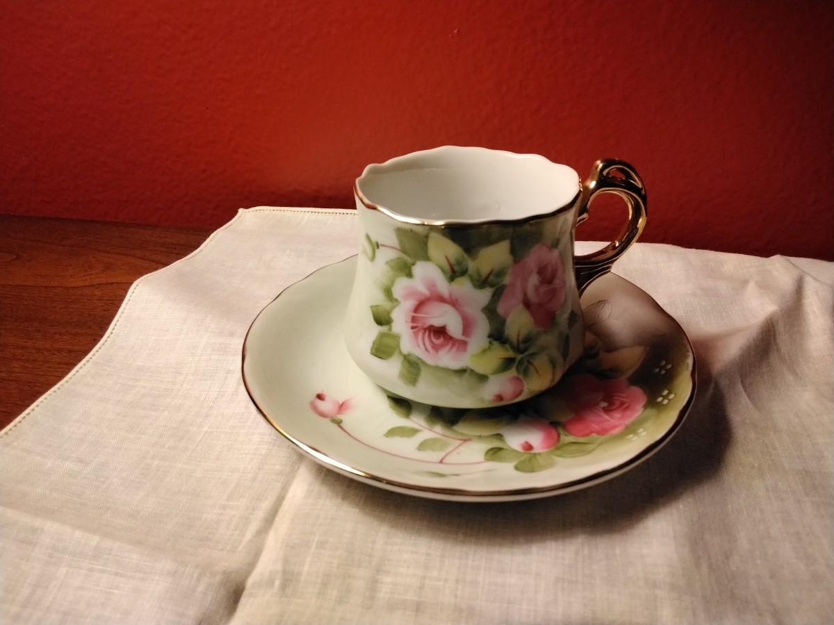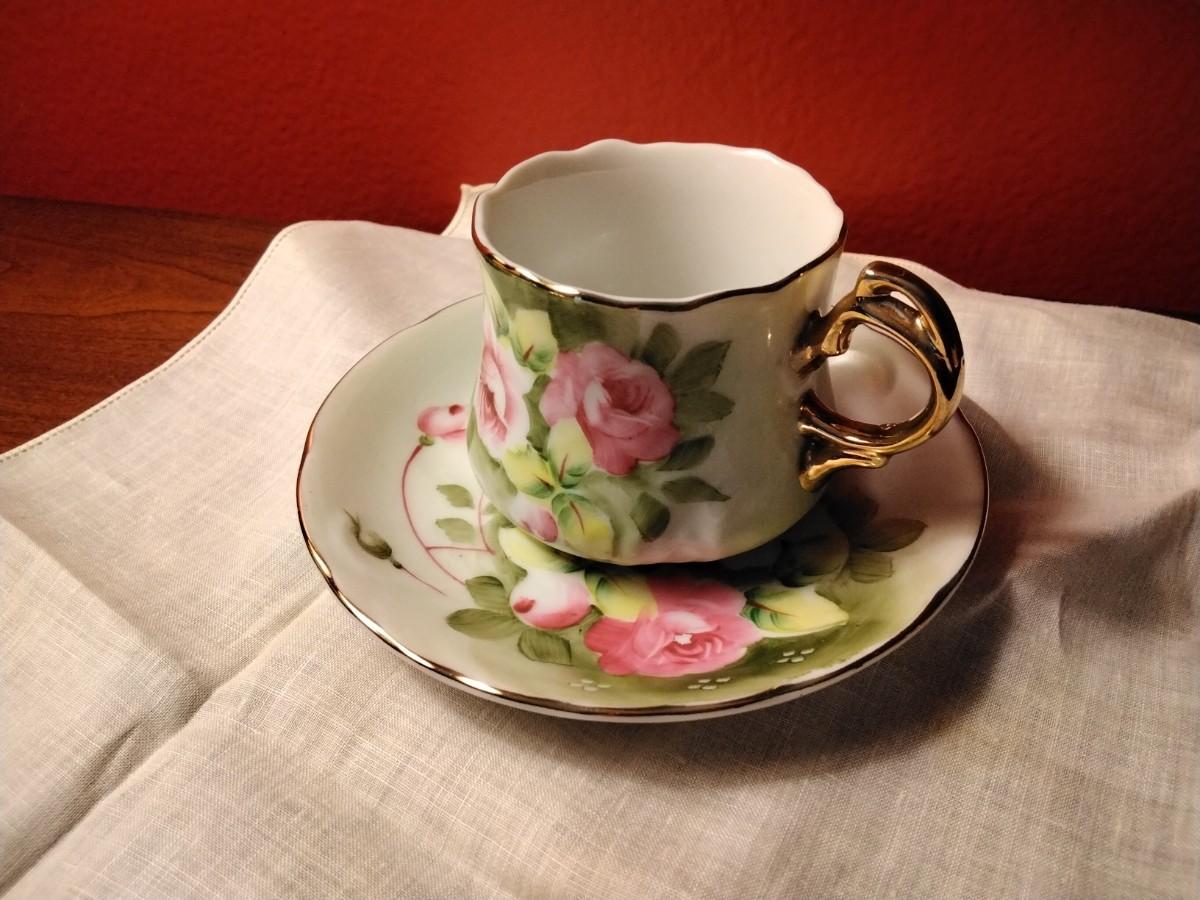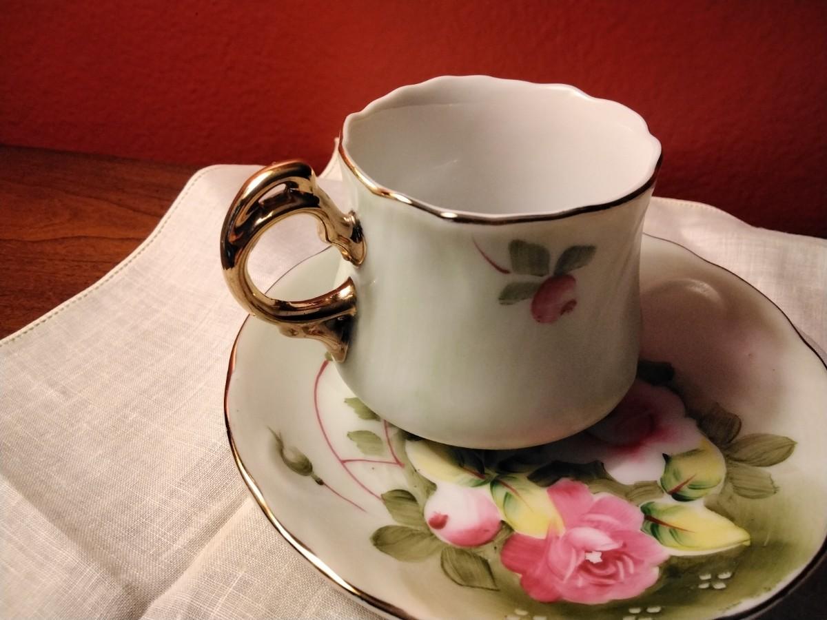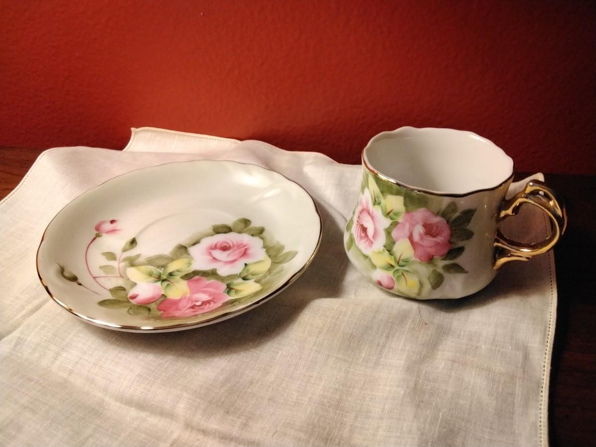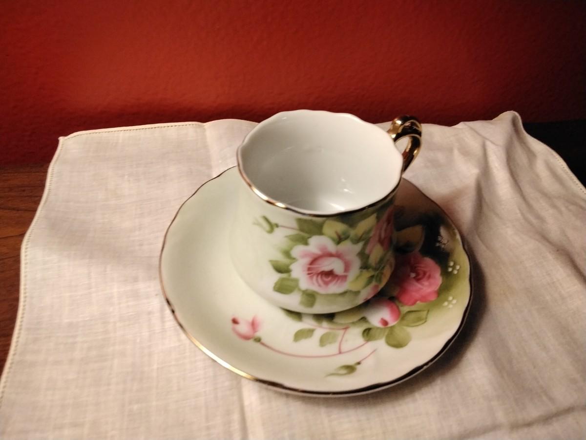Vintage Lefton China Hand Painted Heritage Roses Motif Teacup & Saucer with Gold Accents