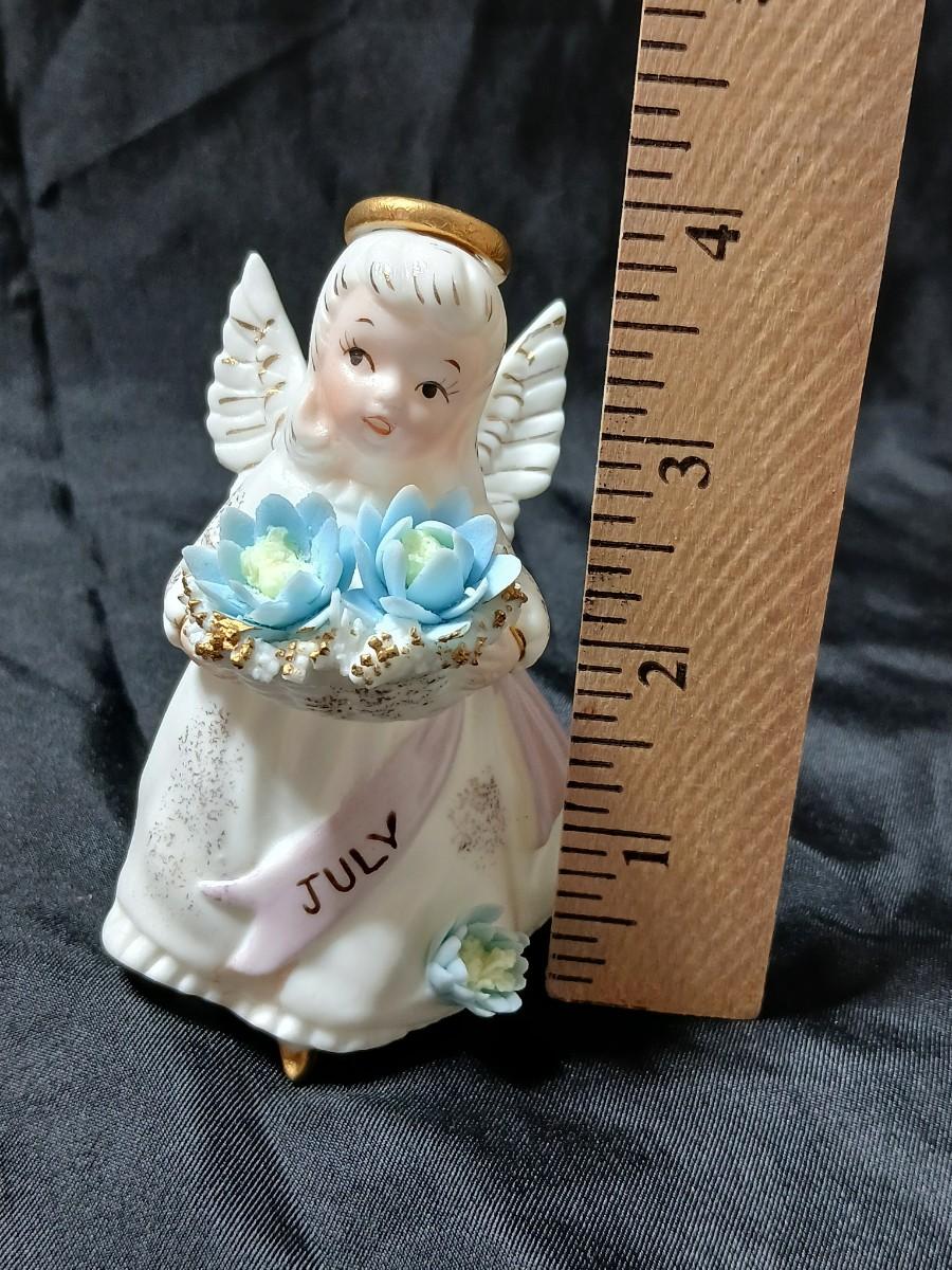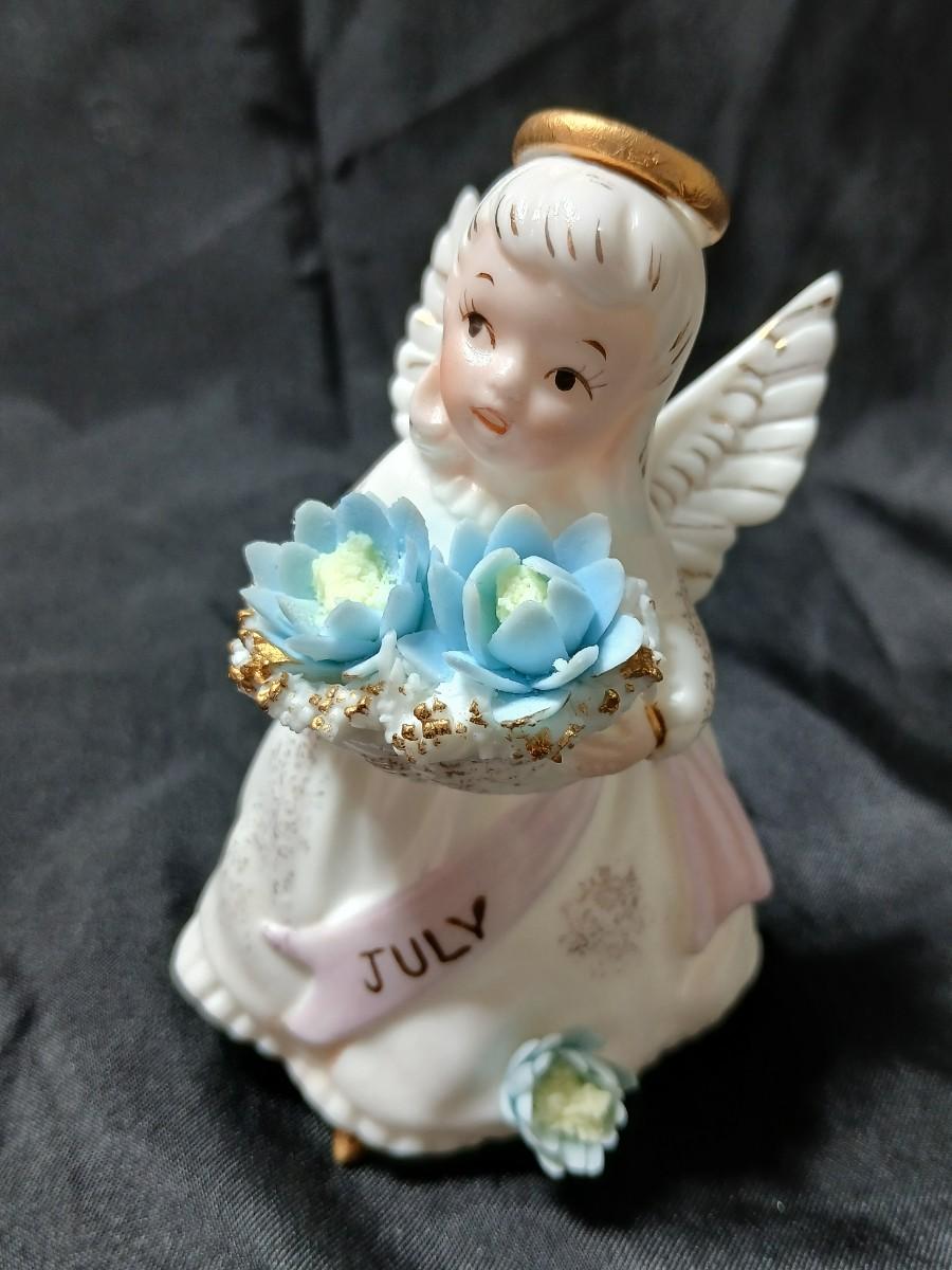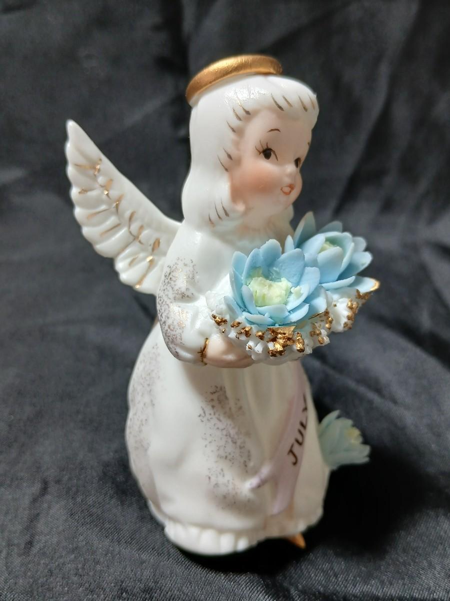 vintage Lefton July Birthday Angel figurine, holding blue flowers Lefton's 3332