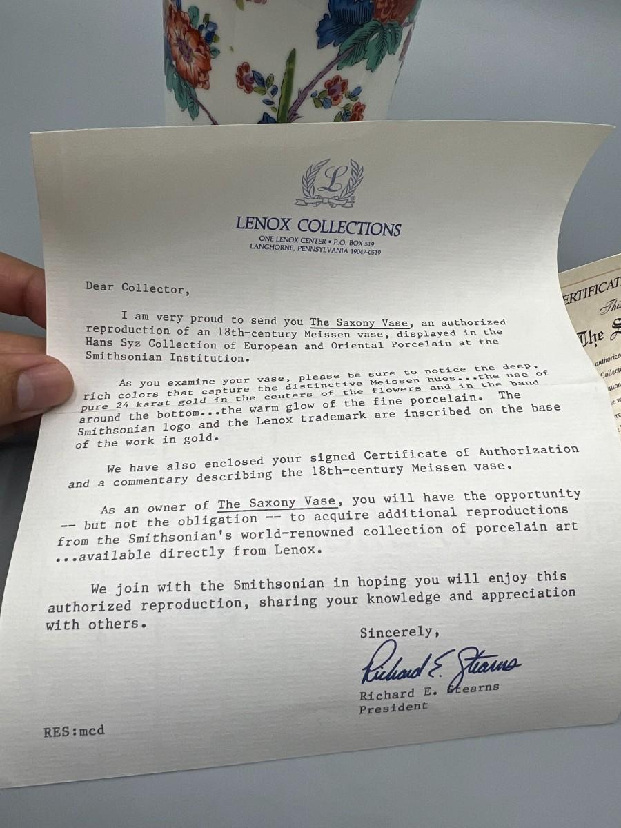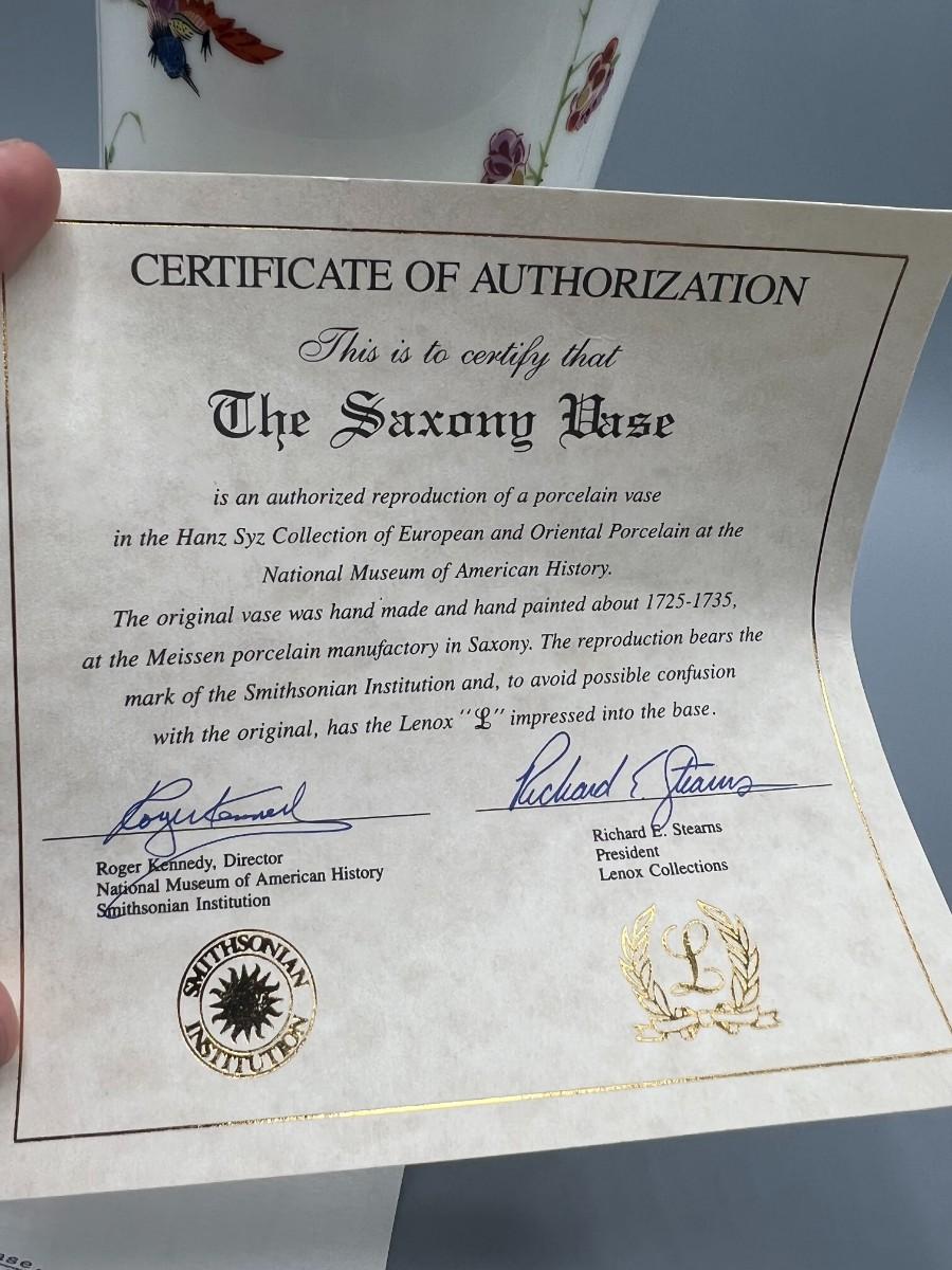 Vintage Lenox Smithsonian Institution 24K Saxony Meissen Porcelain Vase with COA
