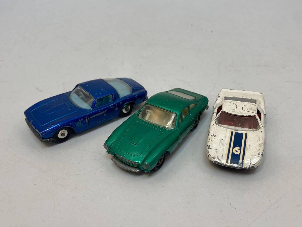 Vintage Lesney Matchbox Series diecast cars #14 ISO Grifo, #41 Ford GT, and #75 Ferrari Berlinetta. In good play worn condition, See photos.