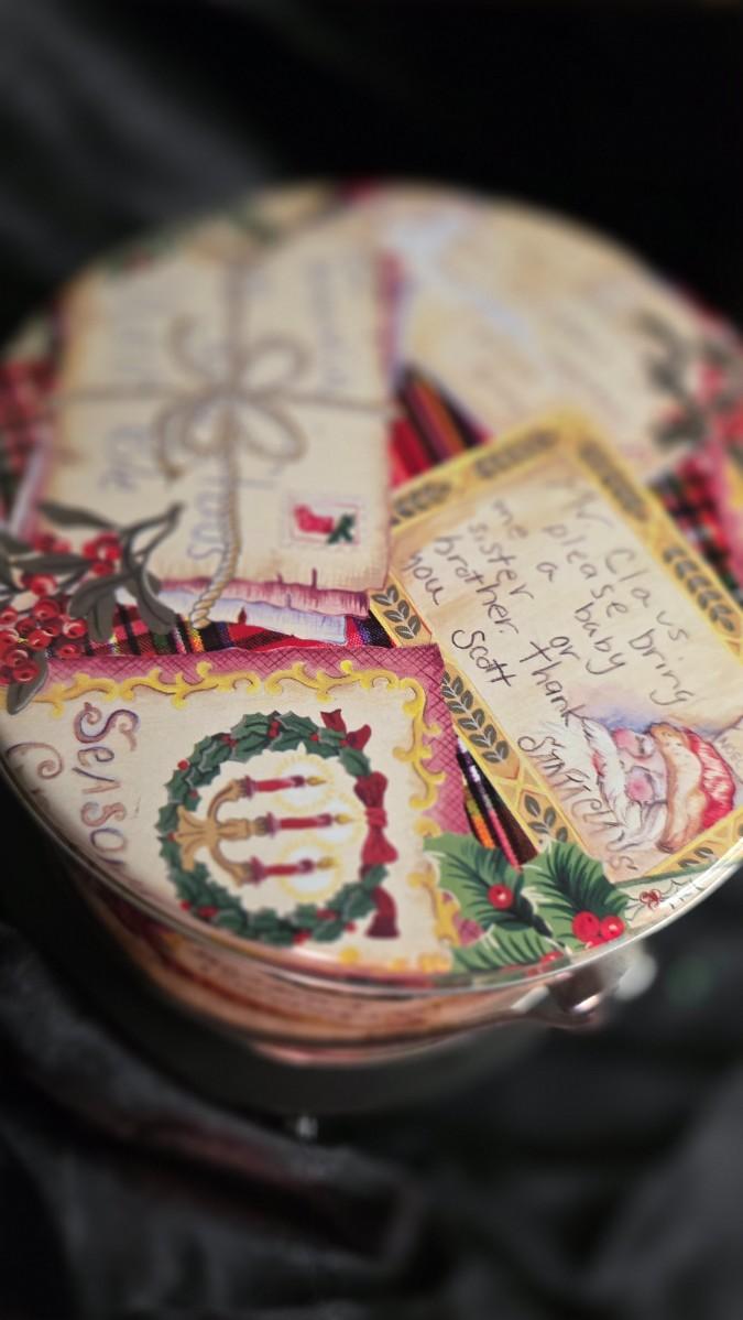 This charming vintage Christmas tin pail captures the magic of the season with a heartwarming collage of handwritten “Letters to Santa,” classic holiday illustrations, wreaths, holly, and nostalgic mid-century styling. The softly aged finish and muted vintage palette give it that perfect old-fashioned Christmas feel—warm, sentimental, and wonderfully decorative. The metal pail shape adds a unique touch, complete with a sturdy swing handle, making it ideal for display, storage, or gifting. Use it to hold treats, ornaments, holiday cards, or simply let it shine as a festive décor piece on its own. This piece brings instant Christmas charm to any space and fits beautifully into traditional, farmhouse, cottage, and vintage-inspired holiday themes. A delightful seasonal collectible ready to brighten your home year after year.