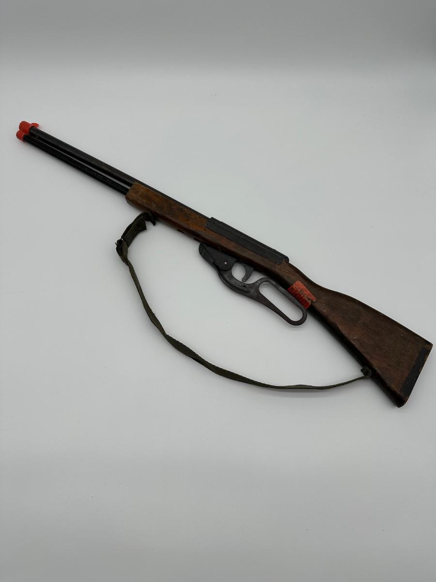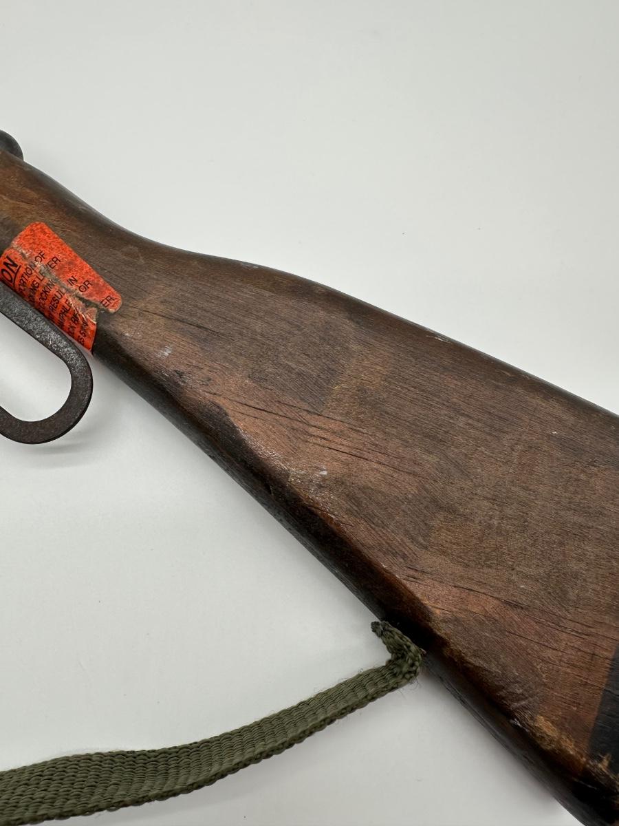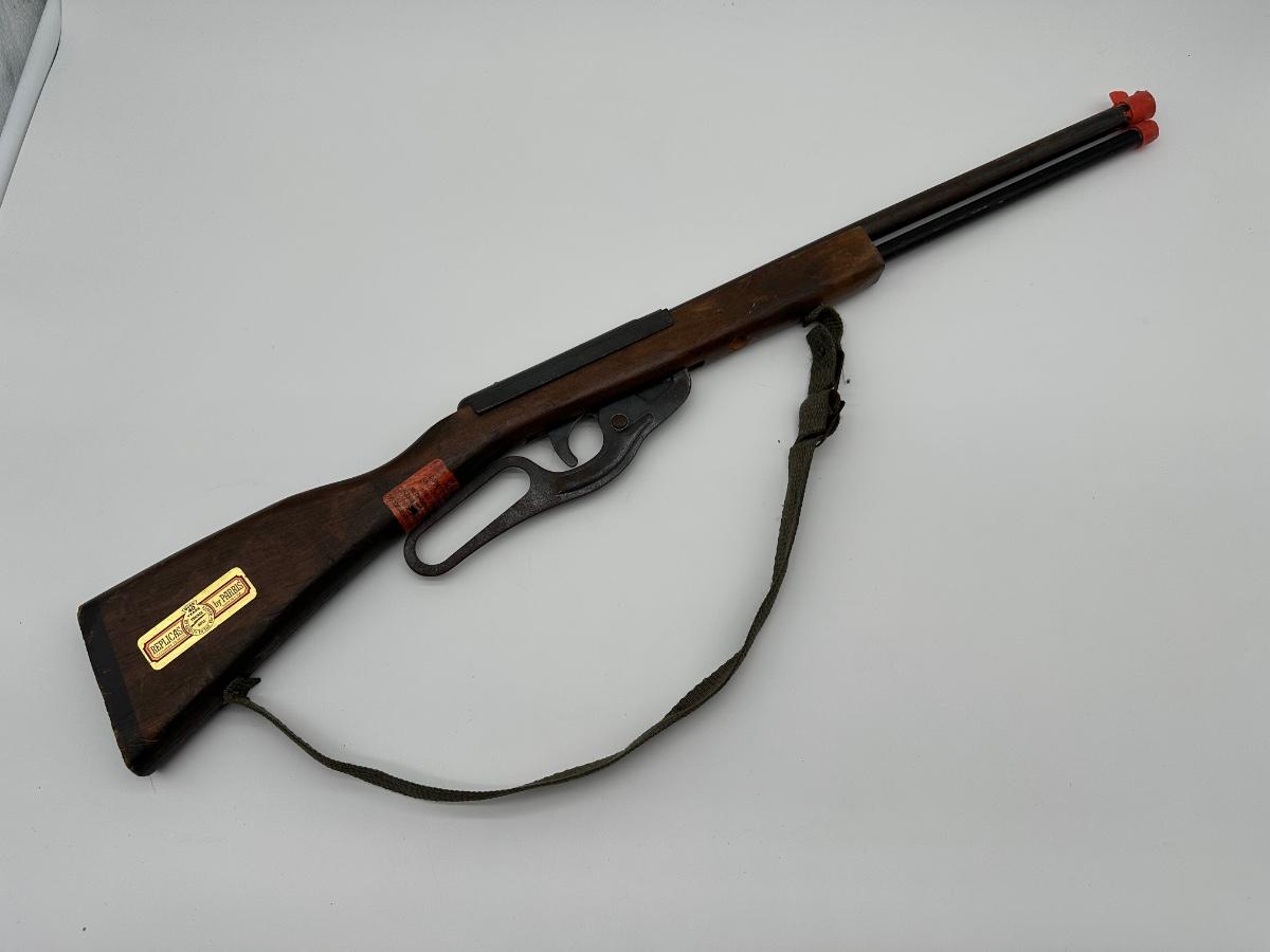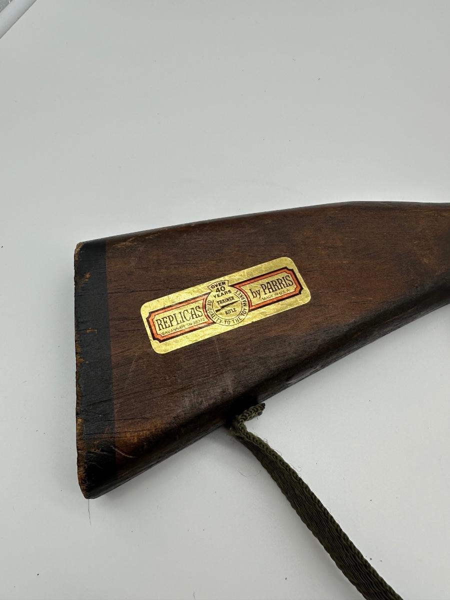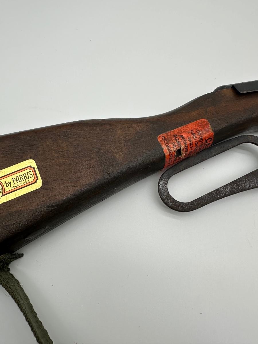 Vintage lever-action style toy rifle replica made by Parris Manufacturing. Features a solid wood stock, metal lever-action mechanism, and twin barrel design with original red muzzle tips. Includes original warning/label decals and cloth sling. Classic Western-style replica commonly used for display, reenactments, or collection. Shows age-appropriate wear consistent with vintage pieces but remains structurally solid.