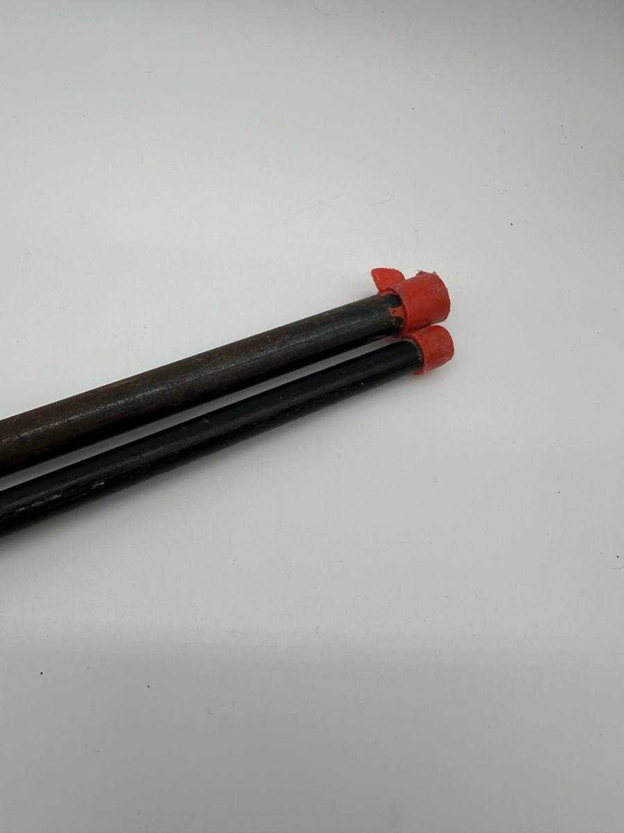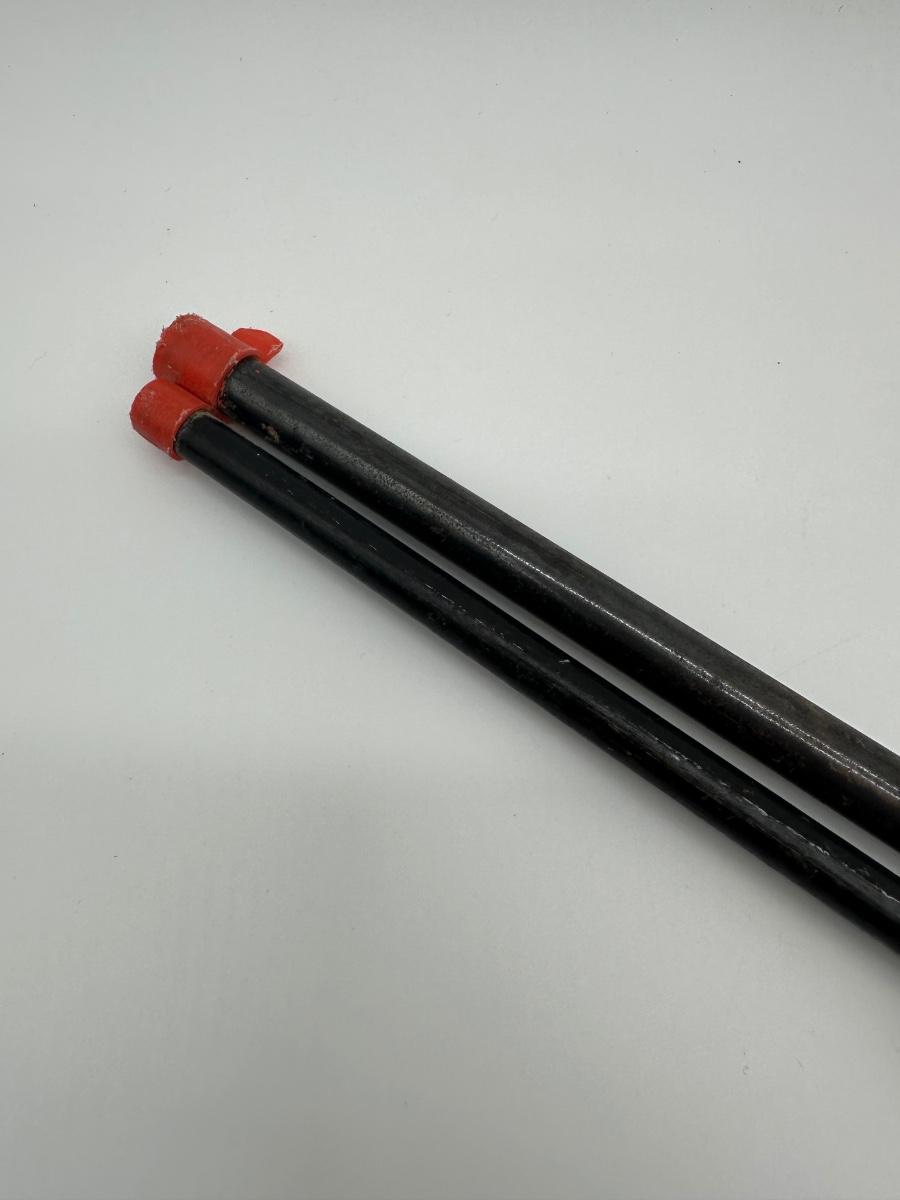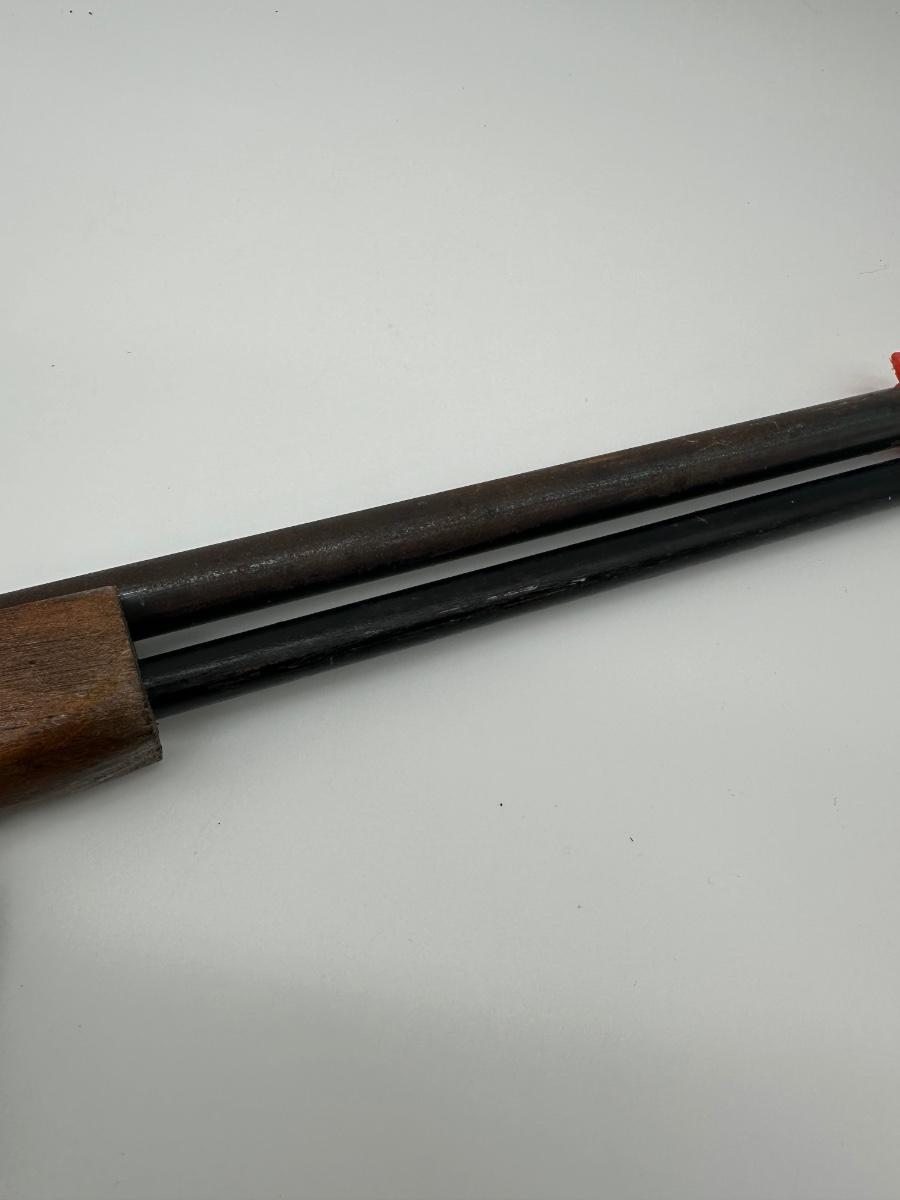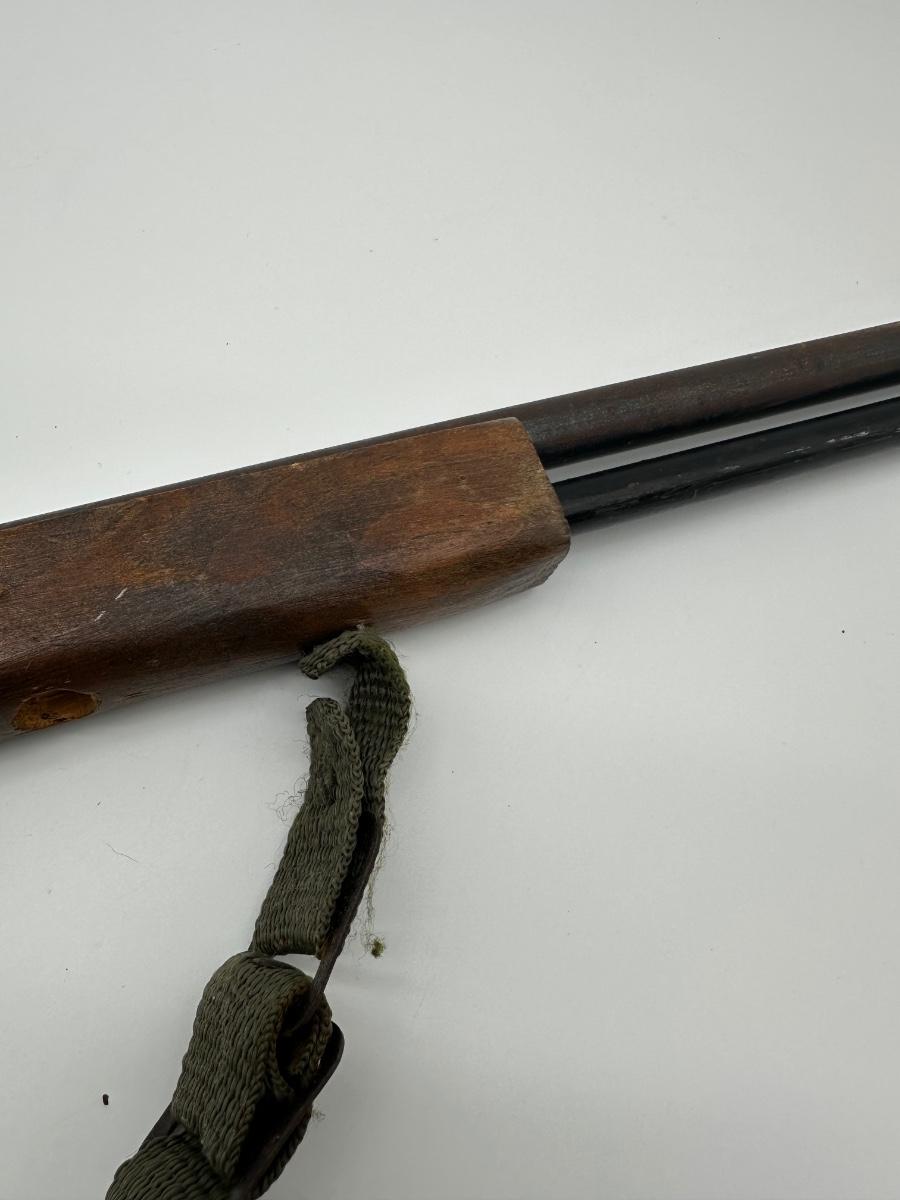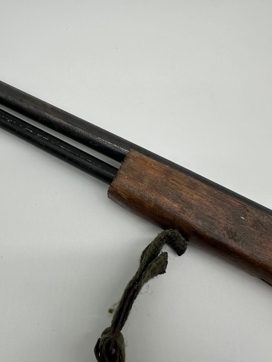 Vintage lever-action style toy rifle replica made by Parris Manufacturing. Features a solid wood stock, metal lever-action mechanism, and twin barrel design with original red muzzle tips. Includes original warning/label decals and cloth sling. Classic Western-style replica commonly used for display, reenactments, or collection. Shows age-appropriate wear consistent with vintage pieces but remains structurally solid.