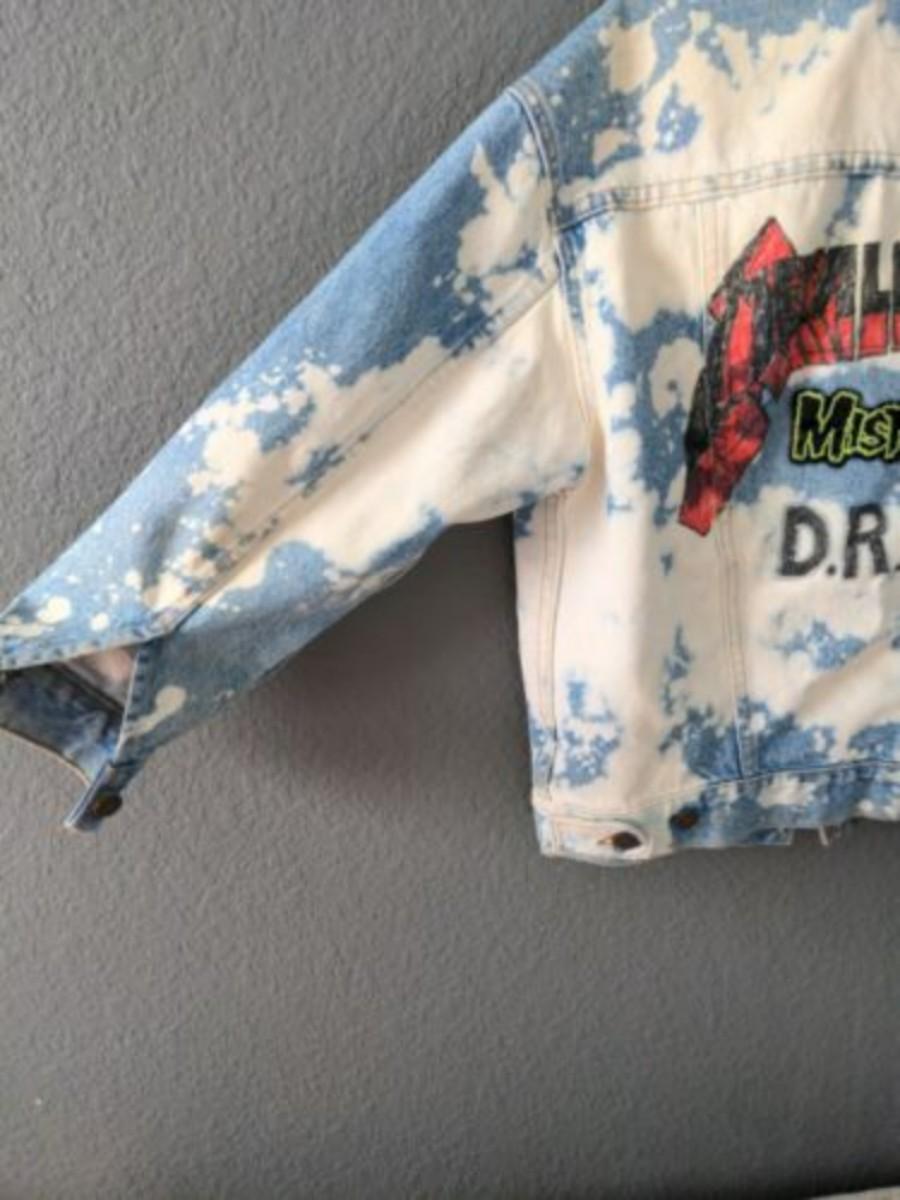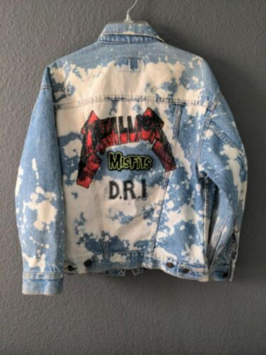 Up for grabs is an amazing true vintage DIY denim jacket. A real "Hellraiser Club" find! Original bleach dye job, Metallica and DRI hand drawn (very well I might add) logos and flocked vintage Misfits patch added to the back. The jacket itself is in great condition for age with minimal wear. Some spotting found on the back of the right sleeve, and a small hole in the back is noted, but this hasn't been washed so it very well could come clean. Either way you shake it this true vintage piece of thrash metal history is a great find!! Measurements laying flat are- Pit to pit: 17.5"-Neck to end: 23" -Shoulders: 16"-Sleeves: 15" (taken from pit to end)