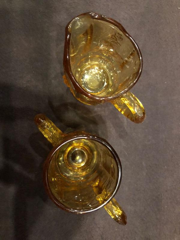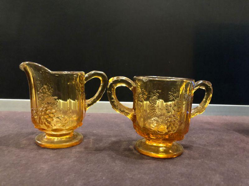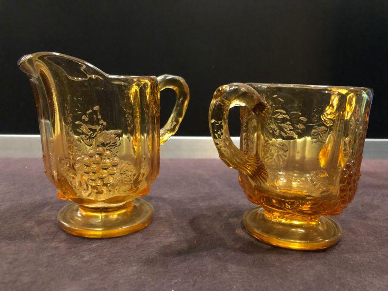 VINTAGE LG WRIGHT AMBER GLASS FOOTED CREAMER/SUGAR EMBOSSED GRAPES