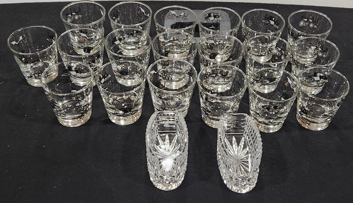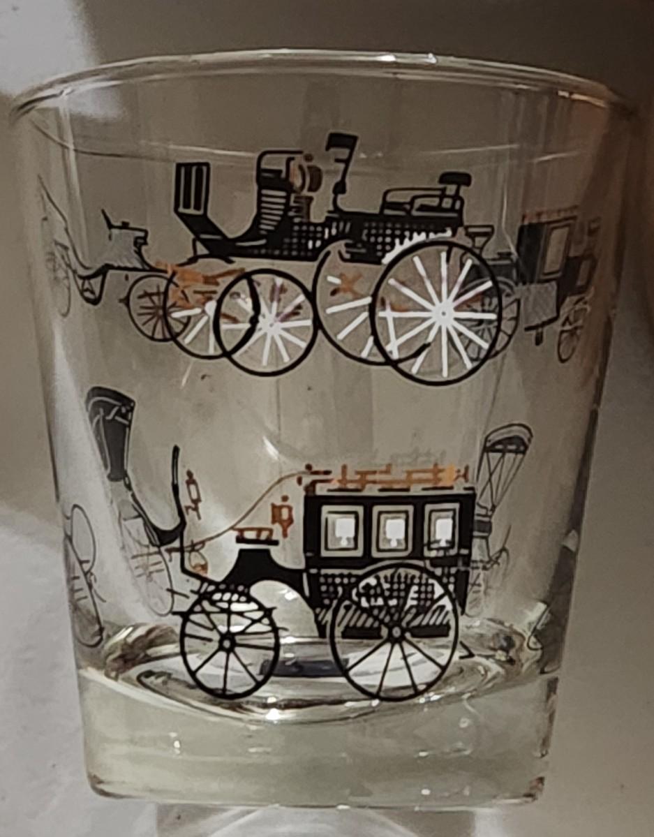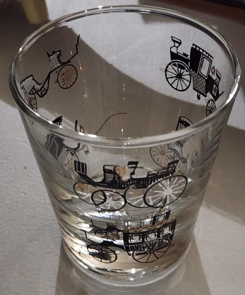 Vintage Libby 8 Oz Black Gold Trim Clear Antique Automobile Car Rocks Glasses (19) w/ crystal rest for spoon
