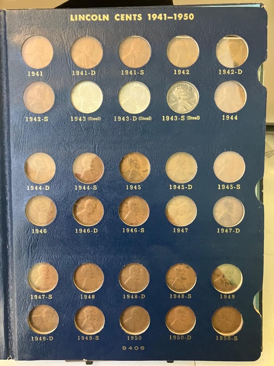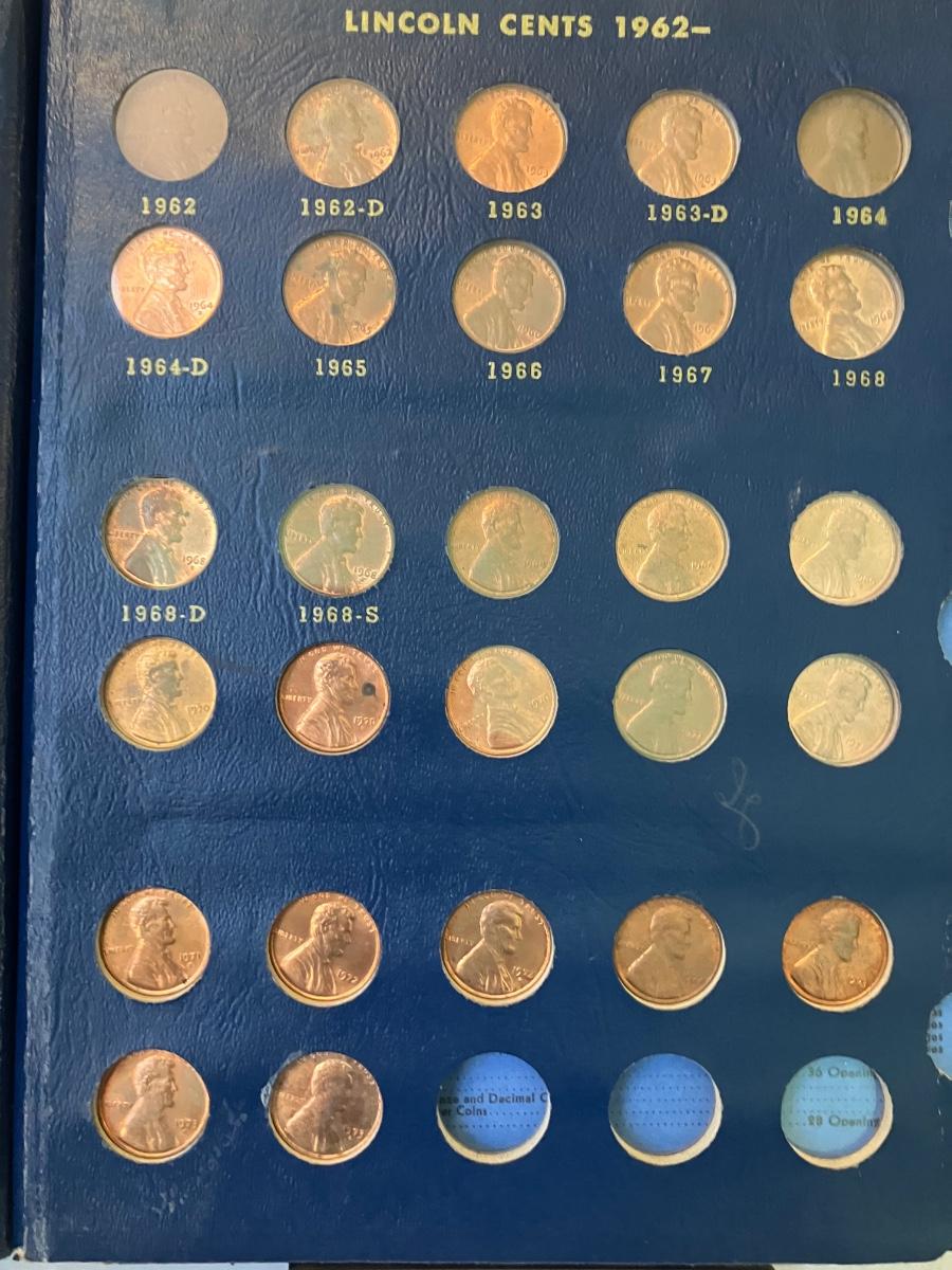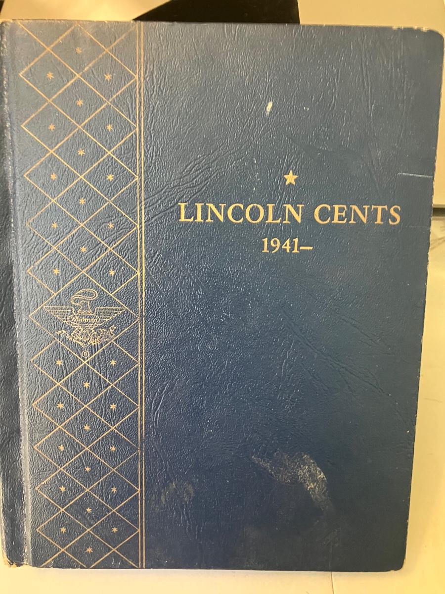This classic hardcover coin album, published by the Coin and Currency Institute, Inc. (New York), features a patriotic blue cover with gold lettering, stars, and an eagle emblem. Designed for Lincoln cents starting from 1941 (covering late Wheat reverse through Memorial reverse designs, likely into the 1970s or later), it is a premium vintage holder from the mid-20th century era—more substantial than standard Whitman folders. The album shows age-related wear (scuffs, marks, and edge wear) but remains solid and functional. Described as nearly complete, it holds most circulated coins from this period, including common dates, mint marks (P, D, S), and wartime steels—ideal for nostalgia or as a filler set for Lincoln penny enthusiasts.
