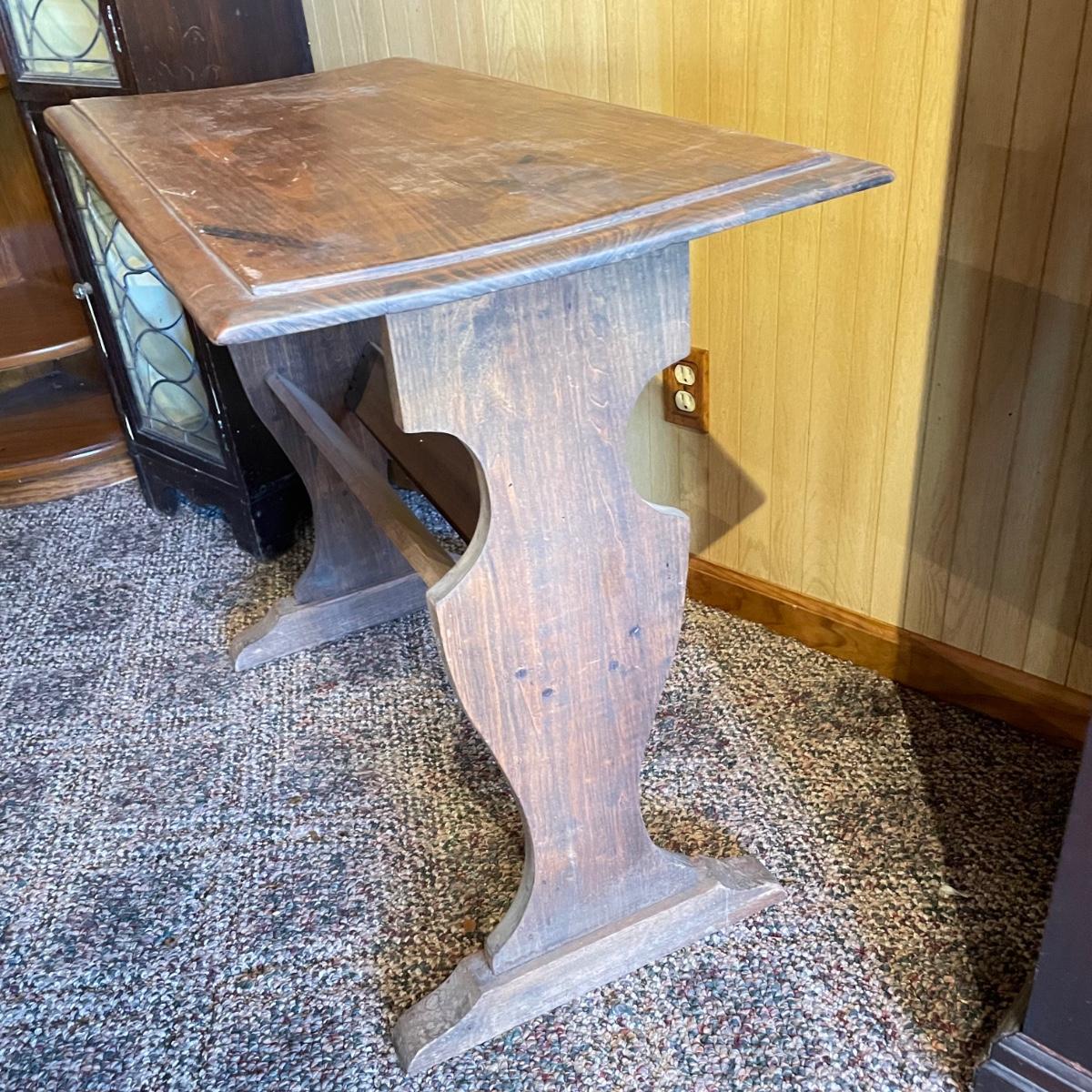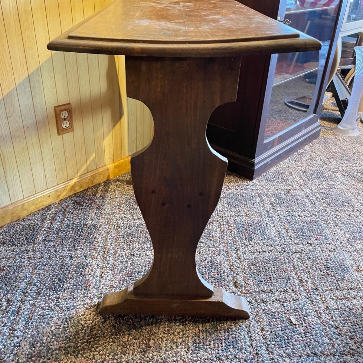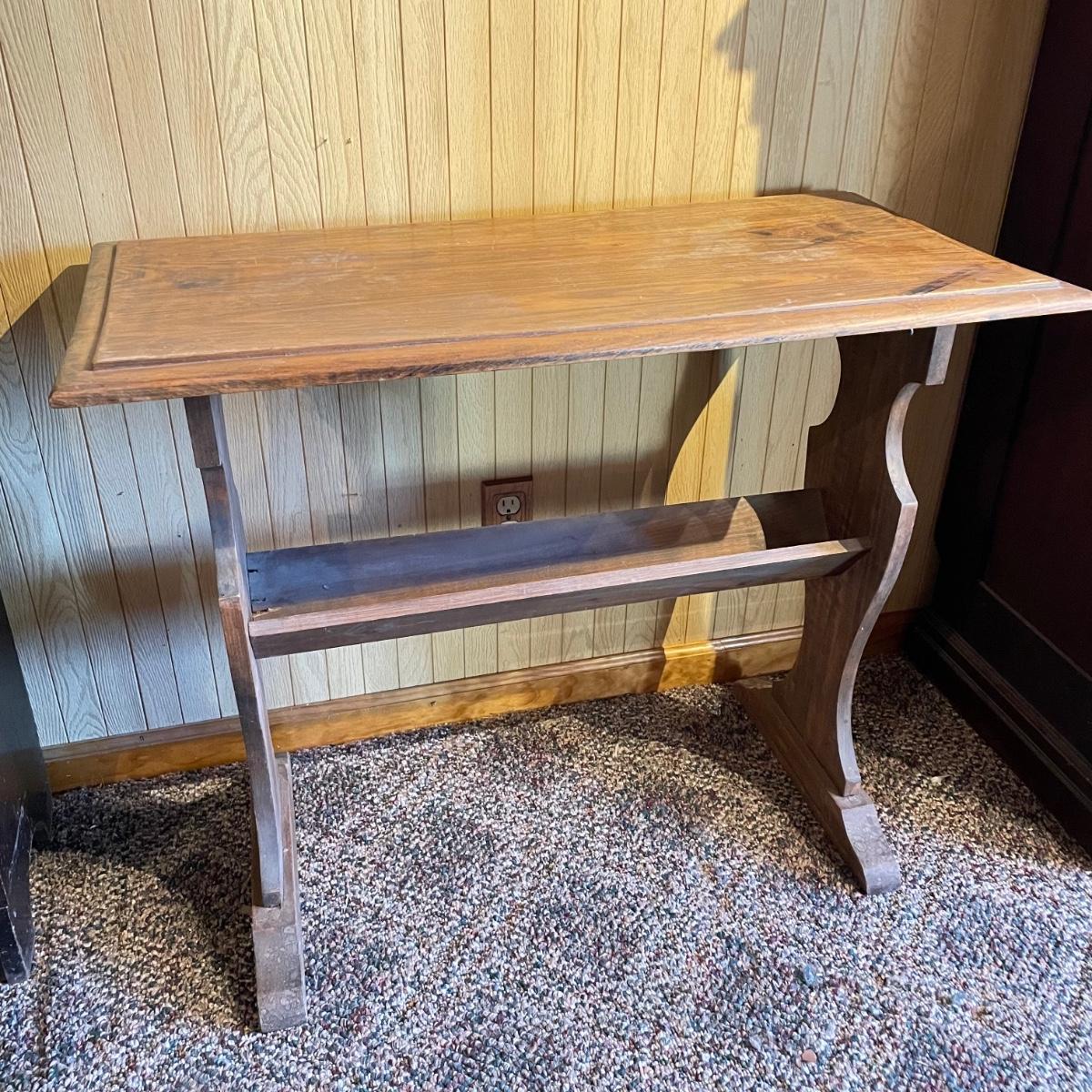 Simple and elegant vintage library table. This piece is solid wood and in very nice shape. The tabletop has a slight bow in the top on the left side of the image. The under shelves are securely in place. Table measures 35.5” x 17.5” x 30”. See images. Local pick up only.