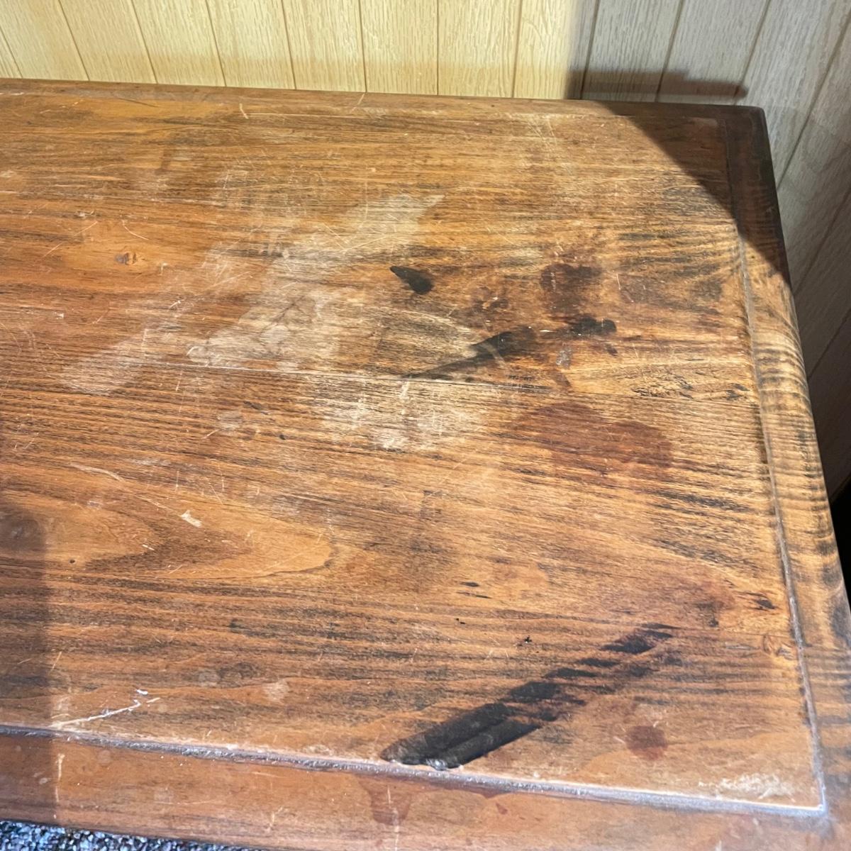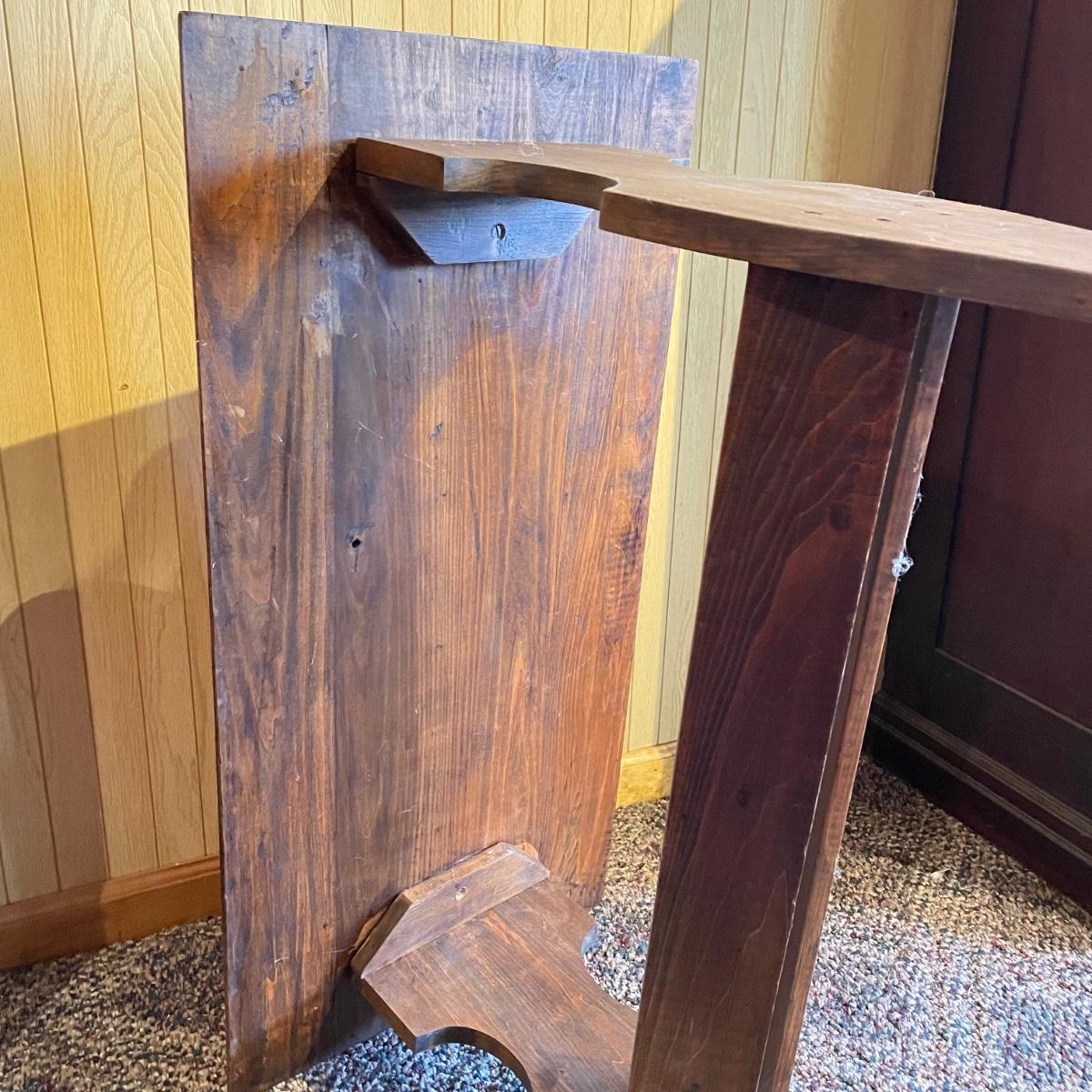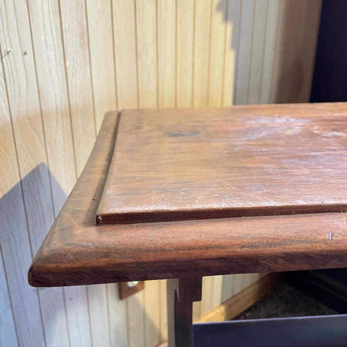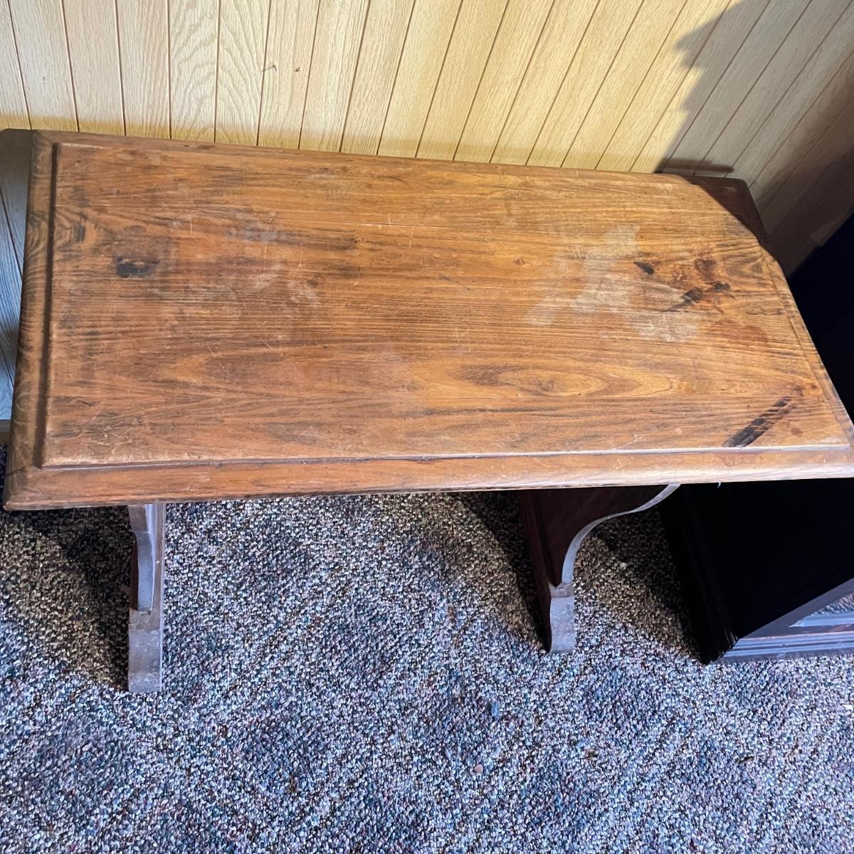 Simple and elegant vintage library table. This piece is solid wood and in very nice shape. The tabletop has a slight bow in the top on the left side of the image. The under shelves are securely in place. Table measures 35.5” x 17.5” x 30”. See images. Local pick up only.