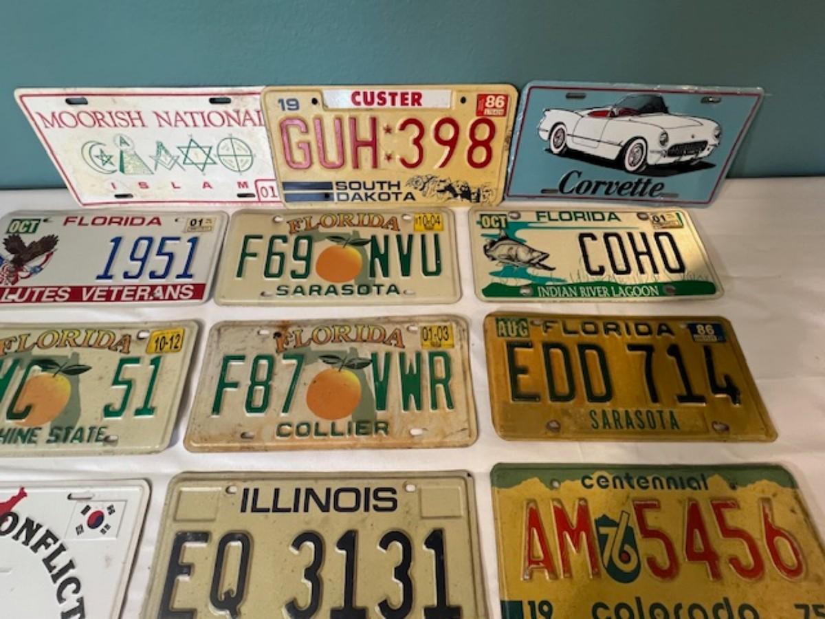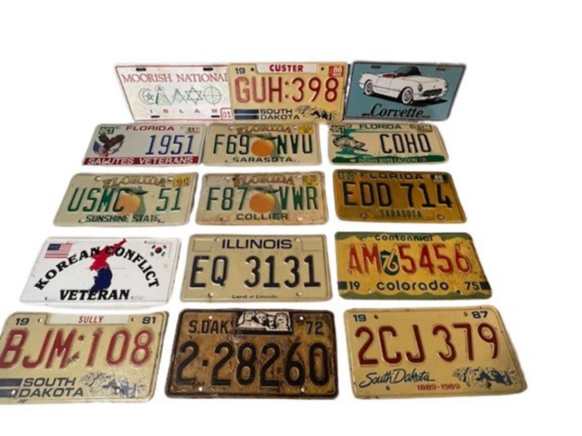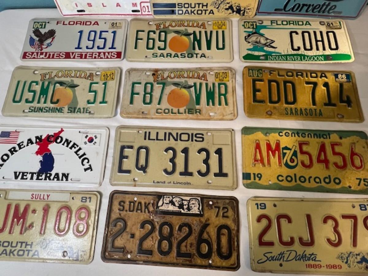 States include Florida, Illinois, South Dakota, and Colorado. Also includes some vanity plates. Age related wear. Various dates. Total of 15 pieces. Measurement: 12" x 7".