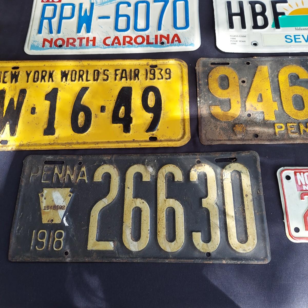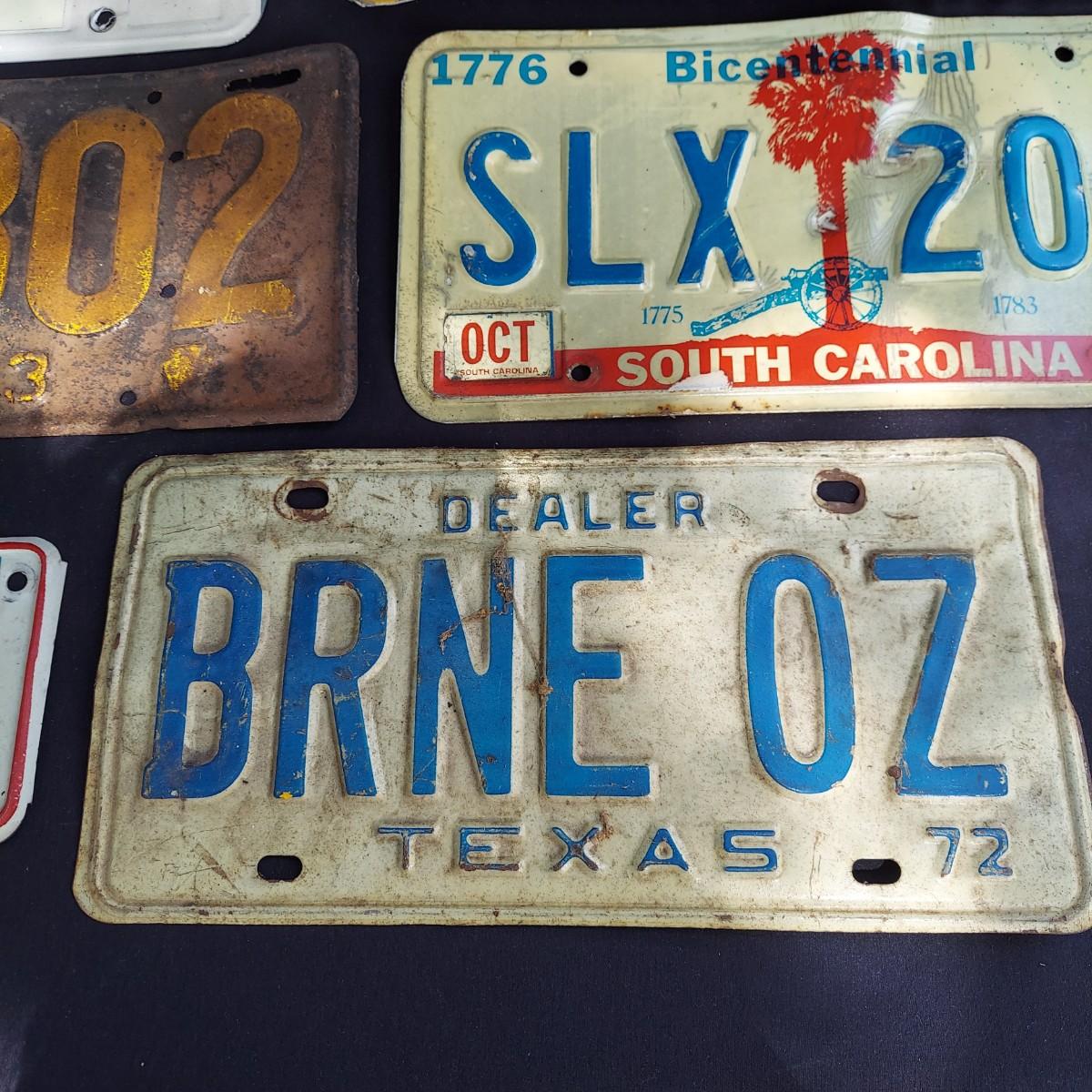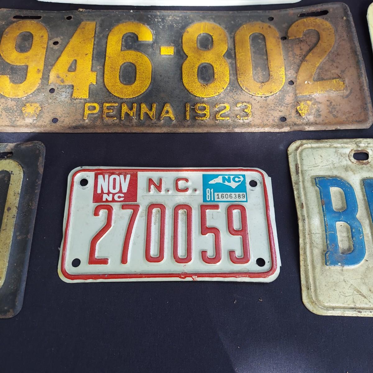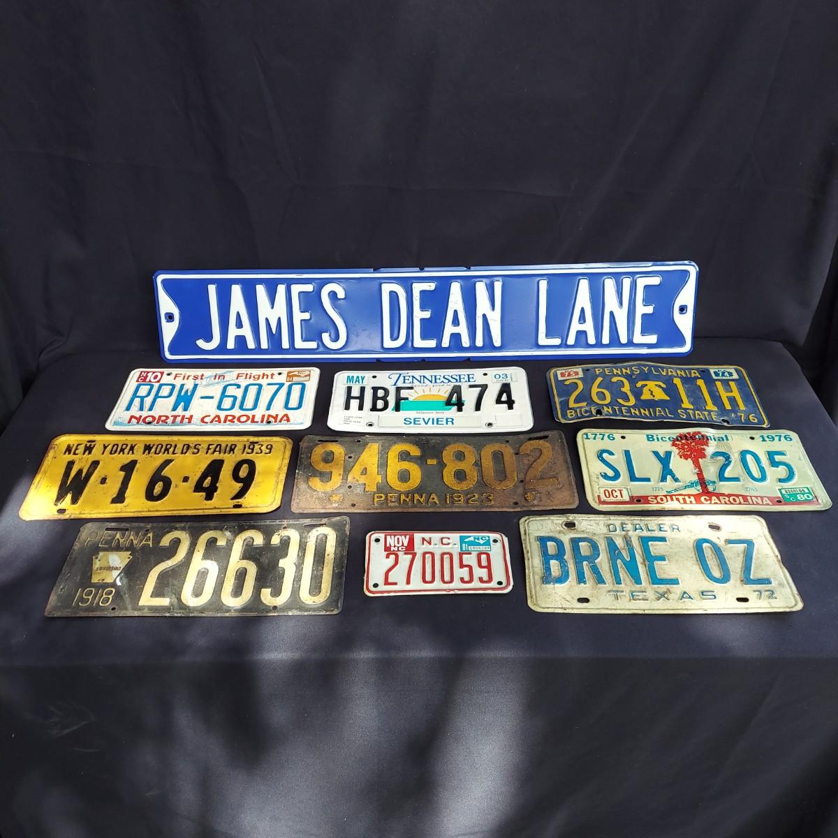 Lot includes nine vintage license plates multiple states plus a James Dean Lane replica street sign. The motorcycle place measures 7" x 4"H. The street sign measures 34" x 6"H. Shipping available