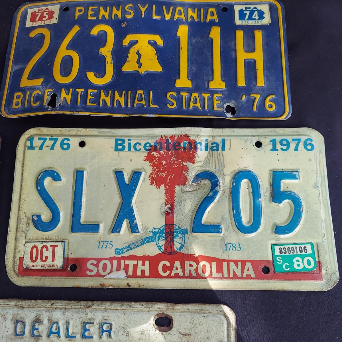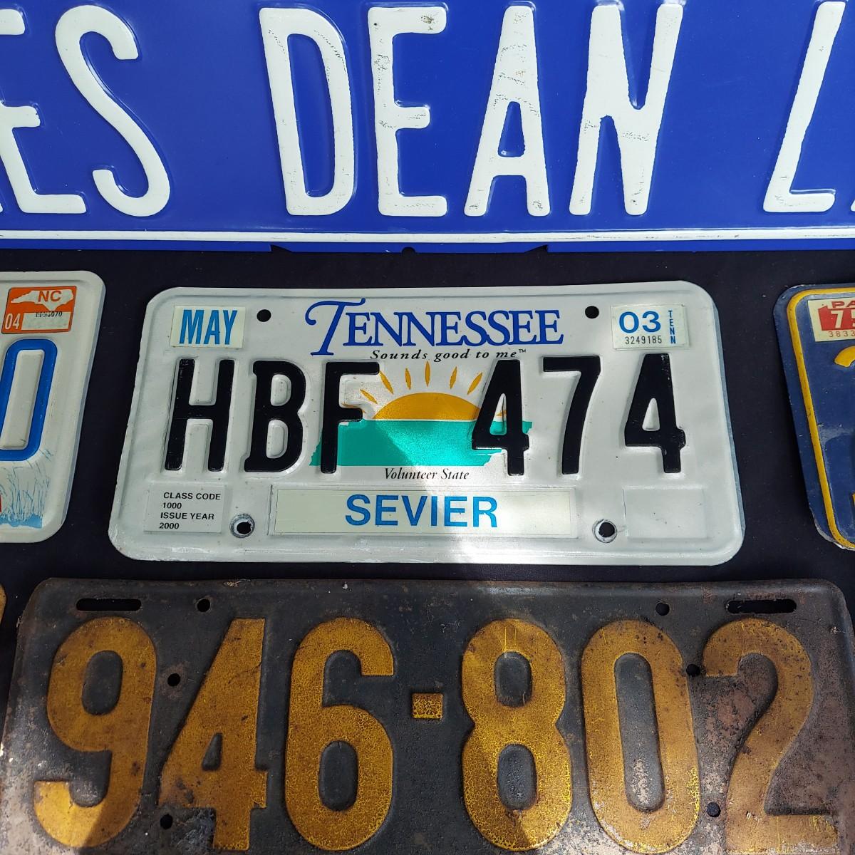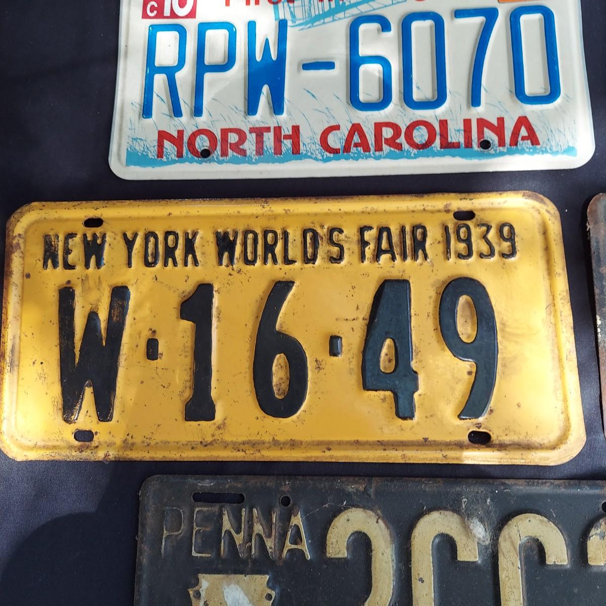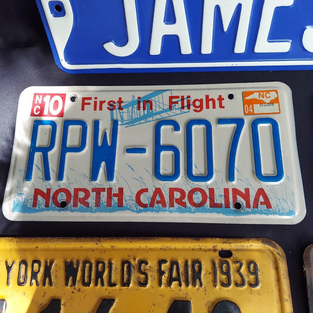 Lot includes nine vintage license plates multiple states plus a James Dean Lane replica street sign. The motorcycle place measures 7" x 4"H. The street sign measures 34" x 6"H. Shipping available