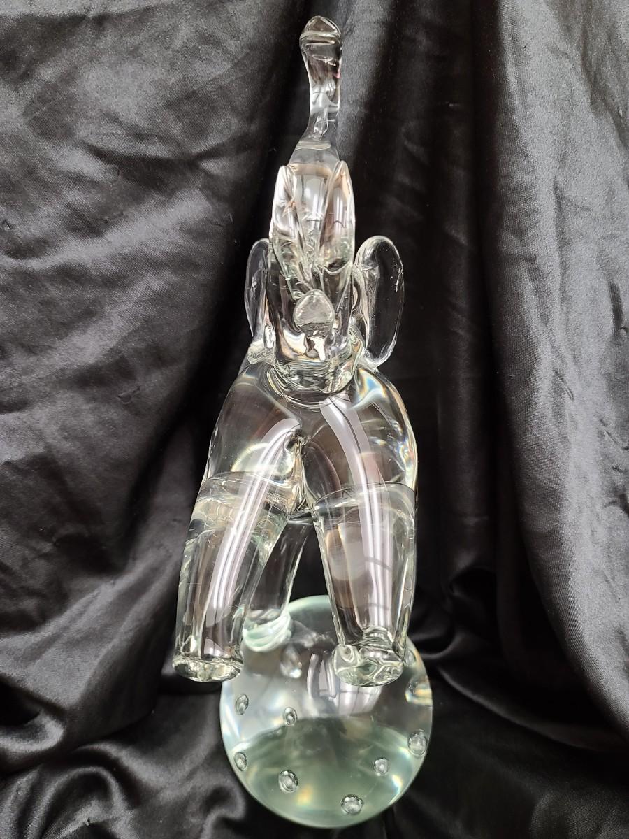 Standing an impressive 16 inches tall and weighing approximately 11 pounds, this radiant glass elephant rises on one leg atop a crystal sphere, an image of both strength and lightness. The base features the intricate bullicante technique—controlled air bubbles suspended perfectly within the glass—creating a mesmerizing effect as light passes through. Every curve, from the outstretched trunk to the sculpted ears and dynamic stance, showcases the artisan precision and sculptural grace that define Murano’s finest works.