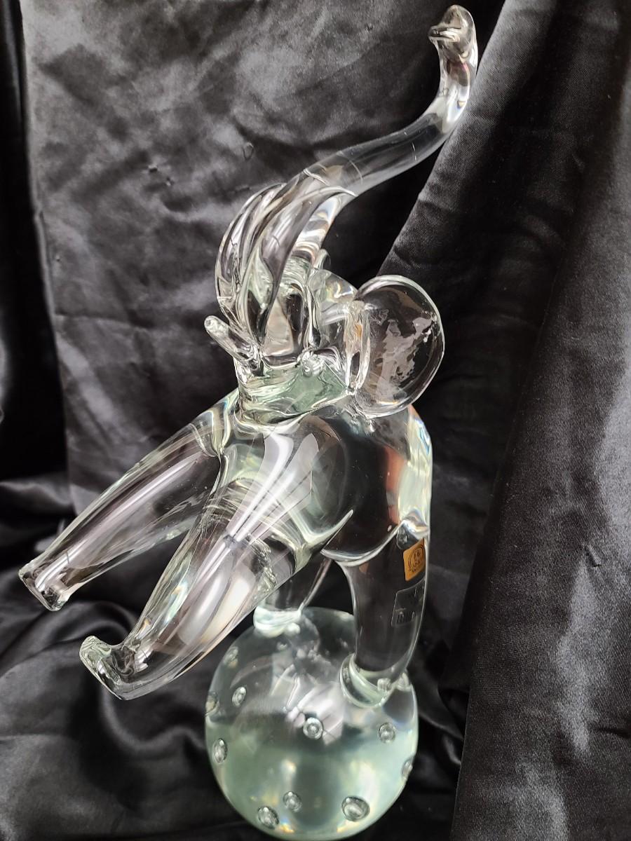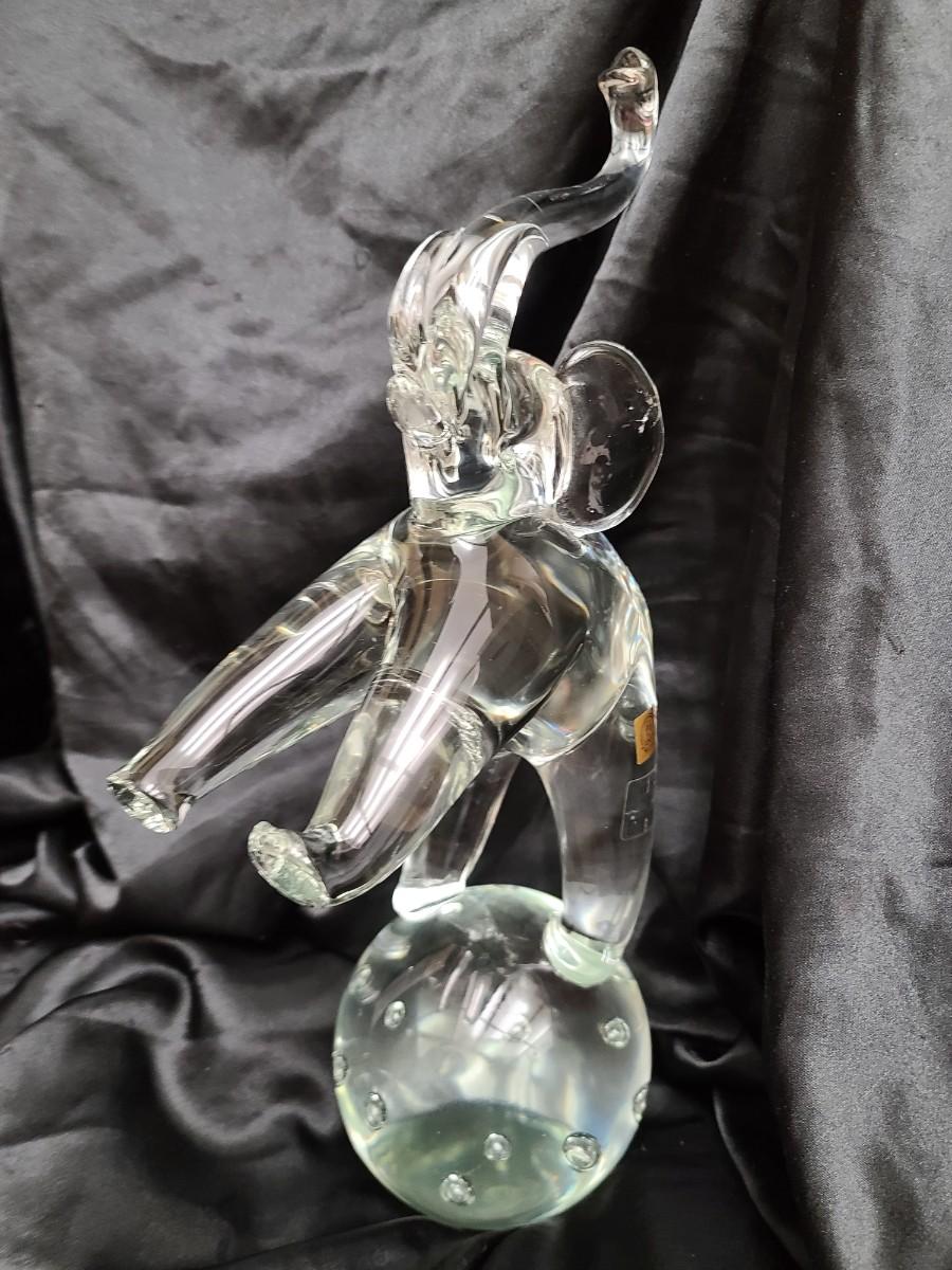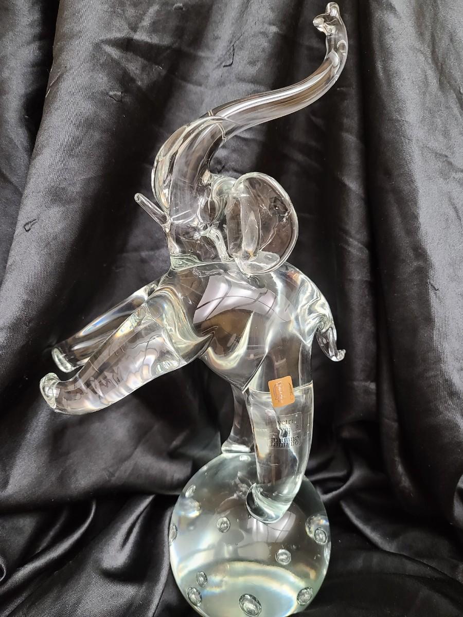 Standing an impressive 16 inches tall and weighing approximately 11 pounds, this radiant glass elephant rises on one leg atop a crystal sphere, an image of both strength and lightness. The base features the intricate bullicante technique—controlled air bubbles suspended perfectly within the glass—creating a mesmerizing effect as light passes through. Every curve, from the outstretched trunk to the sculpted ears and dynamic stance, showcases the artisan precision and sculptural grace that define Murano’s finest works.