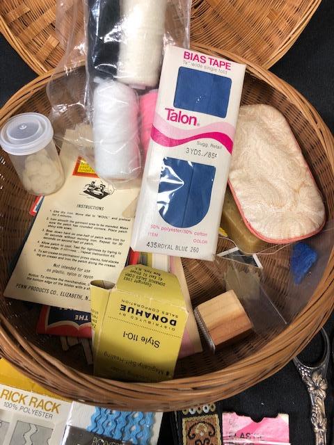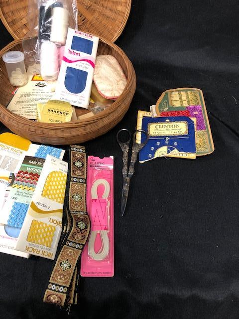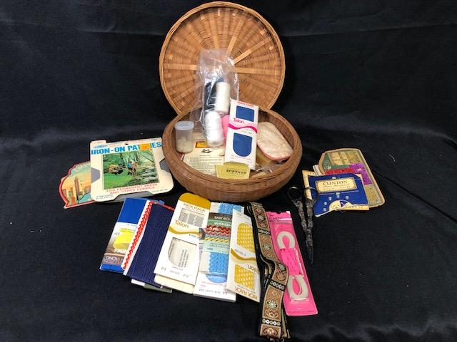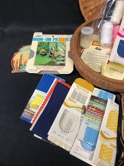 Vintage wicker lidded basket of sewing supplies. Mix of items, all look to be vintage of some age by packaging. Everything pictured included. Rick rack, buttons, scissors, needles, and more.