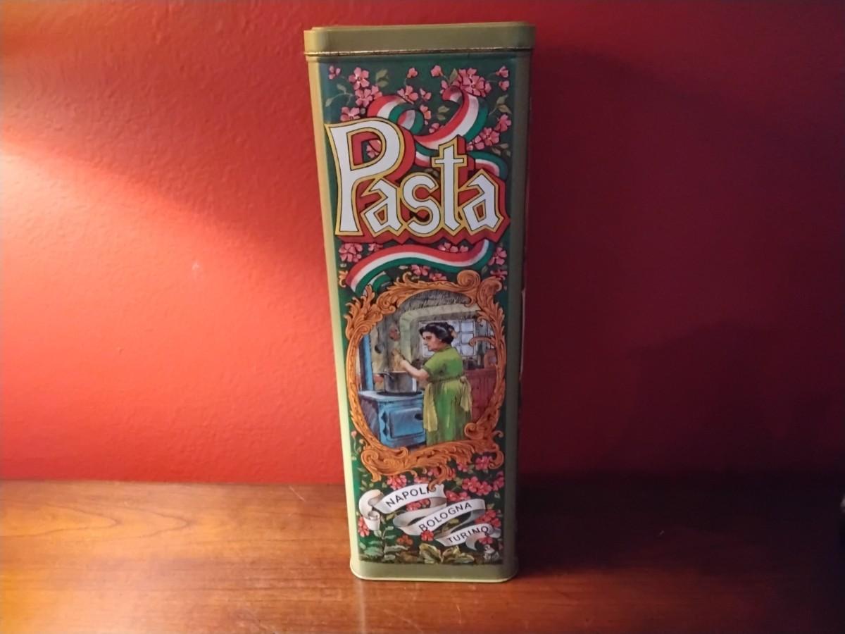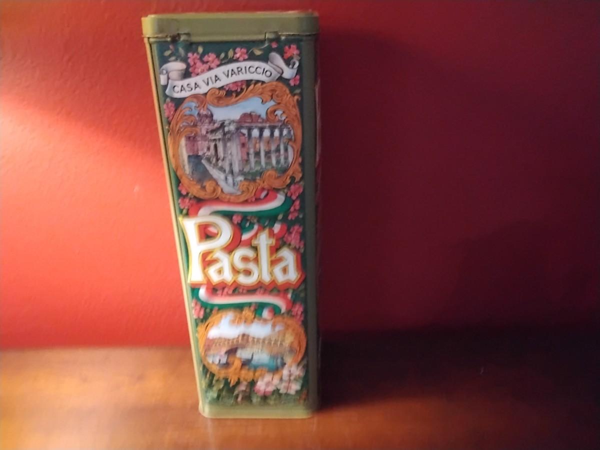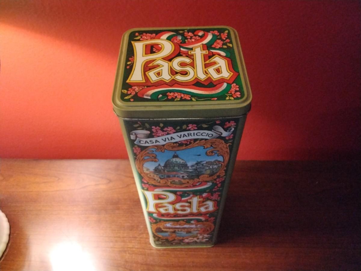 A Lidded Tin for pasta Measurin 12" tall with lid closed. Inside measurement is 11 1/2".