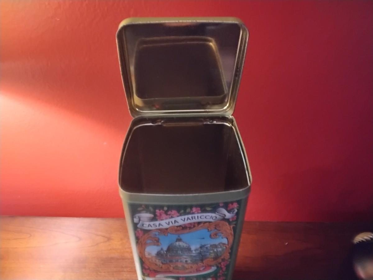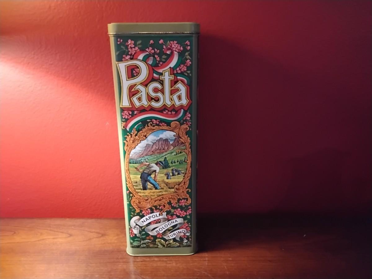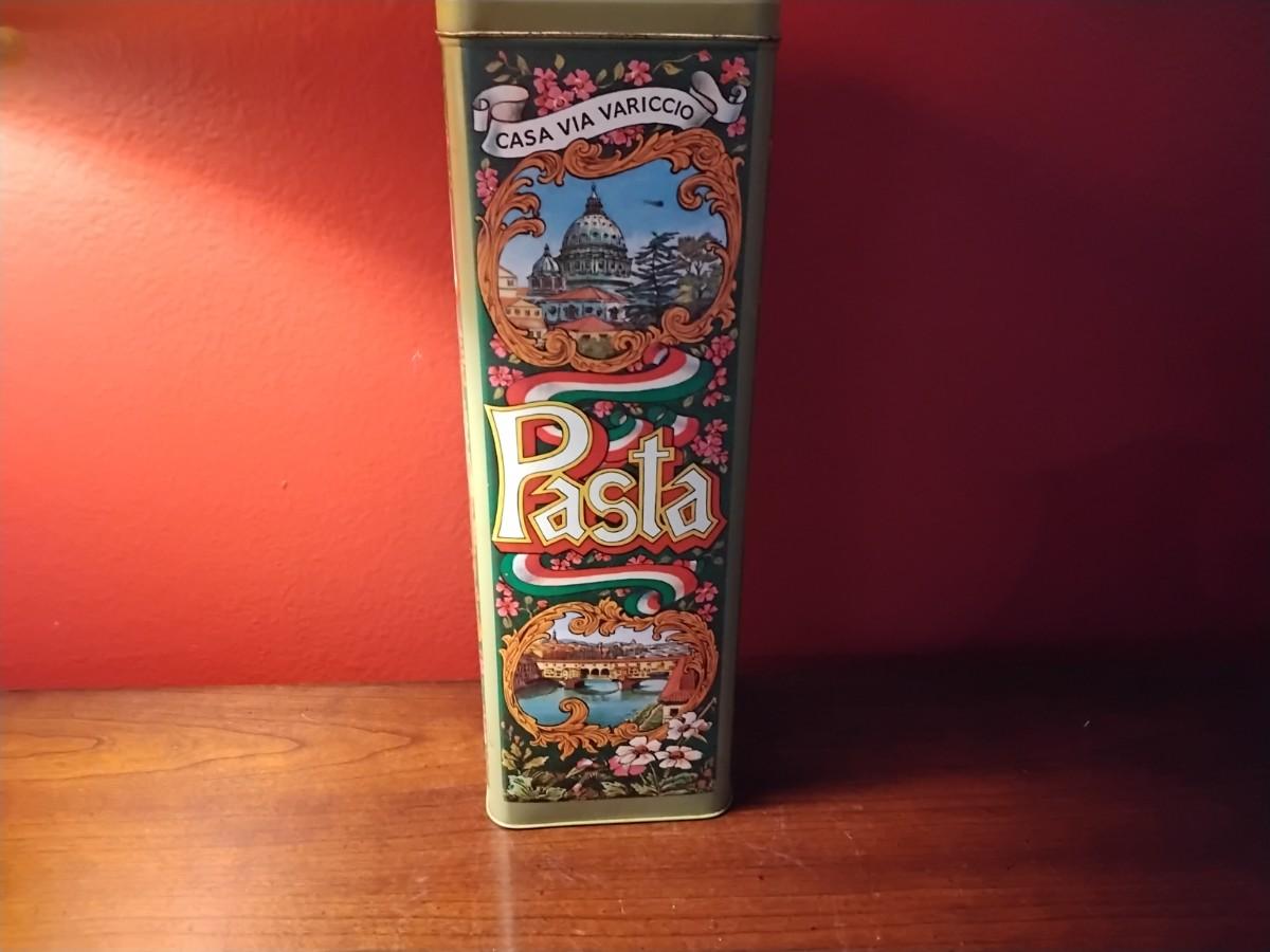 A Lidded Tin for pasta Measurin 12" tall with lid closed. Inside measurement is 11 1/2".