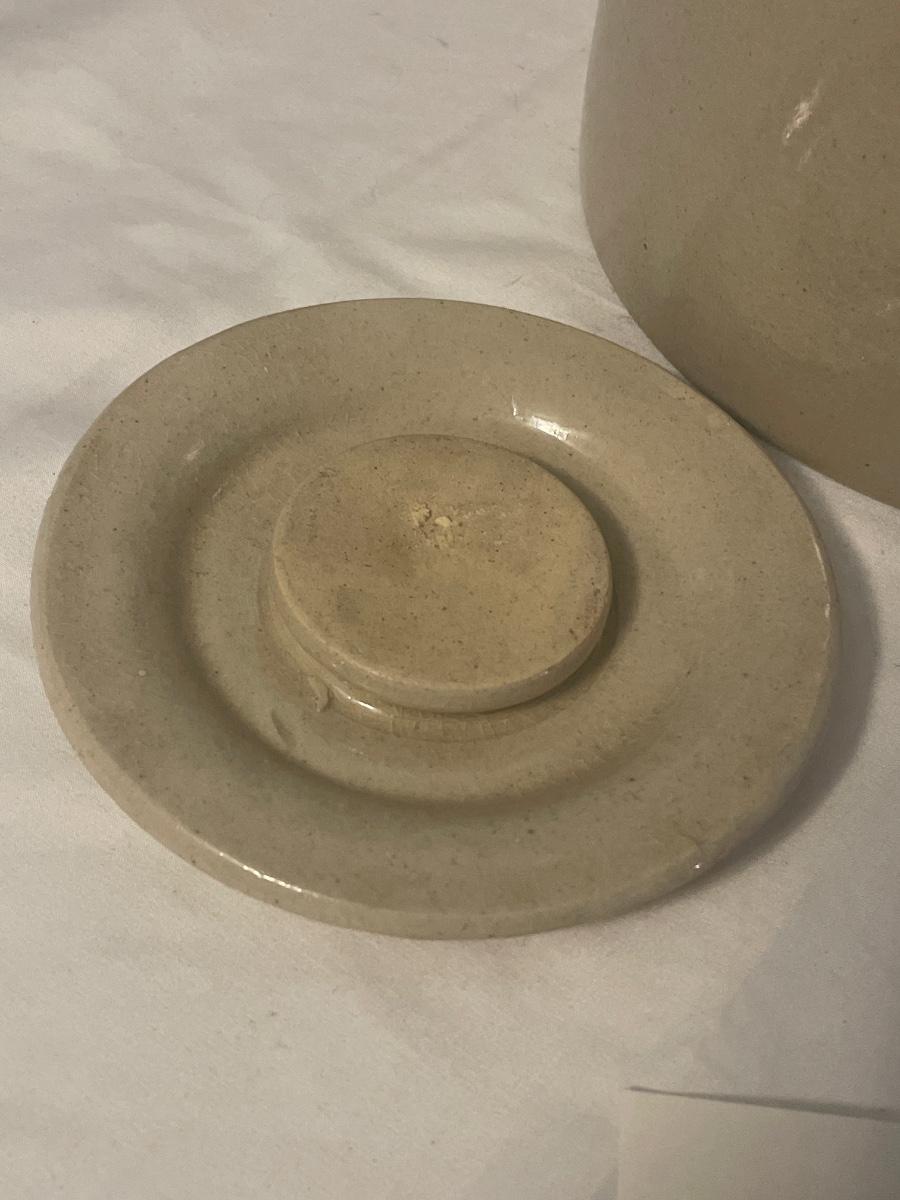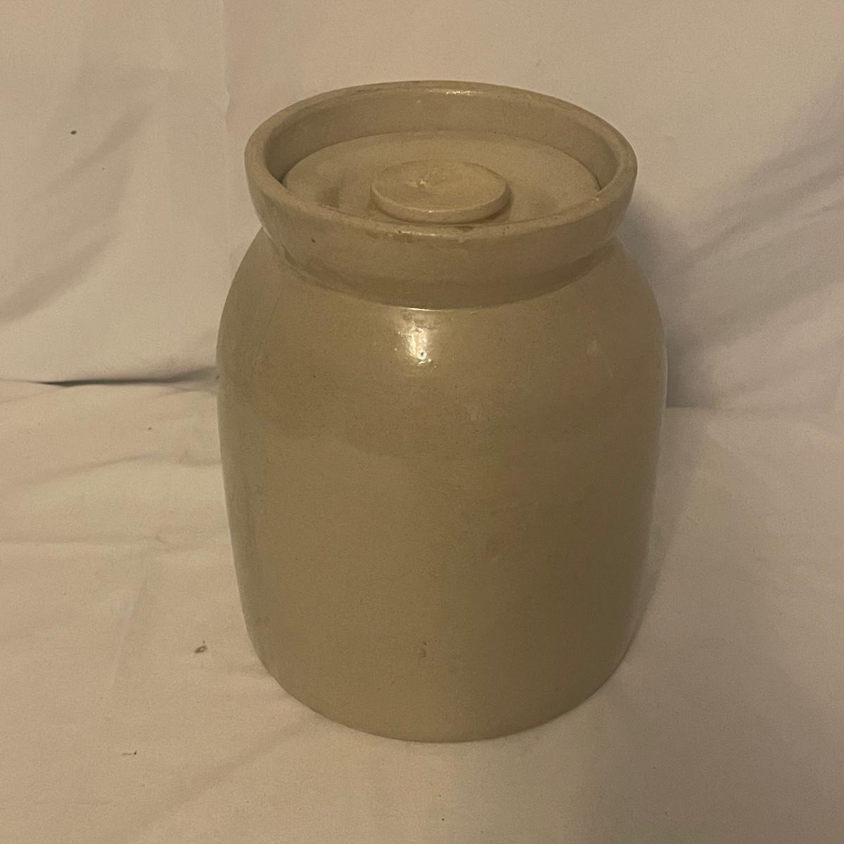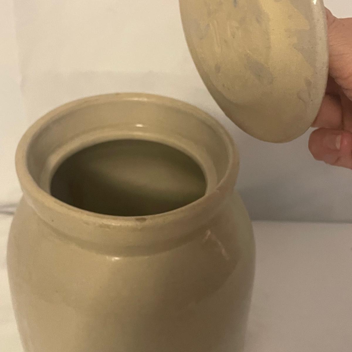 This lidded crock has a clear glaze and is in very good condition; there are tiny areas on the rim that are just slightly darker in color than the rest of the pot.