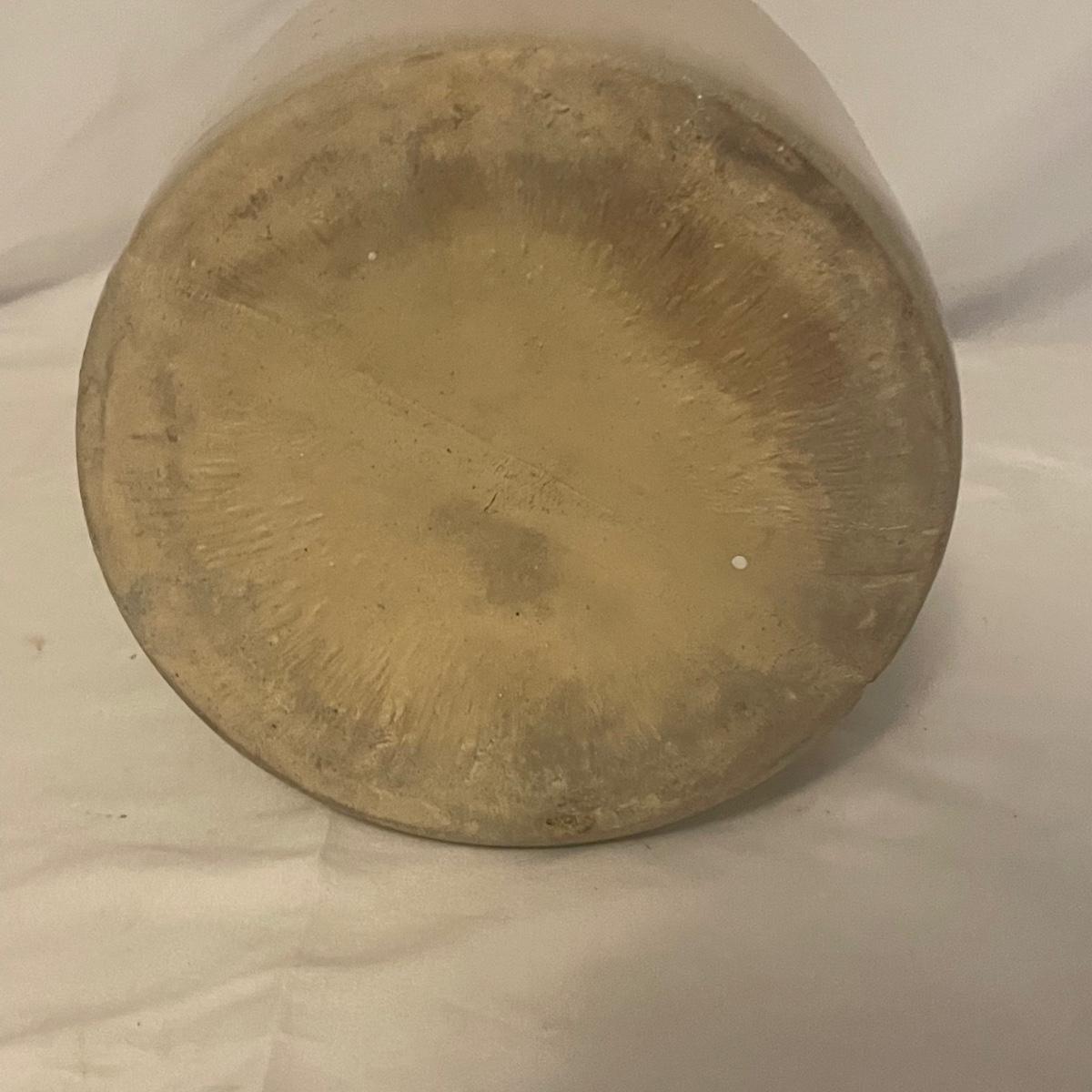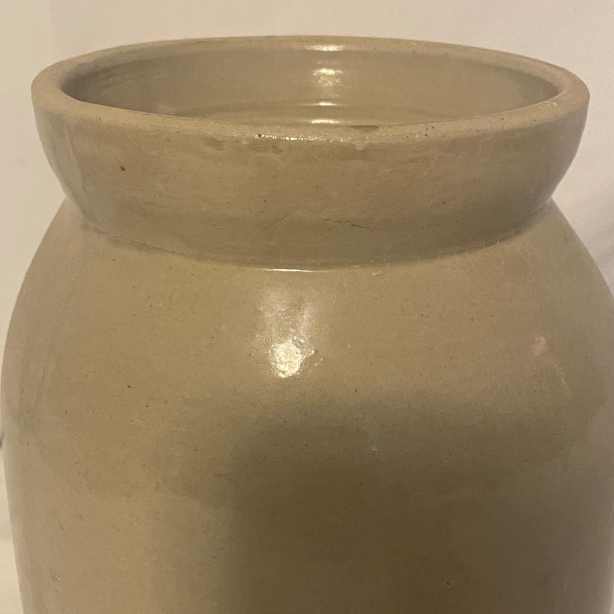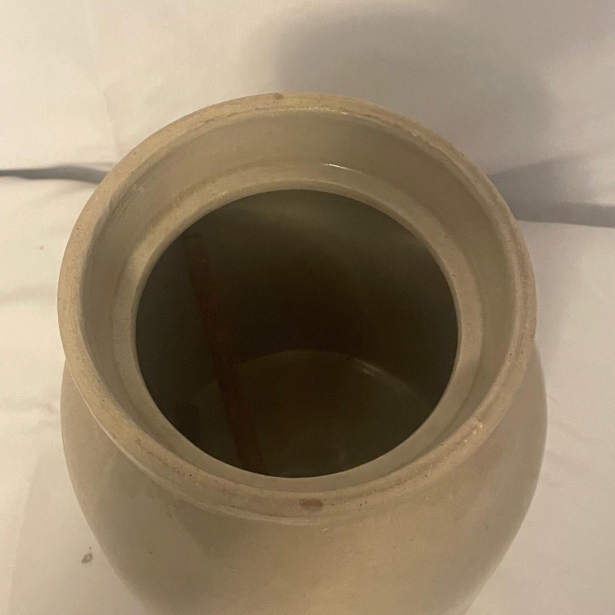 This lidded crock has a clear glaze and is in very good condition; there are tiny areas on the rim that are just slightly darker in color than the rest of the pot.
