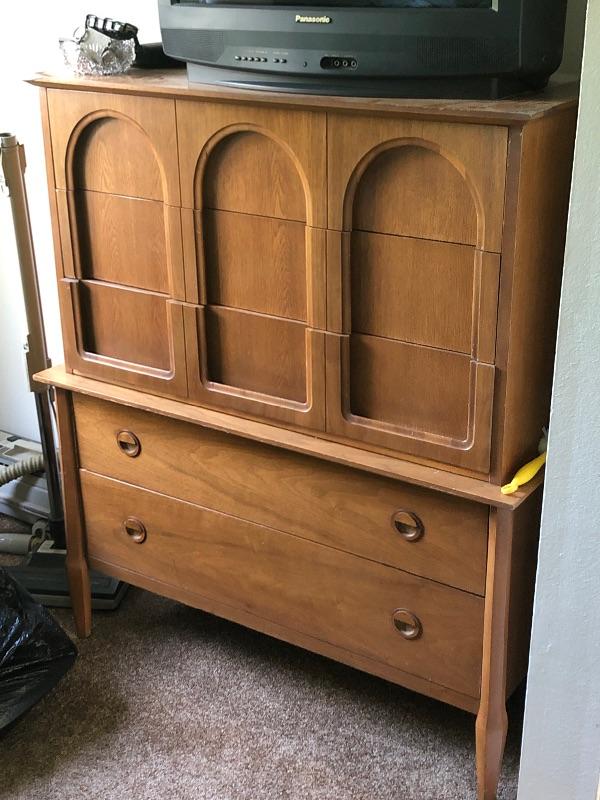 Mid Century Tall Dresser. Light finish. 5 drawers. No makers mark. Some signs of use. Stands 47" tall, is 39.5" wide and 18.5" deep.