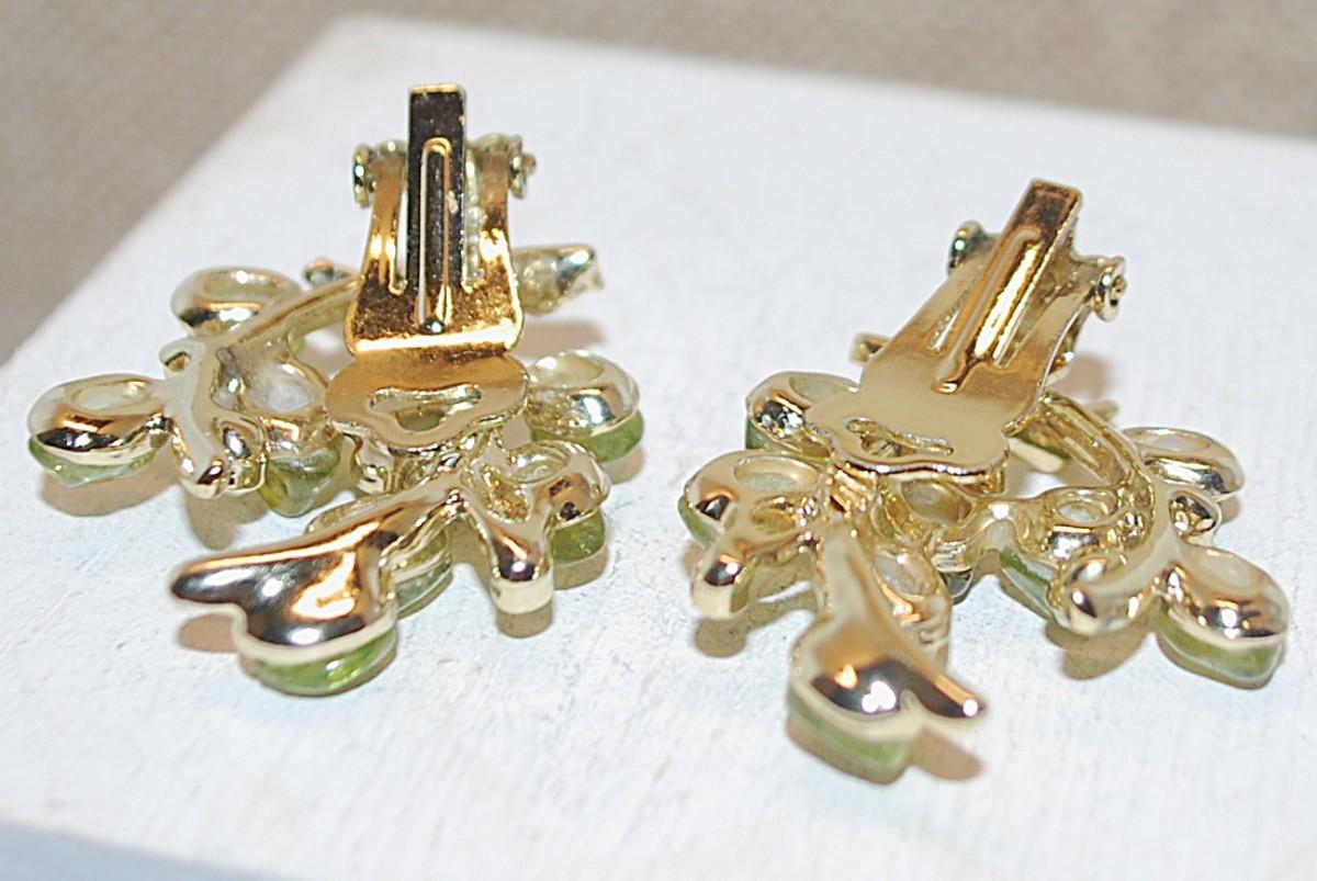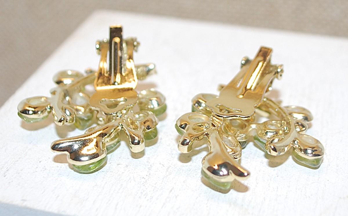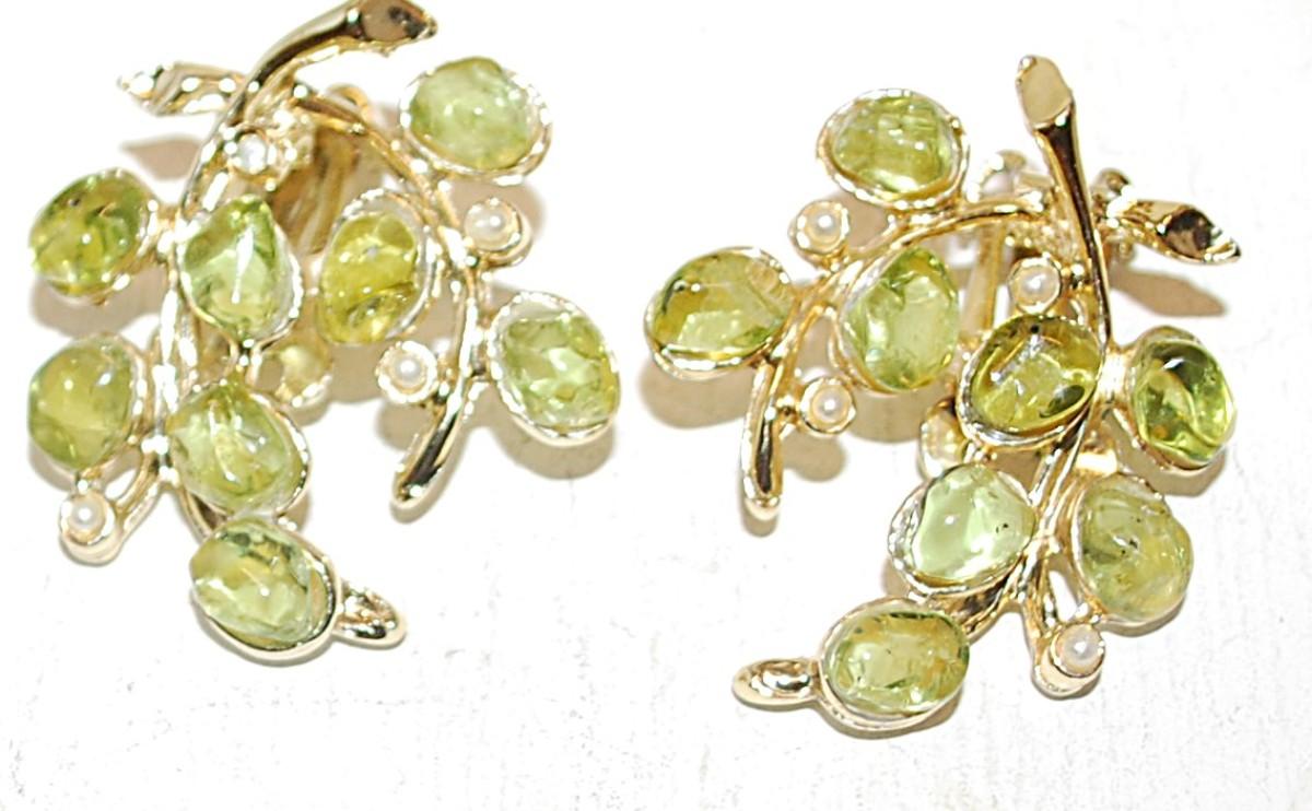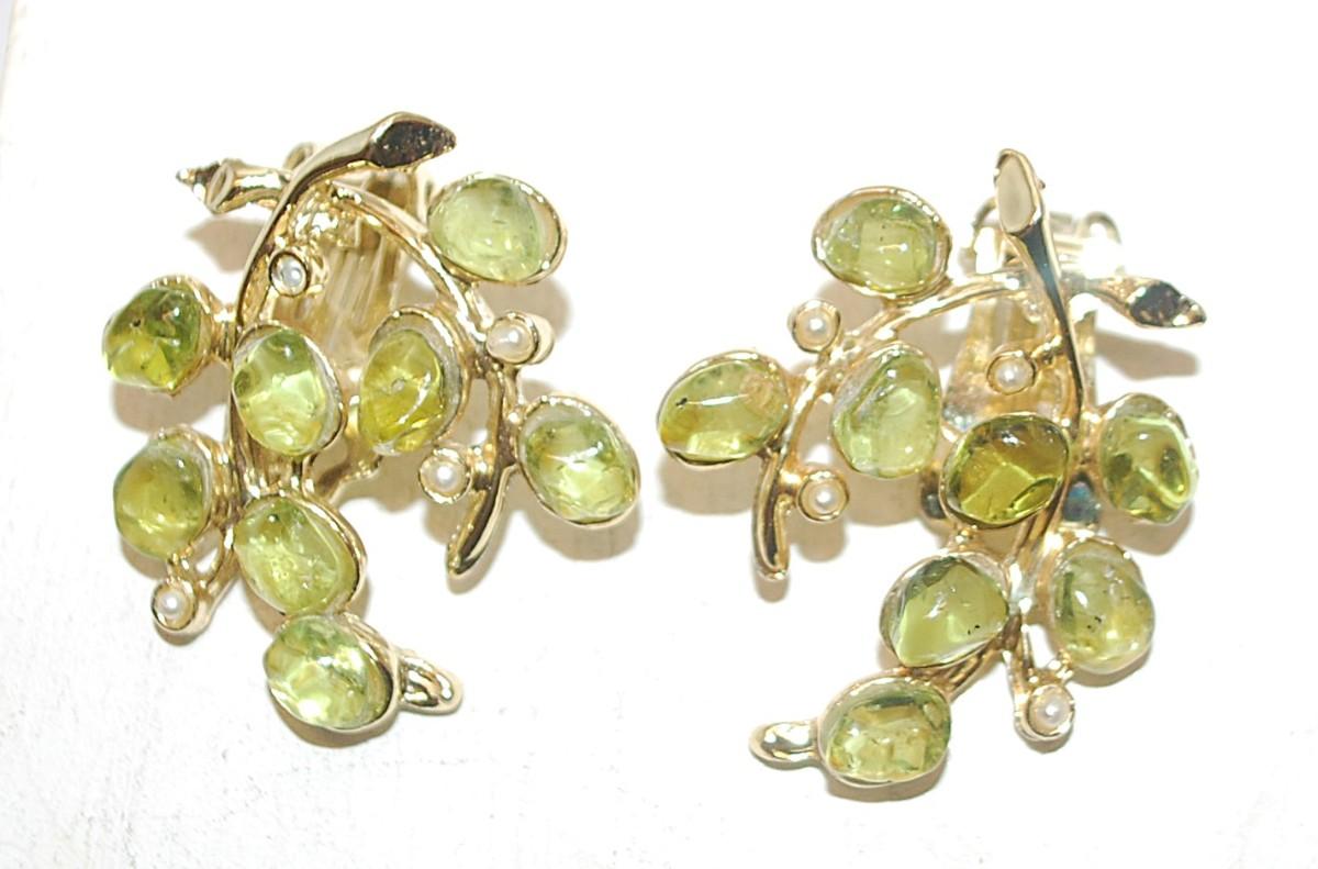 VINTAGE Light "Green Grape Bunch" Stones Earrings Set (1½") with 7 Tiny Faux Pearls with a Snap Clasp -- NOTE: ONE Faux Pearl Missing