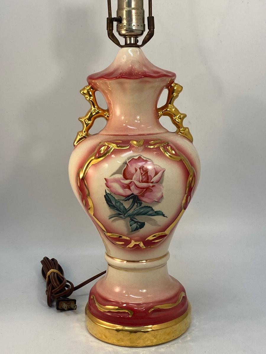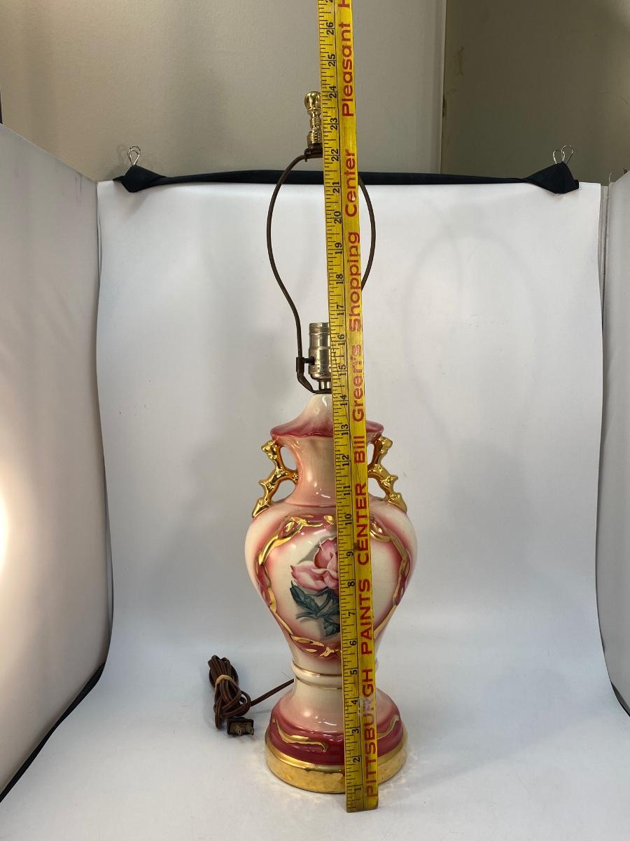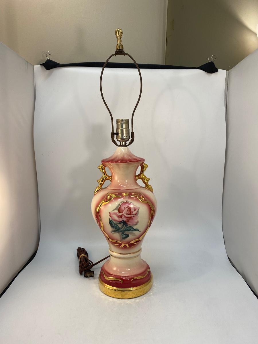 Vintage Light Pink Rose & Gold Gilt Table Lamp, Untested. In good vintage condition. No shade. There is crazing to the ceramic.