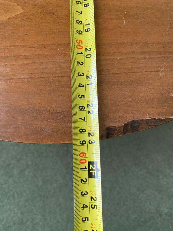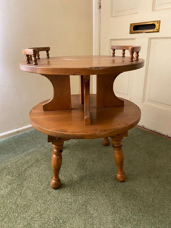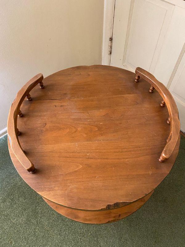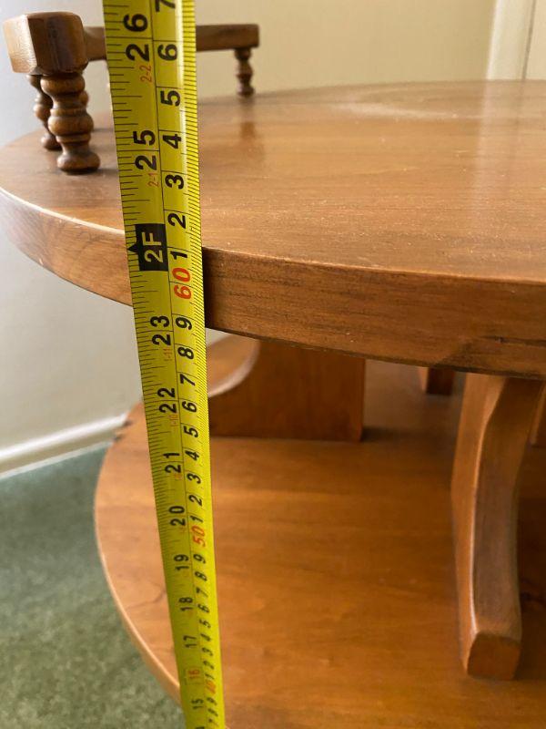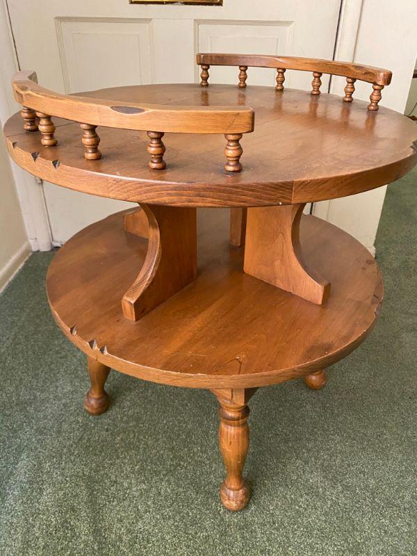 Vintage round light wood side table. Double surface. About 23" wide and 24" tall. Does have signs of age. There is a crack in the top wood surface. Could still be used as is or refinished.