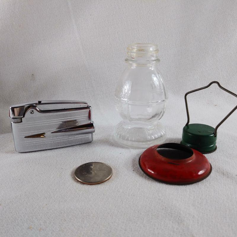 Old small bottle that looks like a little lantern and is surely a vintage candy container. It has embossed on glass "Certified Colors & Flavors" on one side and on other side "Sugar Starch Corn-Syrup. It is 3-inches tall plus handle and 2-inches in diameter. No cracks or chips, metal lid and cap show some wear consistent with age. Maybe an odd pairing but we think it will be a neat find for most any reseller.