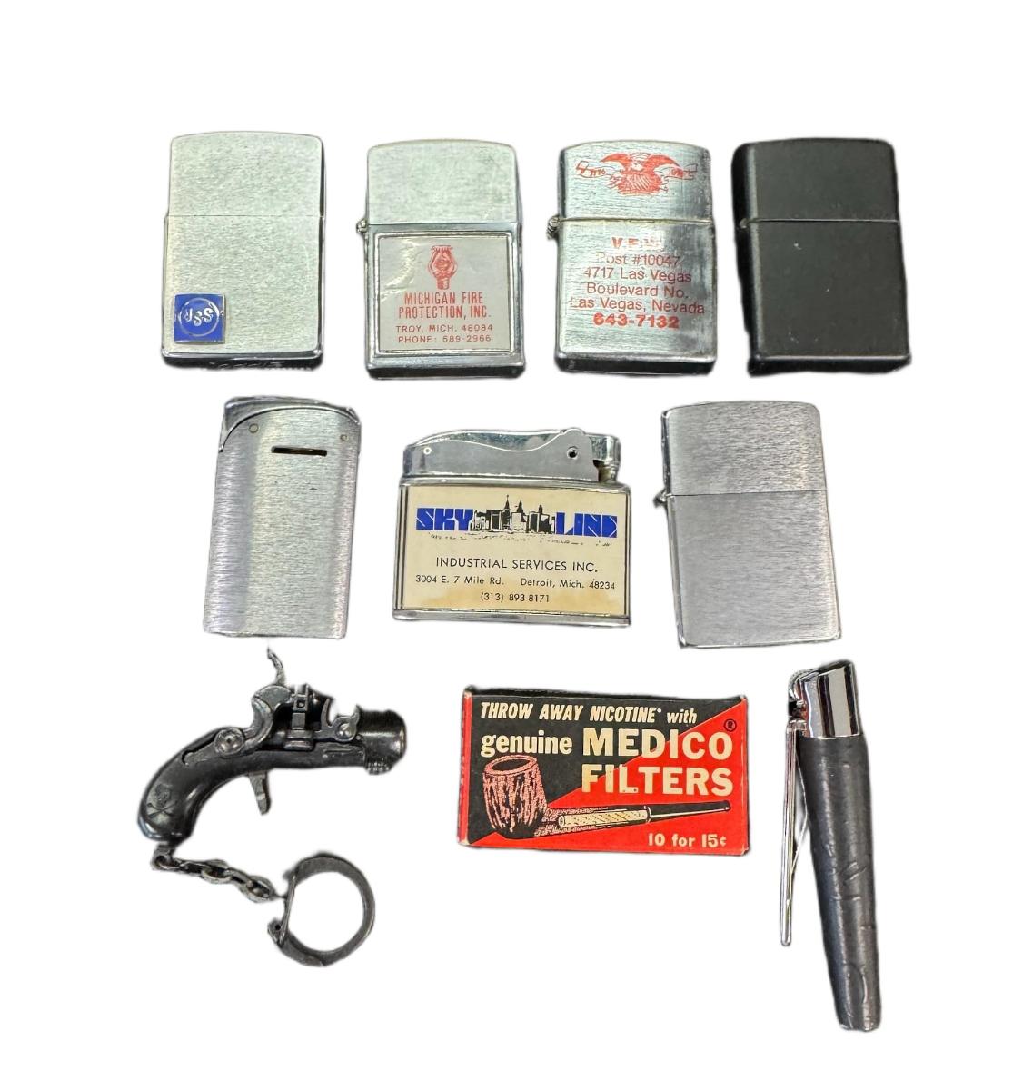 Includes Zippo, and more. Total of eight-plus pieces. Not tested. [JP]