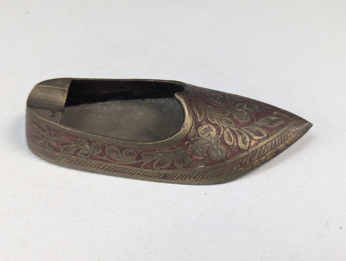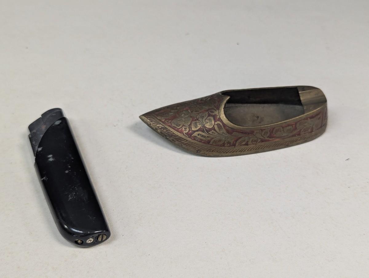 Vintage Lighter & Old Brass Ashtray Shoe Shape Inlay Engraved Handcrafted