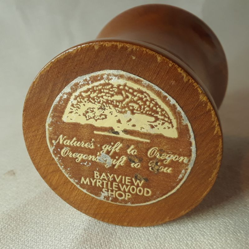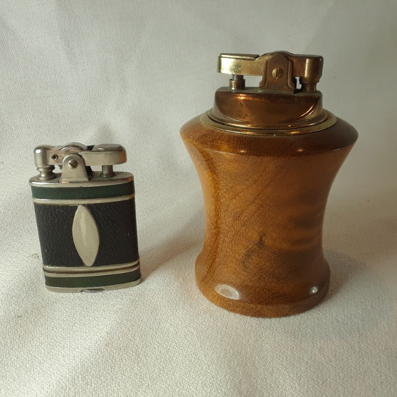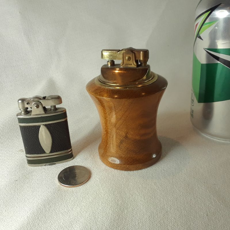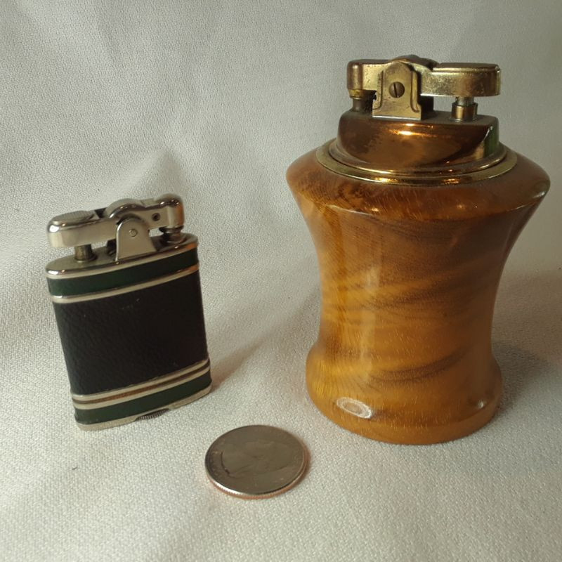 The other is made of Myrtlewood with coppertone lighter insert marked Japan. The bottom is worn and scuffed but nothing else is. Bottom states "Nature's gift to Oregon, Oregon's gift to you" Bayview Myrtlewood Shop. Untested. Both lighters look to be complete.