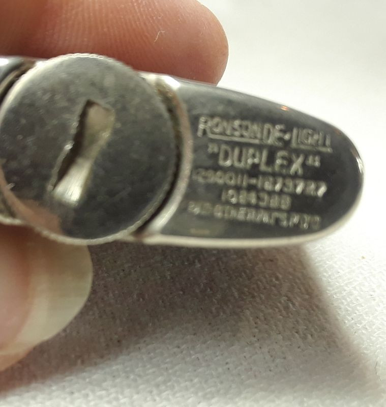 Two nice old lighters. The smaller one is covered in what looks to be black and green leather. Marked on bottom Ronson De-Light Duplex with a lot of numbers we could not read. Untested.