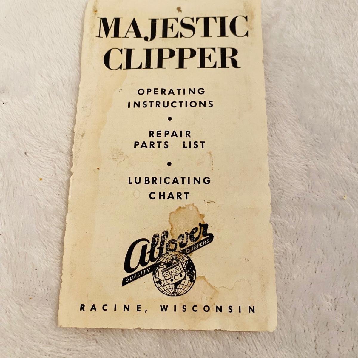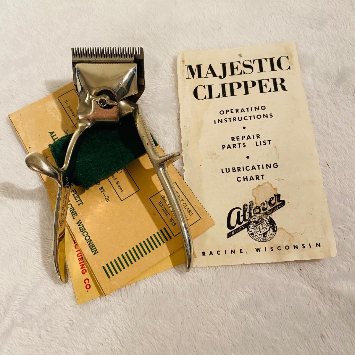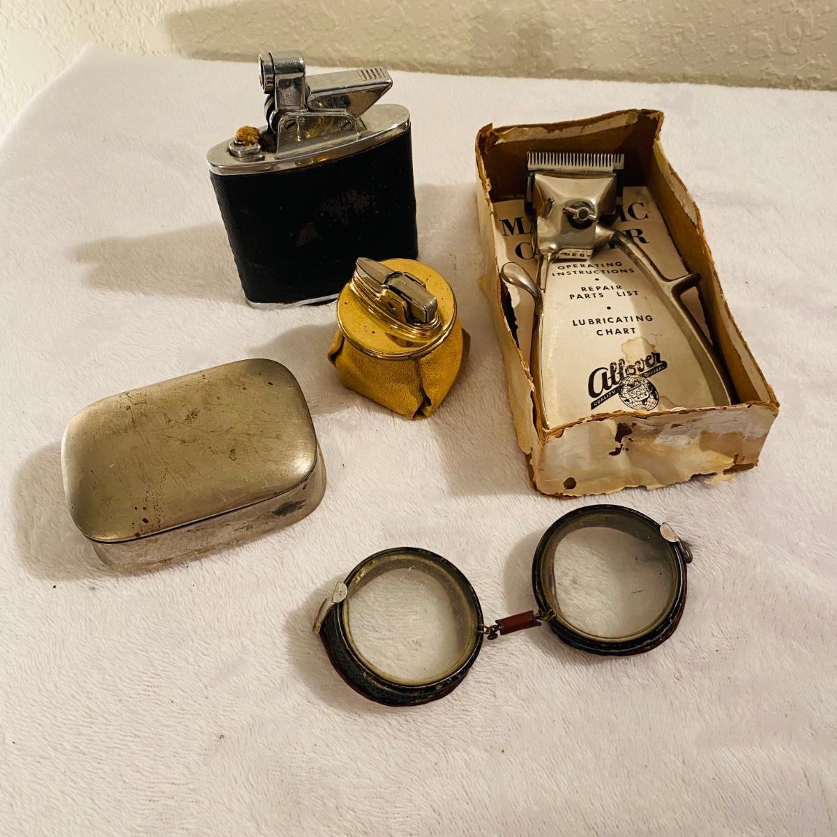 Lot includes 2” gold table top lighter, Majestic Clipper hair clippers by Allover Clippers in Racine, Wisconsin. “The Giant” black lighter with wick measures 4.5” x 3.5”. Aluminum soap dish measures 3.5” x 2.5”. Also included vintage safety goggles without strap.