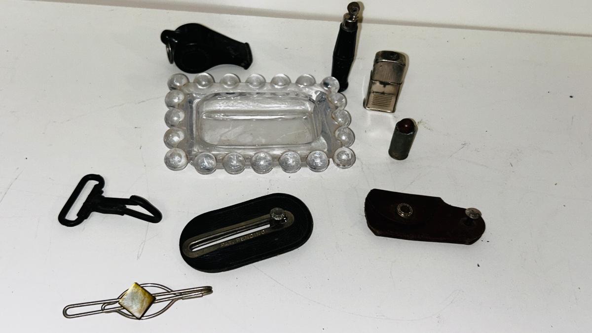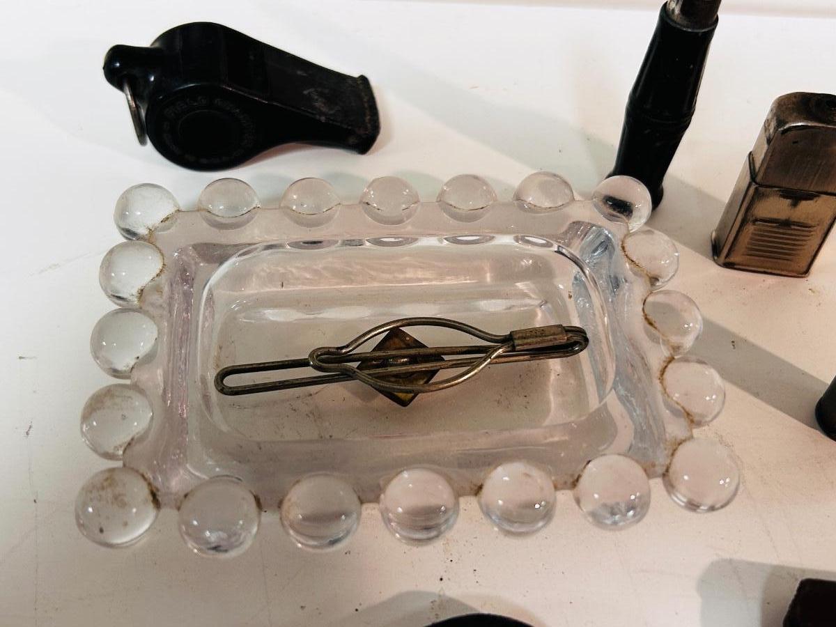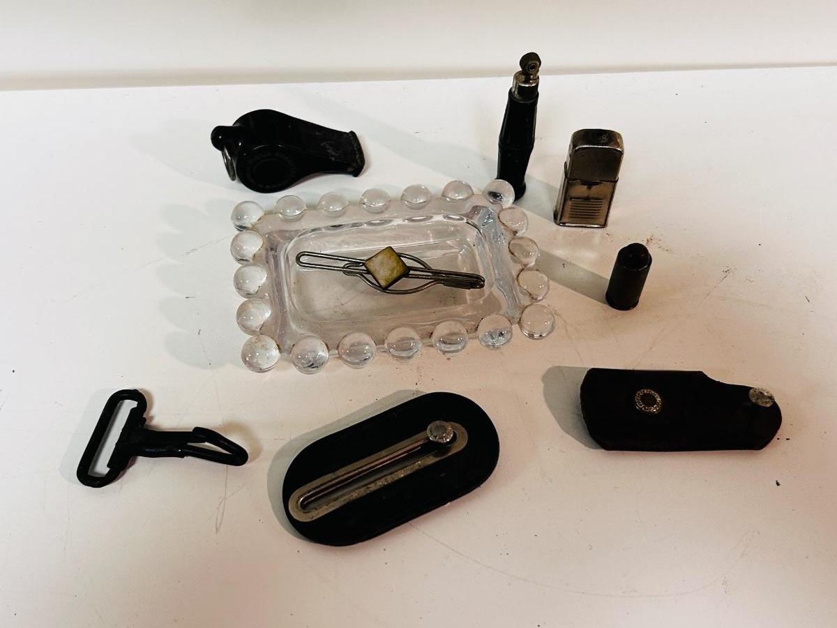 VINTAGE LIGHTERS, ASHTRAY, WHISTLE, TIE CLIP AND OTHER SMALL ITEMS