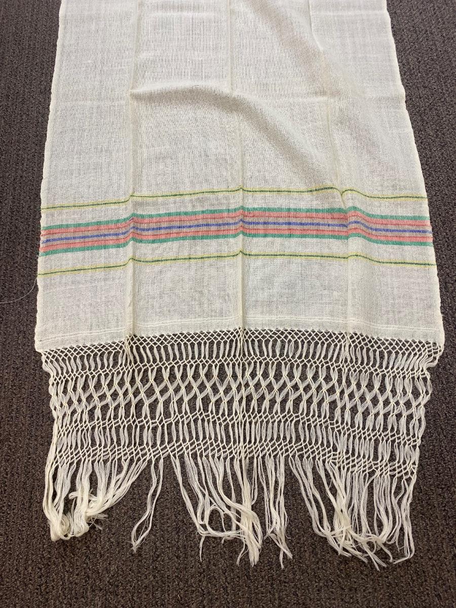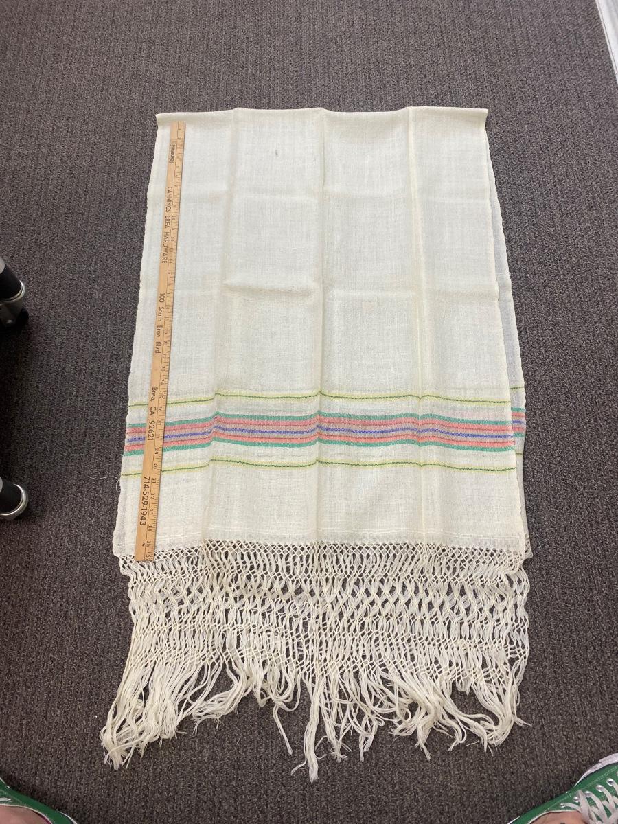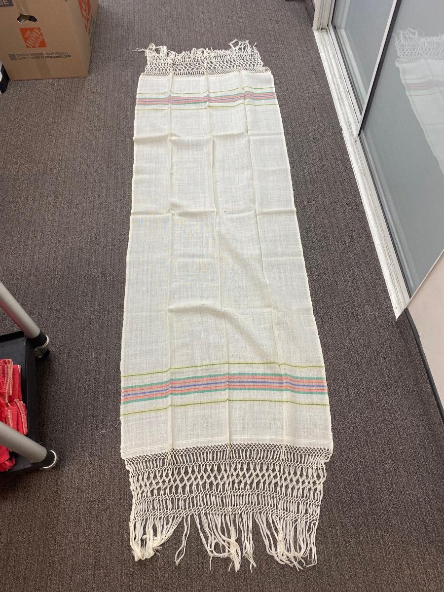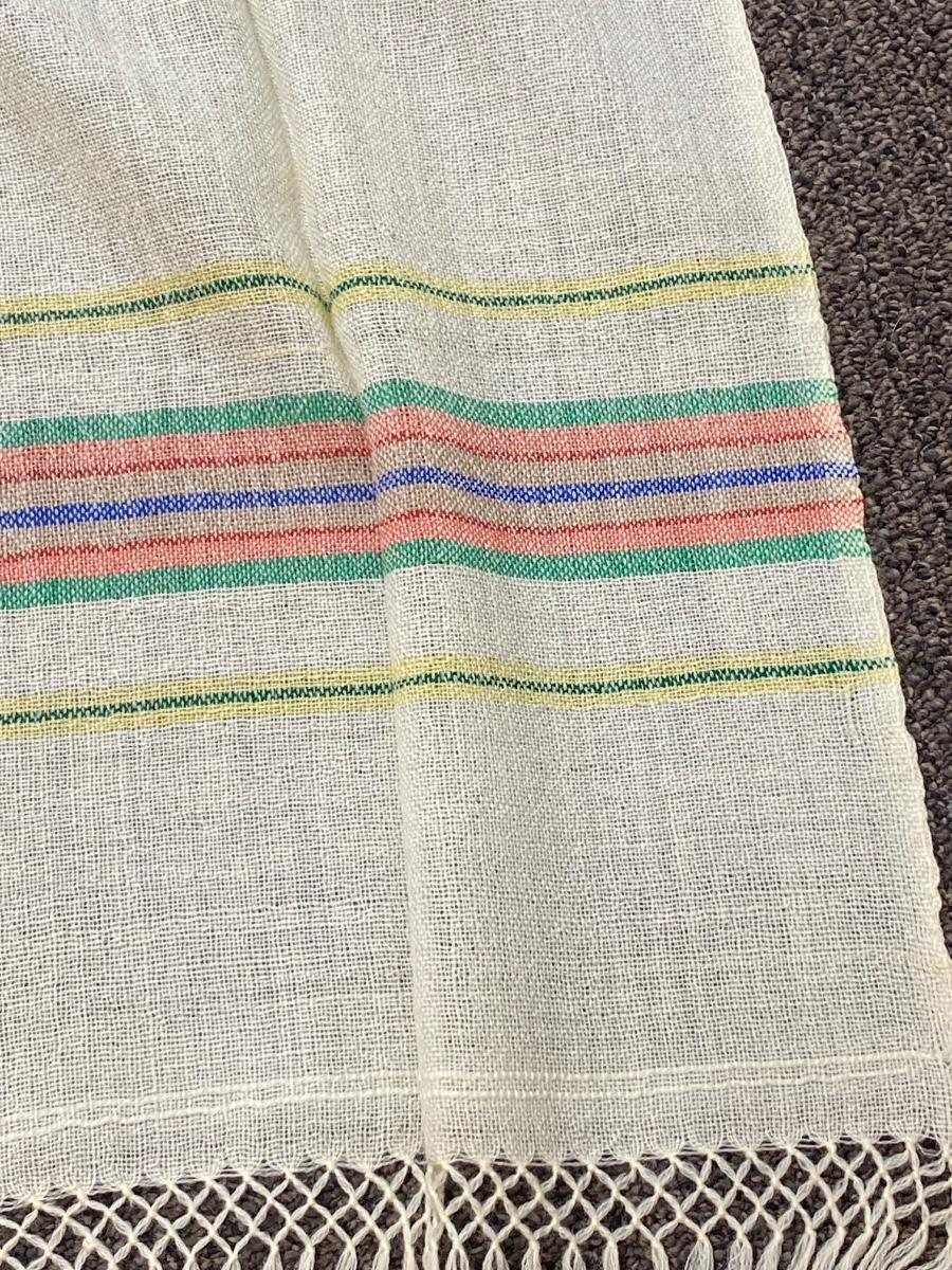 Vintage Lightweight Fringed Edge Striped Table Runner. In vintage condition. No major spots or stains. There is some small moth holes. About 6' length without the fringe.