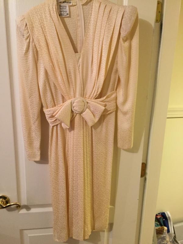 Cream silk dress in allover damask pattern, accented with rouched sash, bow, and buckle at waist. Made by Francesca of Damon for Starlington. Size 4